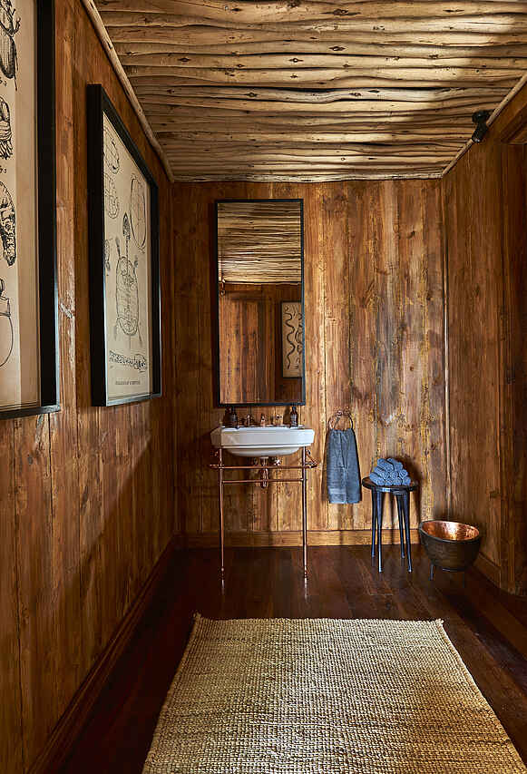 Die Böden sind aus polierten Dielen gefertigt, teilweise mit einfarbigen Teppichen belegt. Der Pool wird von Holzplanken umfasst.