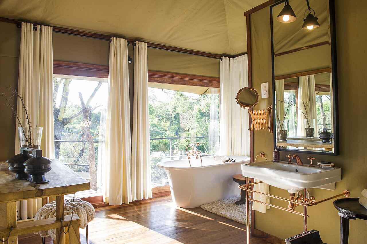 Das reet-gedeckte Hauptgebäude ist zweigeteilt. Im oberen Teil gibt es den Speisesaal und eine Lounge, die Rezeption, sowie im Hintergrund die Küche. Im unteren Teil gibt es den Swimmingpool mit einem überdachten Bereich, in dem Liegestühle stehen. Direkt über der Steilkante zum Fluss hin steht die "Library", die im Wesentlichen eine Lounge ist, aber auch Lesestoff, besonders Referenzmaterial anbietet. Am nordöstlichen Rand des Camps steht das Wellness- und Fitnesscenter. Hinter dem oberen Hauptgebäude gibt es noch einen Souvenirshop. Auch ein Weinkeller ist vorhanden.