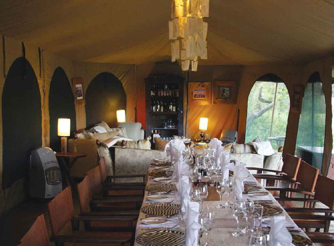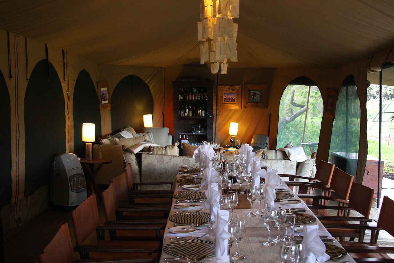 Das Gemeinschaftszelt im Lemala Ngorongoro ist in zwei Bereiche aufgeteilt. Im einen Teil befindet sich eine große Tafel, an der bis zu 16 Gäste gleichzeitig speisen können. Der andere Teil ist für die Lounge vorgesehen. Hier stehen bequeme Sofas um niedrige Kaffeetische herum, den Reetboden bedecken Grasmatten und Perserteppiche. Aus einer kleinen Hausbar können sich die Gäste abends selbst mit Drinks versorgen. Vor dem Gemeinschaftzelt befindet sich eine Feuerstelle, die von einer Gruppe Leinenstühle umringt ist.