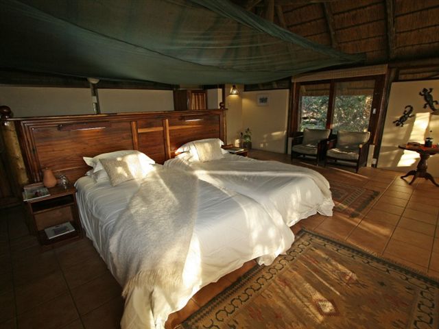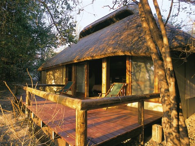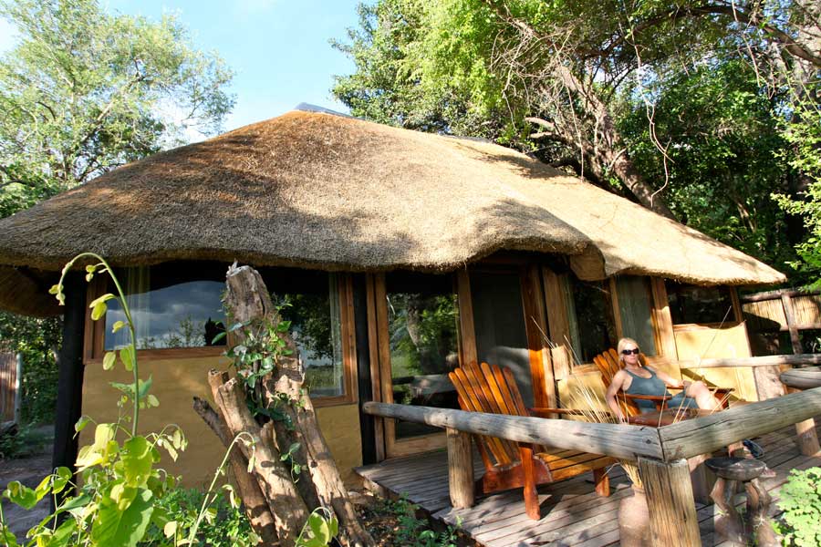 Elf großzügige, reetgedeckte Chalets außerhalb der Aussichtsplattform mit eigener Veranda, dichter Auenwald bietet Schutz und Schatten, für maximal 24 Gäste geeignet, drei Suiten, ein Rollstuhl-gerechtes Zimmer, zwei Doppelzimmer und ein Familienzimmer, Zimmer leicht verwinkelt, individuell eingerichtet, Doppelbetten, Einzelbetten, Nachtische, Nachtischlampen, Stehlampen, dekorative Bilder, gefliest, Fensterscheiben im Busch, Liegen auf der Veranda, überall Petroleumlampen.