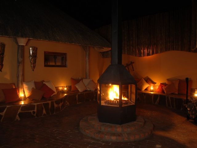 Luftiges reetgedecktes Restaurant von „Kronleuchtern“ erhellt, Lounge, Bar, erhöhtes Holzdeck mit nach unten hinten abgesetzter Feuerstelle unter wilden Feigenbäumen und weitem Blick über die Lagune und grünen Auen, zwei Kamine im inneren gelegen, Bibliothek, Schwimmbad, sehr weitläufig angelegt, abends zahlreiche Petroleumlampen auf dem Außendeck.