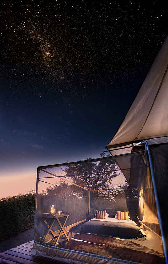 Safari Aficionados fühlen sich im Linyanti Expeditions wohl, die leichte Konstruktion der Zelte und die spezialisierten Guides für Walking-Safaris versprechen intensive Erlebsnisse. Einzigartig in Botswana ist der alternative Schlafbereich unter den Sternen Afrikas, über den jedes Zelt verfügt. Einmalige Natur-Erlebnisse garantiert!