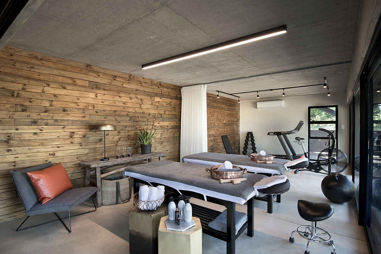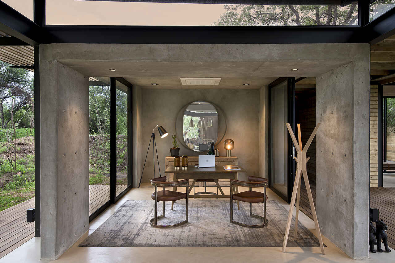 Das Hauptgebäude mit Rezeption liegt an einer hölzernen Aussichtsplattform am Fluss. Hier finden Gäste auch eine Lounge, eine Galerie mit Kunstwerken lokaler Künstler, den Speisesaal, das Africology Spa und einen Trainingsraum sowie eine Boma.