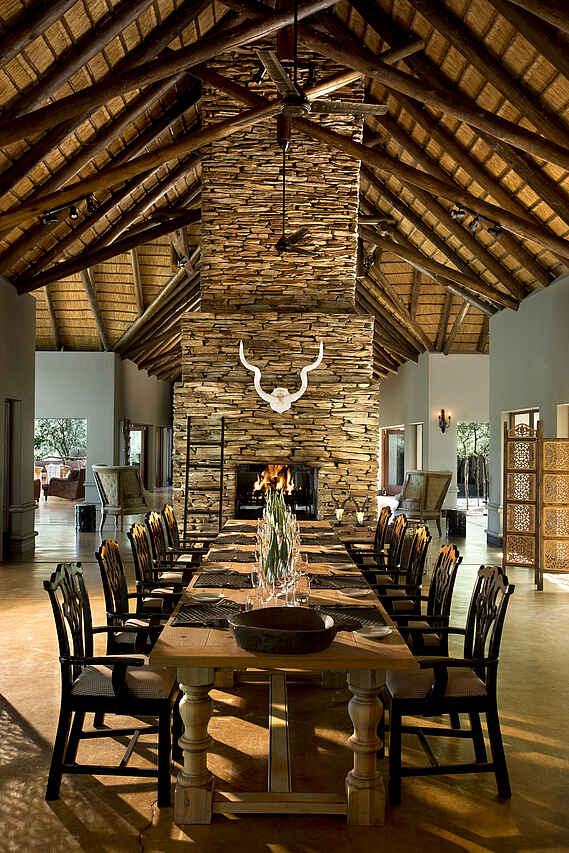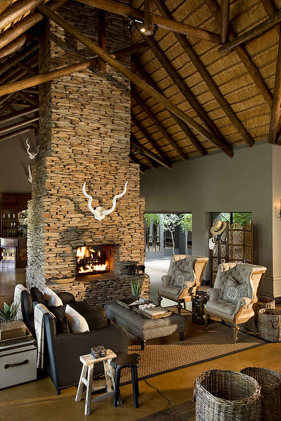 Die Hauptloge mit Rezeption, offenem Kamin und Außenterrasse am Flussufer. Hier können auch die Mahlzeiten eingenommen werden. Zusätzlich liegt ein Pool und eine Boma zwischen den Suiten.