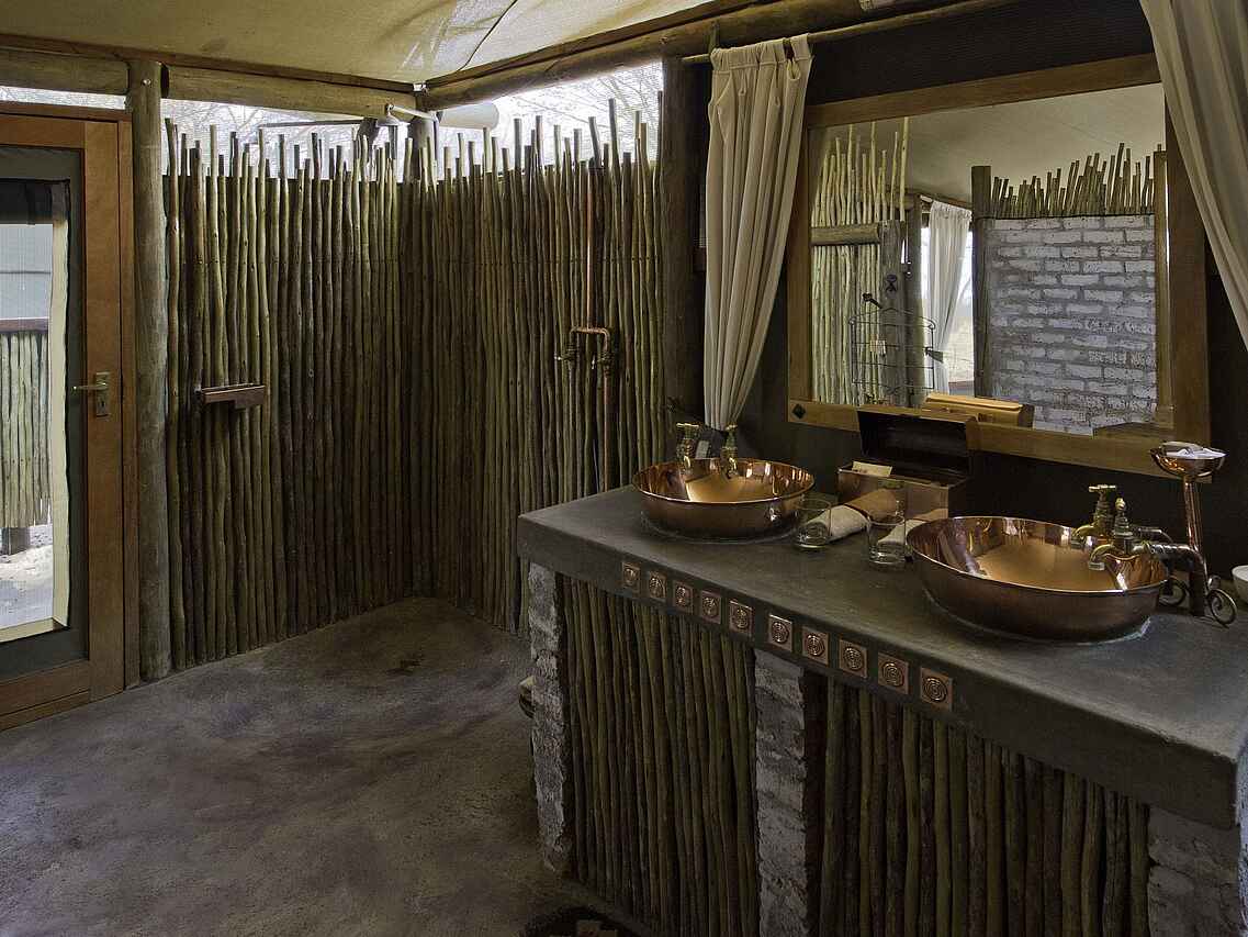 Der Hauptbereich gliedert sich in 2 nach vorne offene, nach hinten gemauerte Zelte, eines mit Lounge und Bar, das andere gegenüber mit einem großen Essbereich. Vor den Hauptzelten befindet sich eine im Boden eingelassene Feuerschale, etwas seitlich versetzt ein von Sandsteinplatten umfasster Plunge Pool mit Liegestühlen. Gäste WC im Zentralbereich.