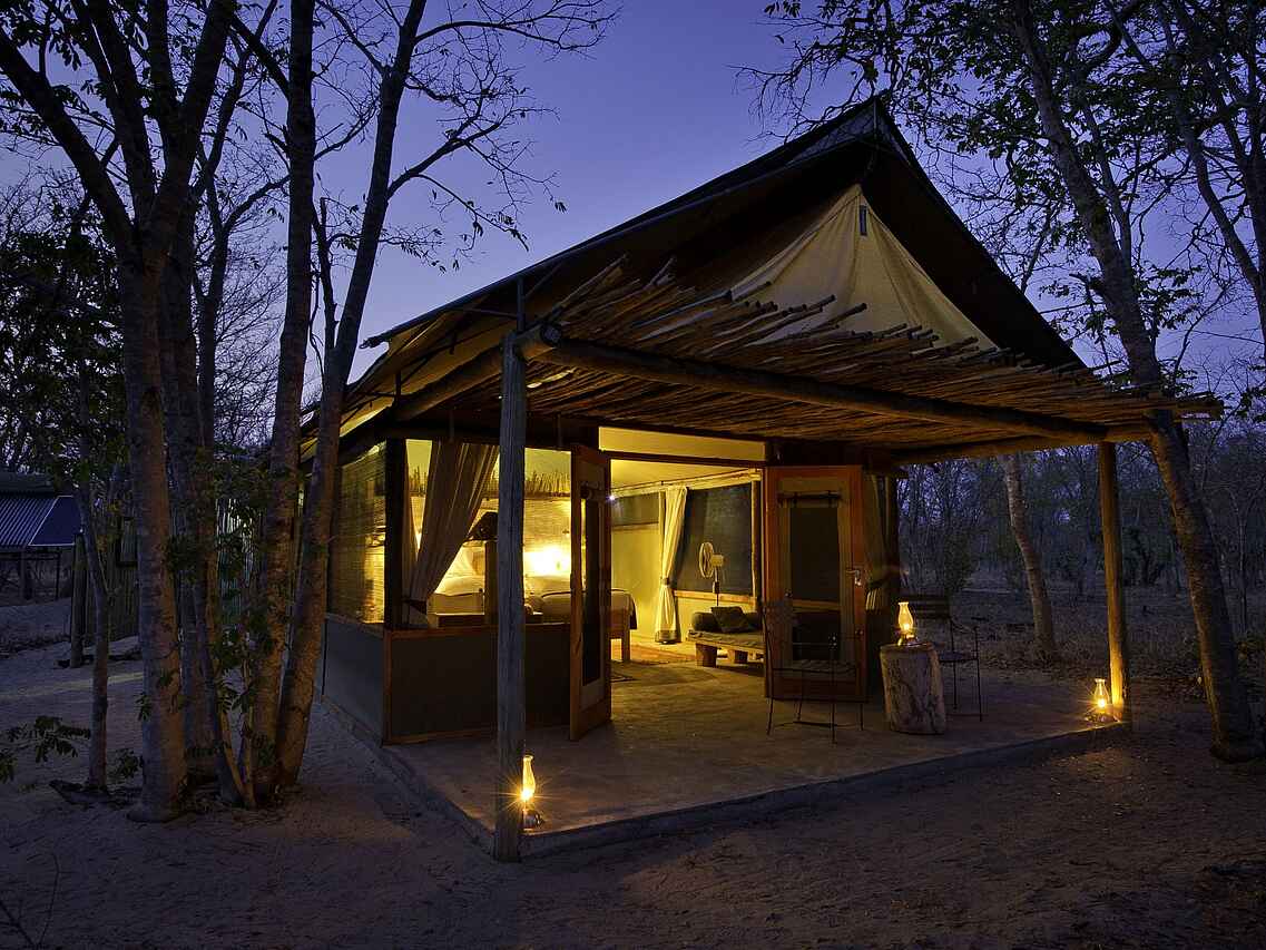 Die 4 regulären Zelte und das Familienzelt des Little Makalolo Camp verteilen sich östlich der Hauptgebäude entlang des Waldrandes unter den Bäumen. Sie sind ebenerdig errichtet und orientieren sich hinaus zum Wasserloch. Jedes Zelt verfügt über ein Doppelbett, einen kleinen Tisch mit Stuhl und ein offenes Regal. Hinter der halbhohen Mauer am Kopfende des Bettes ist das Bad mit 2 Kupferwaschbecken, einer Dusche, WC, sowie fließend Kalt- und Warmwasser. Durch eine Tür gelangt man hinaus zur Außendusche. Das Familienzelt besteht aus 2 Zelten für jeweils 2 Personen. Die 4 Gäste teilen sich ein Bad. Das Honeymoonzelt mit Außenbad liegt westlich für sich allein.
