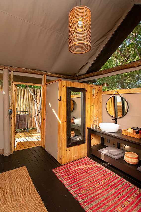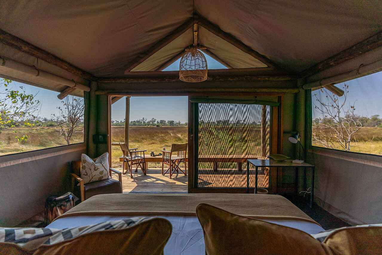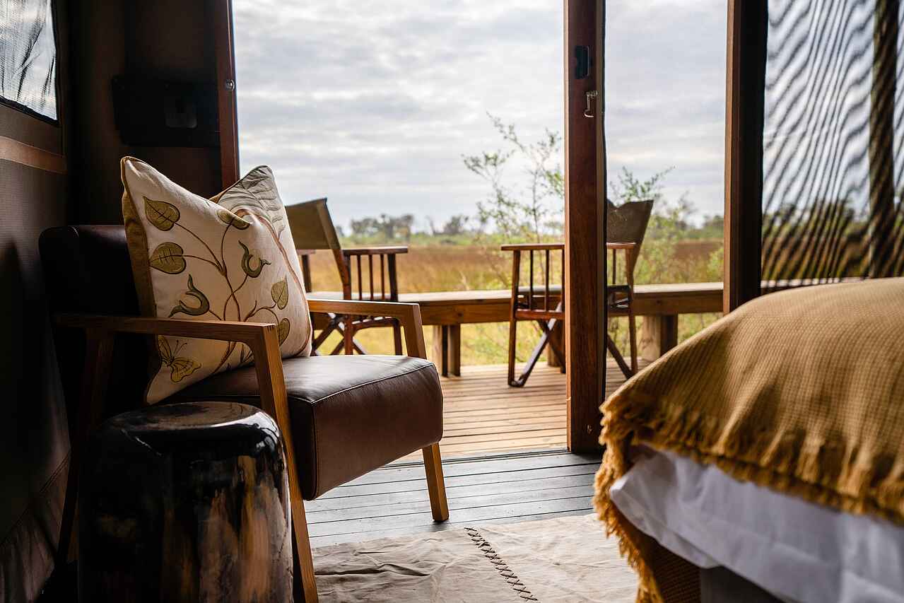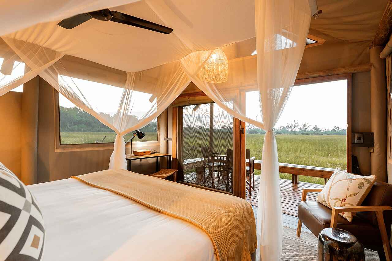 Little Sable verfügt über acht Zeltsuiten, die jeweils auf erhöhten Decks stehen und einen wunderschönen Blick über die Ebene bieten. Jedes Zelt verfügt über eine private Veranda mit Tisch und Stühlen. Im Inneren finden sich entweder ein Doppelbett oder zwei Einzelbetten mit Moskitonetzen, ein Deckenventilator, ein Schreibtisch und ein eigenes Badezimmer mit einer Spültoilette, zwei Waschbecken sowie einer Innen- und Außendusche. Die Einrichtung ist frisch, leicht und passt wunderbar zur Umgebung. Es gibt Lademöglichkeiten für elektronische Geräte.