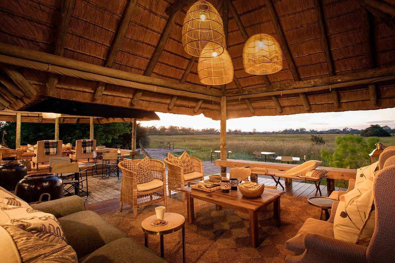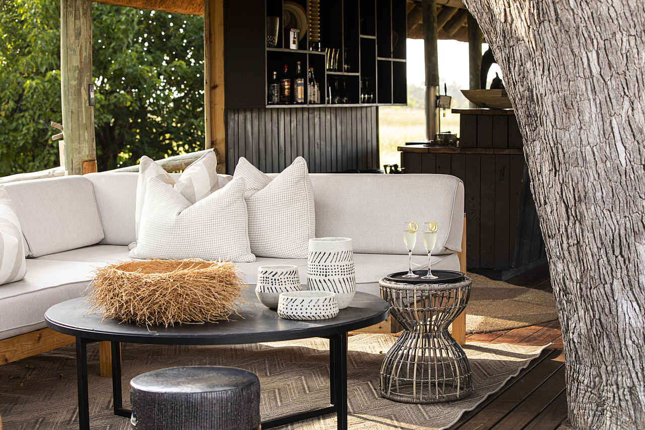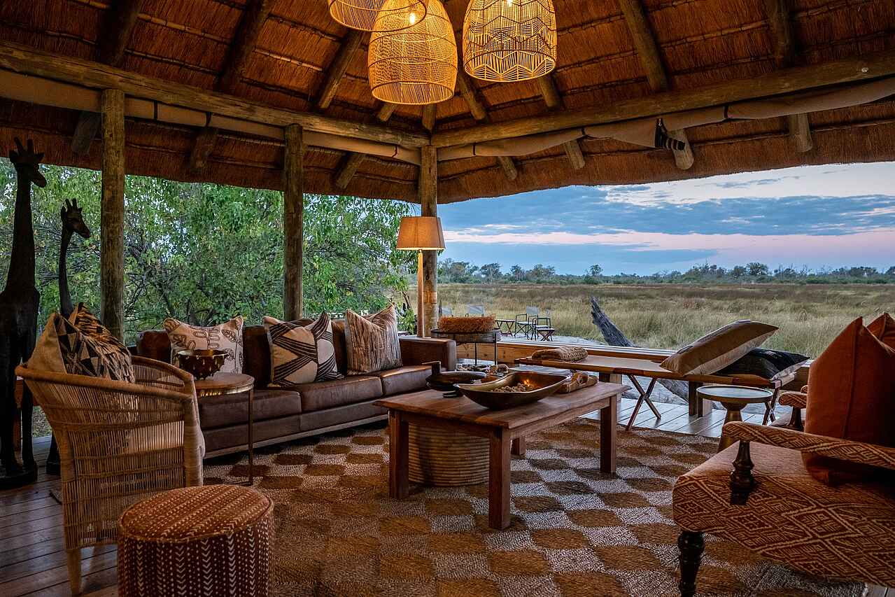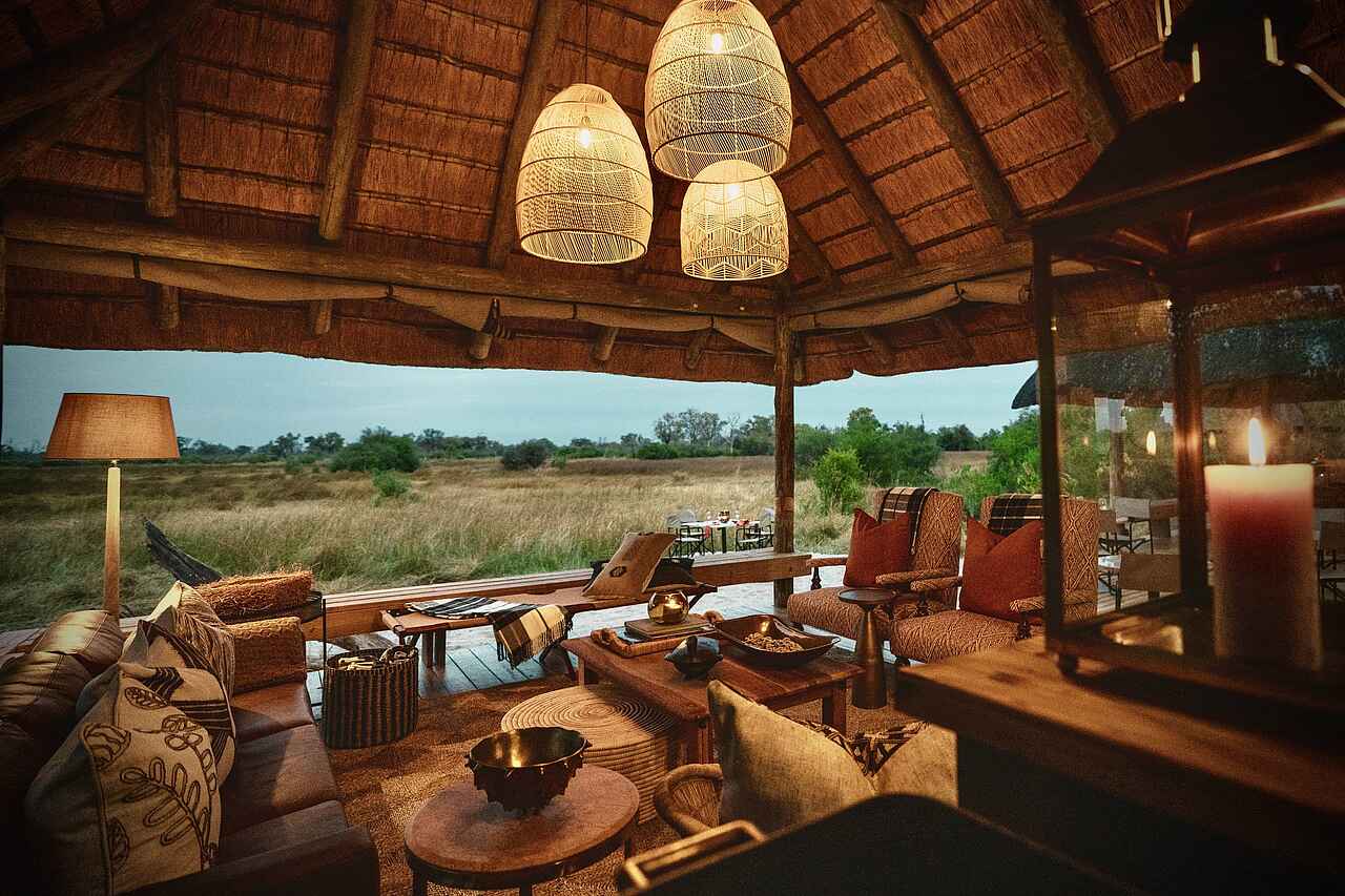 Der Gemeinschaftsbereich im Little Sable ist in einem schönen Holz- und Strohblockhaus untergebracht, das erhöht auf einer Plattform steht. Das Herzstück bilden die Boma (eine traditionelle Feuerstelle) und die gemütliche Lounge, mit Sitzgelegenheiten auf beiden Seiten des Eingangs. Ein paar Stufen führen in das Gebäude, dort befindet sich die gut ausgestattete Bar und ein gemütlicher Essbereich.