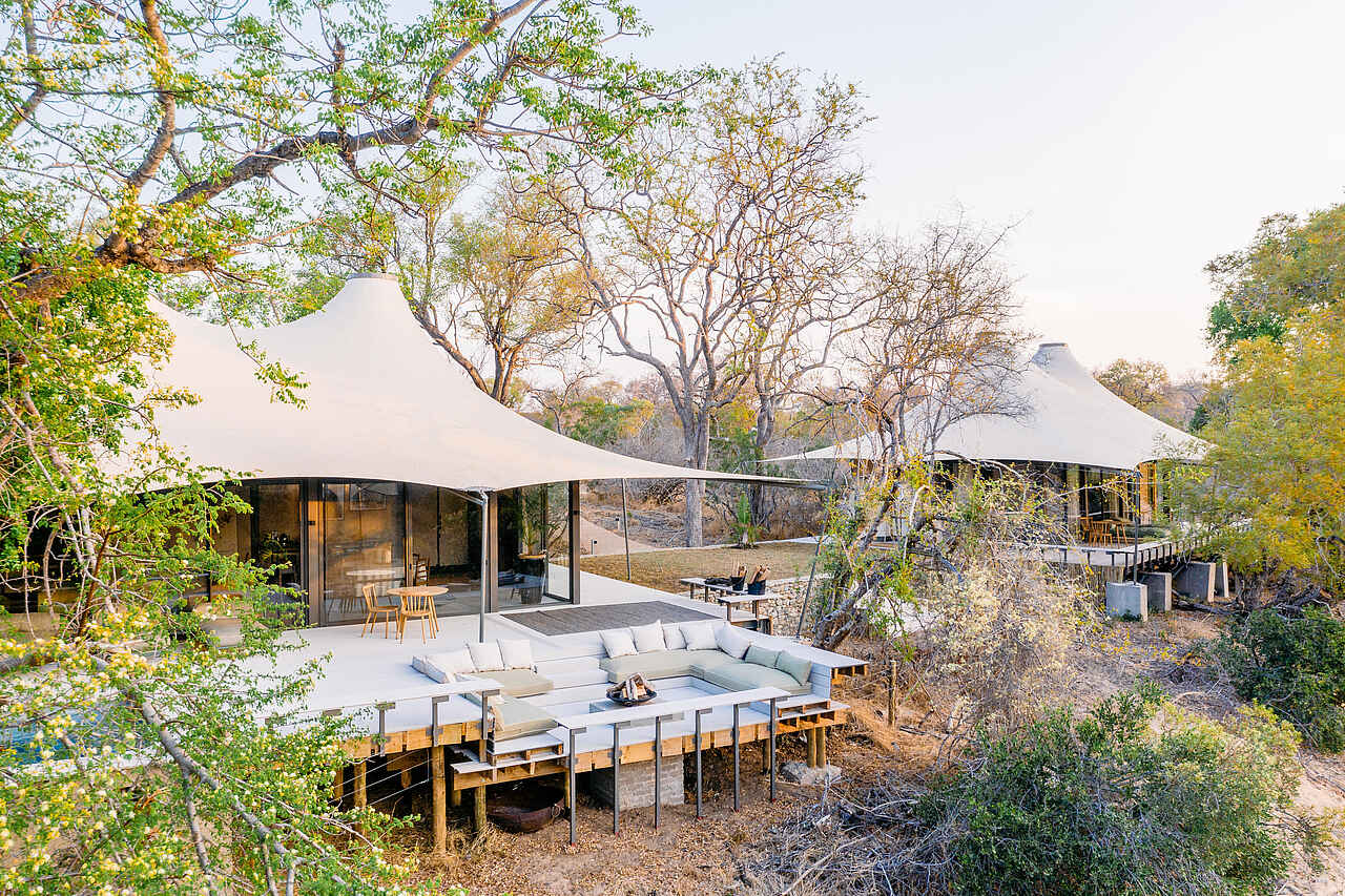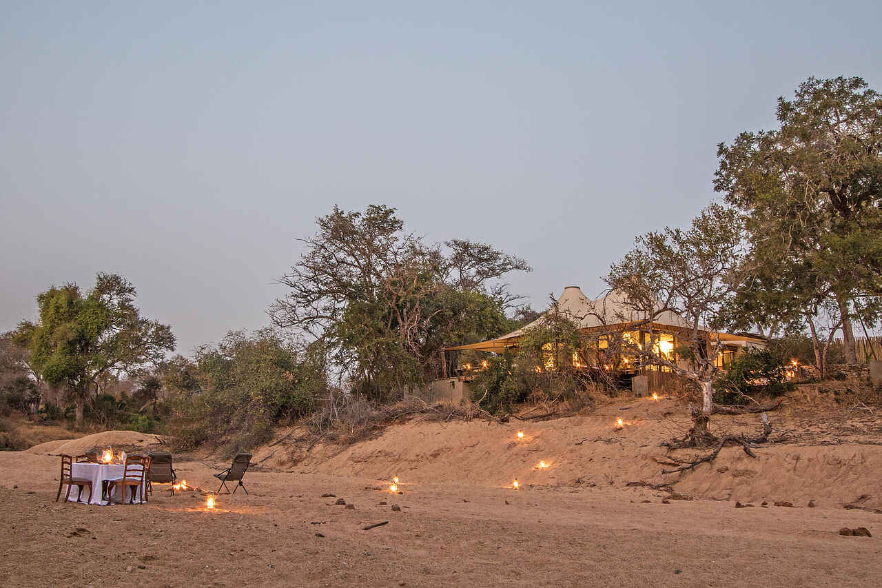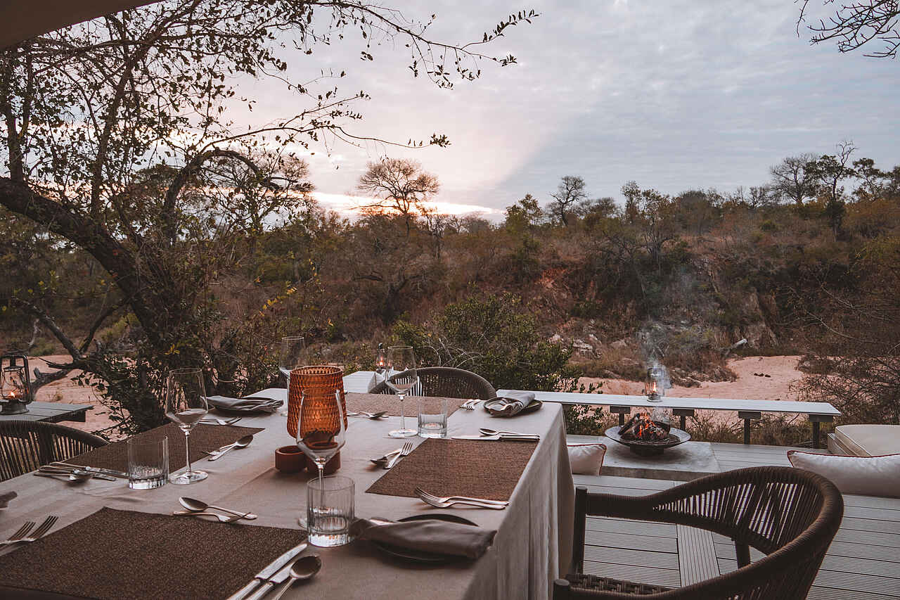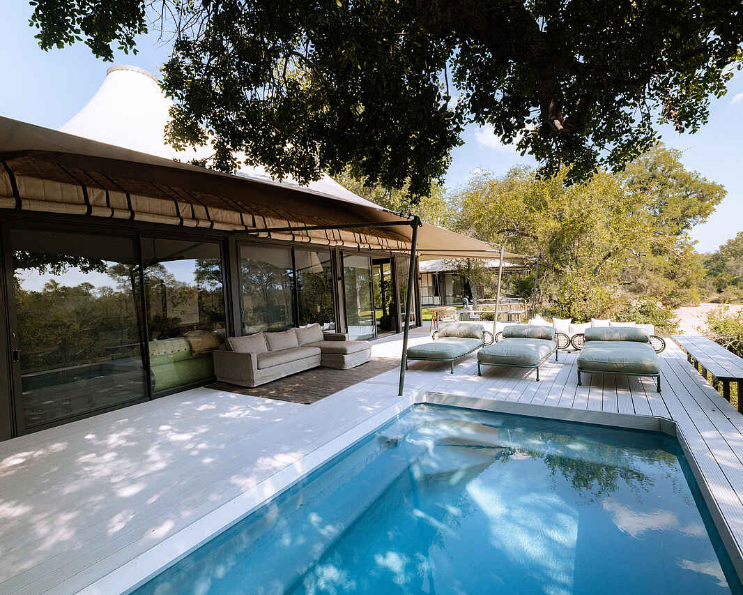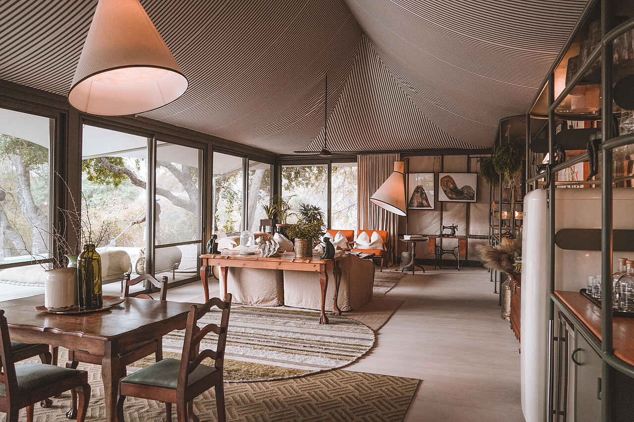 Das offen gestaltete Hauptgebäude liegt direkt am saisonalen Monwana-Flussbett und umfasst einen großzügigen Wohn- und Essbereich mit hohen Decken, natürlichen Materialien und warmen Farbtönen. Die weitläufige Terrasse lädt mit komfortablen Sitzmöbeln, eigenem Pool und Blick in den Busch zum Entspannen ein. Ein persönlicher Butler steht rund um die Uhr zur Verfügung und kümmert sich um alle Wünsche, vom morgendlichen Kaffee bis zum Sundowner. Zudem gibt es einen Spa-Service auf Anfrage, WLAN, Mobilfunkempfang und eine stimmungsvolle Feuerstelle. Bush-Dinner und Frühstücke im Freien können nach Wunsch arrangiert werden - ideal für ungestörte Naturmomente.