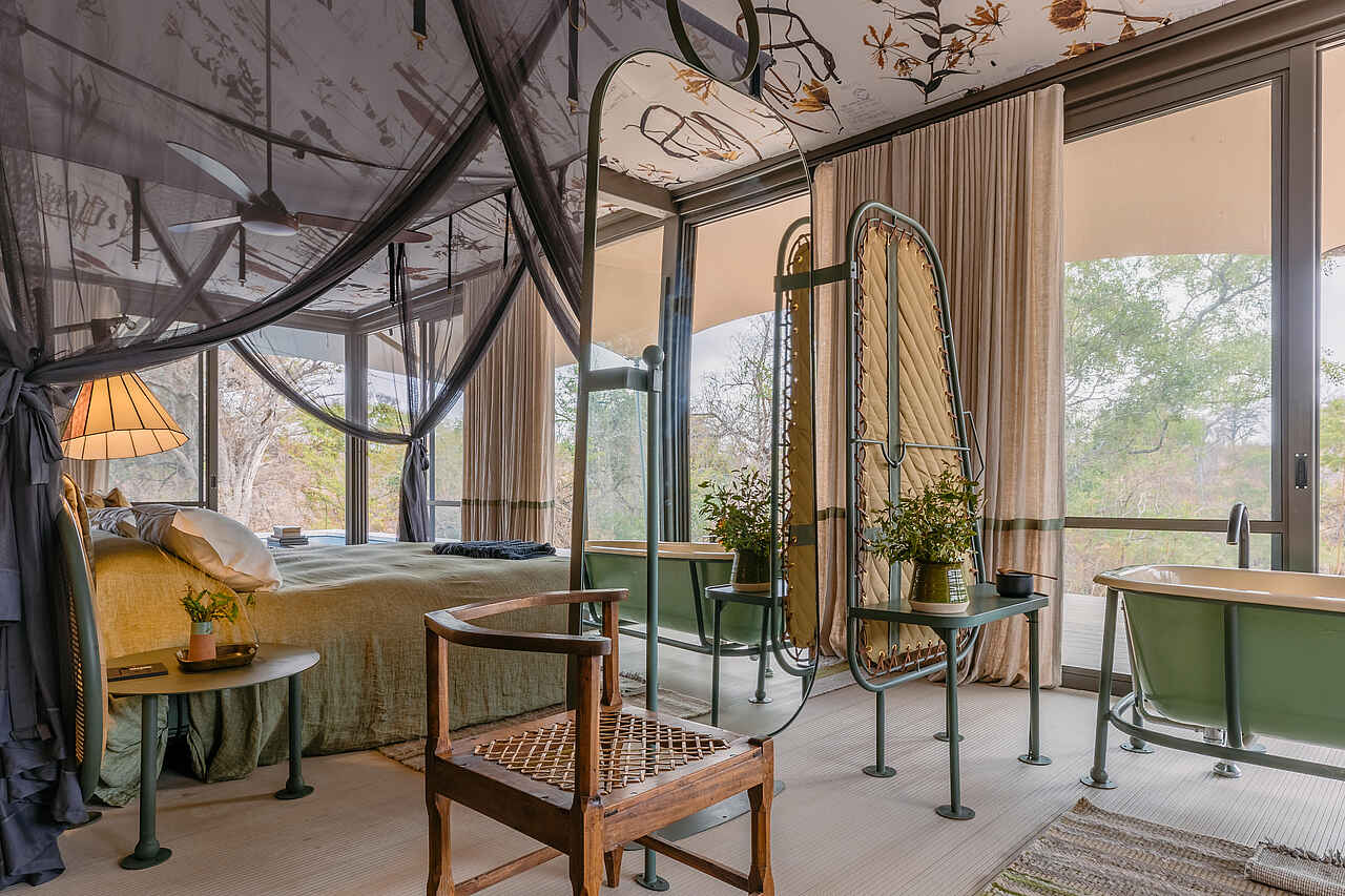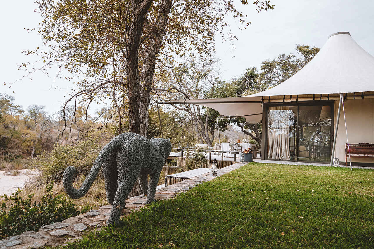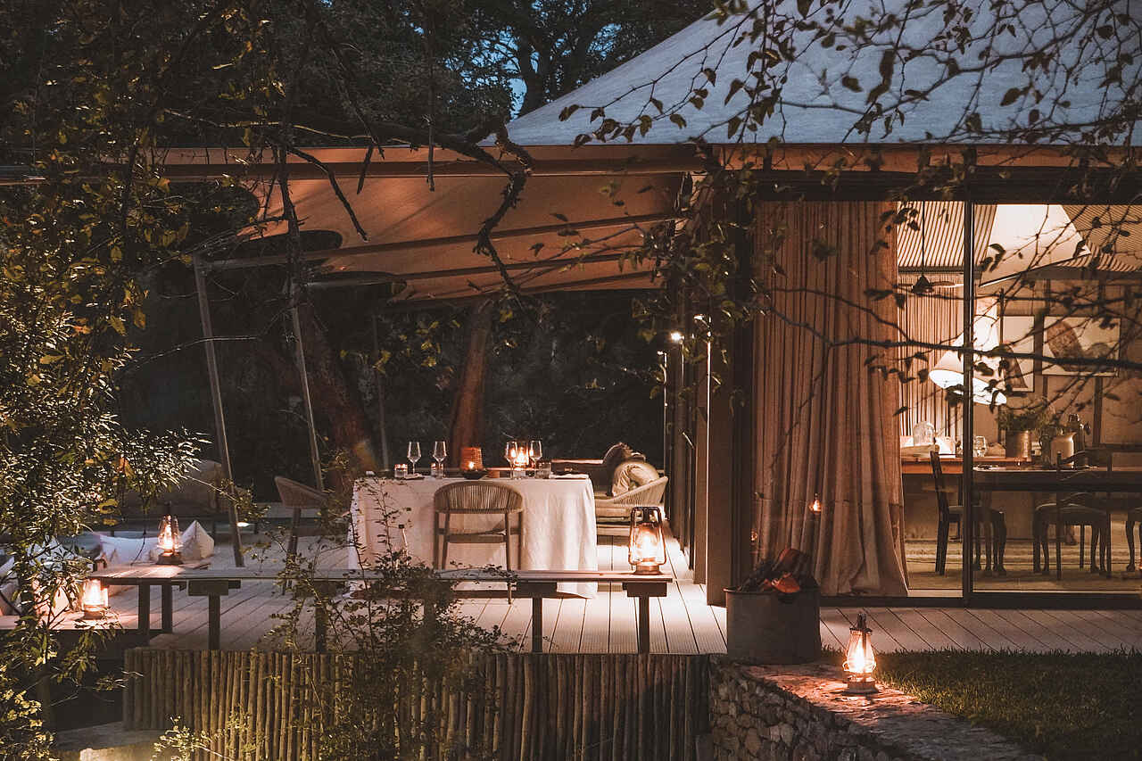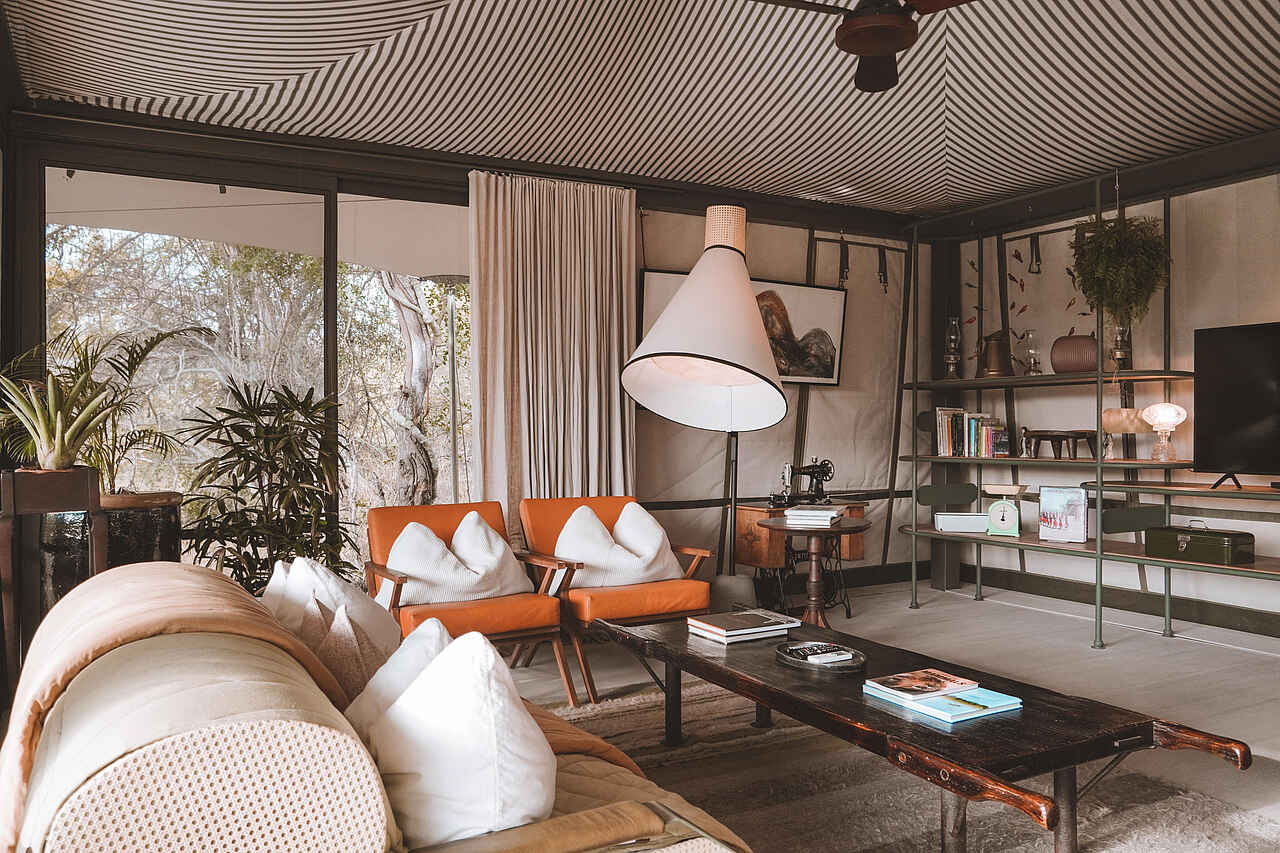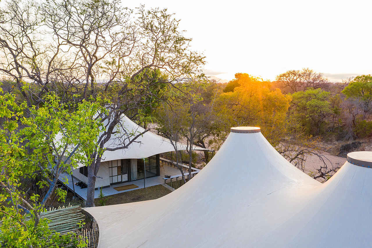 Das offen gestaltete Hauptgebäude liegt direkt am saisonalen Monwana-Flussbett und umfasst einen großzügigen Wohn- und Essbereich mit hohen Decken, natürlichen Materialien und warmen Farbtönen. Die weitläufige Terrasse lädt mit komfortablen Sitzmöbeln, eigenem Pool und Blick in den Busch zum Entspannen ein. Ein persönlicher Butler steht rund um die Uhr zur Verfügung und kümmert sich um alle Wünsche, vom morgendlichen Kaffee bis zum Sundowner. Zudem gibt es einen Spa-Service auf Anfrage, WLAN, Mobilfunkempfang und eine stimmungsvolle Feuerstelle. Bush-Dinner und Frühstücke im Freien können nach Wunsch arrangiert werden - ideal für ungestörte Naturmomente.