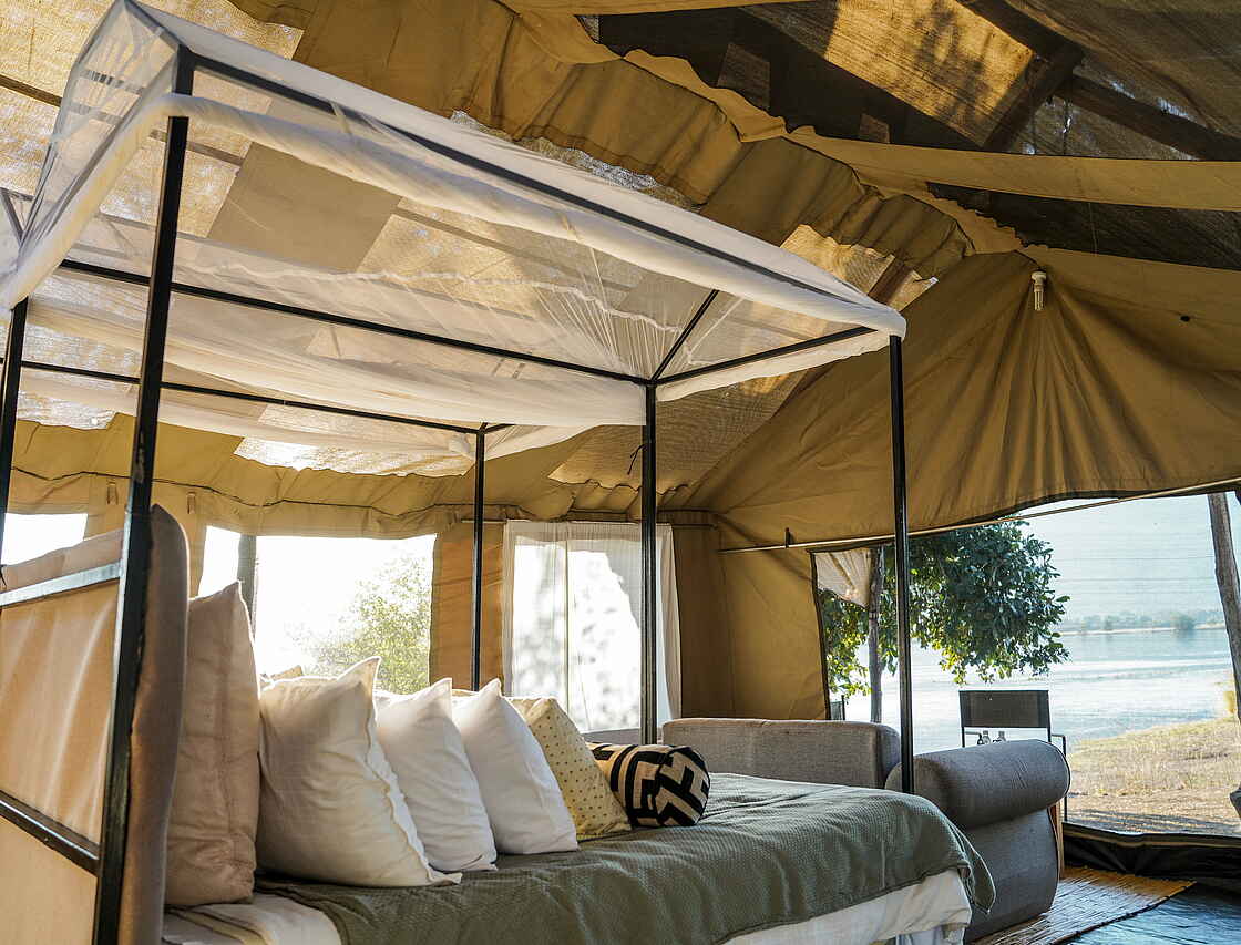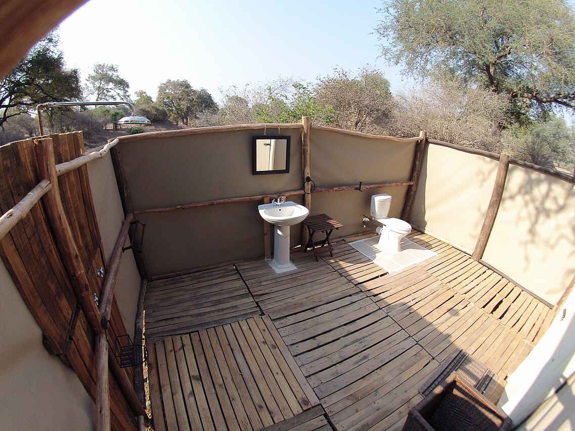 Die drei Gästezelte bieten auf jeweils 30qm ein ordentliches Doppelbett mit Moskitonetz, ein kleines Sofa, Regiesessel unter einem Zeltvordach und nach hinten unter freiem Himmel ein privates bad mit Dusche, Waschbecken und WC. Der Zeltboden ist mit einfachen Teppichen ausgelegt. Alle zelte haben Blick aud den Sambesi und seine Schwemmebenen.