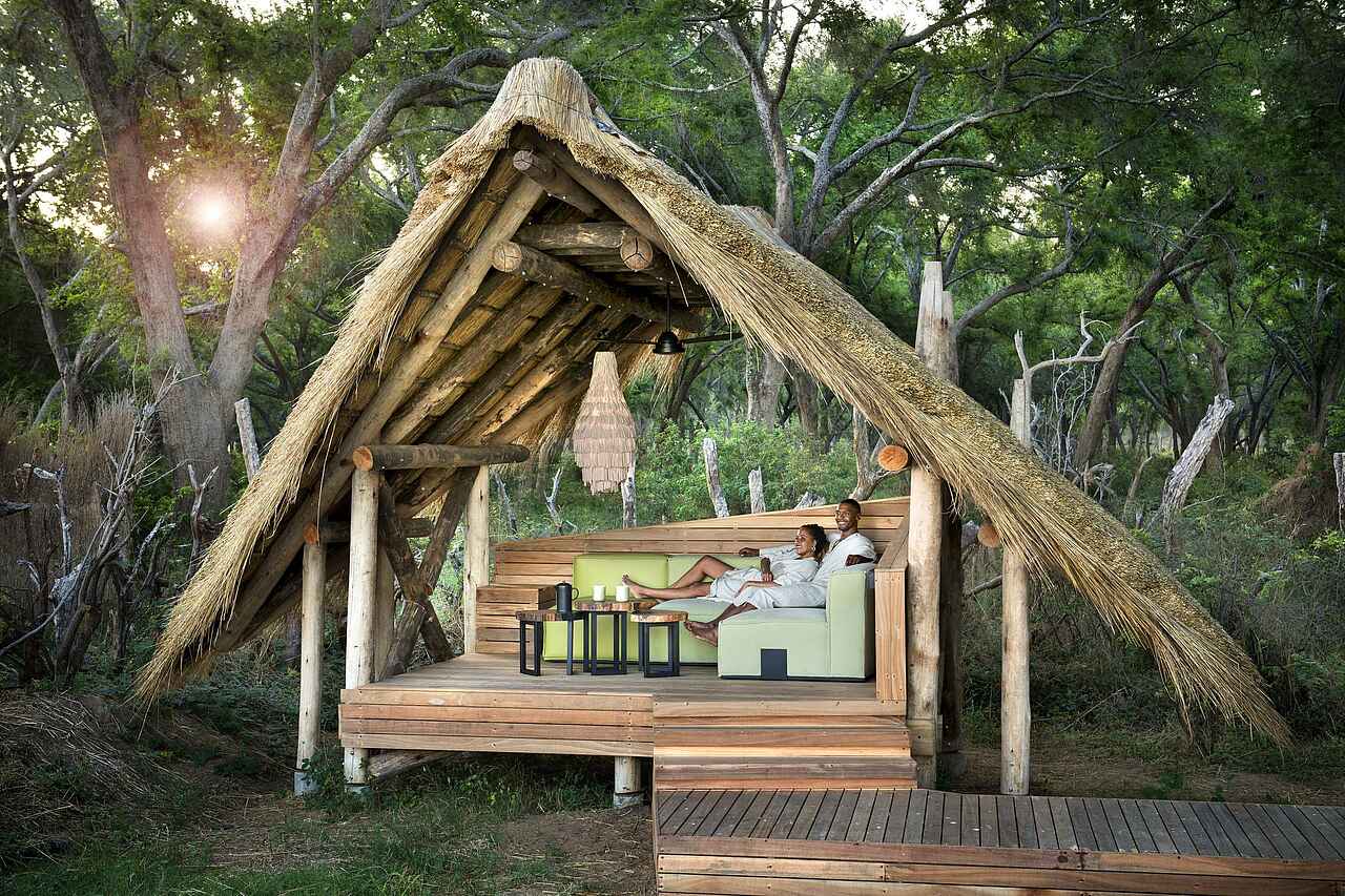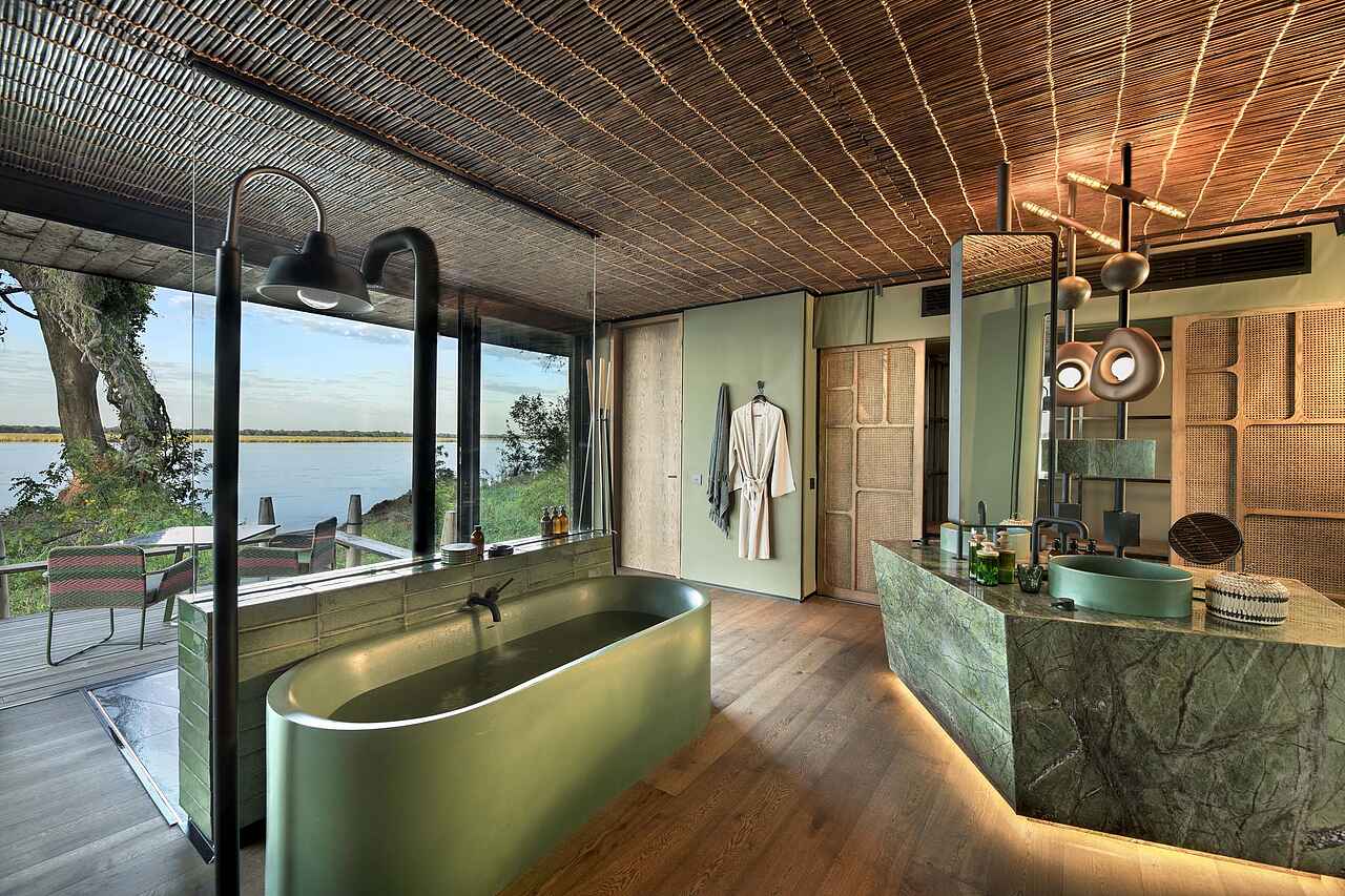 In Lolebezi ist maximal Platz für 16 Gäste, für die 4 Signature-Suiten à zwei Personen und 2 Familiensuiten à 4 Personen zur Verfügung stehen. Die stilvollen und klimatisierten Suiten sind 85 Quadratmeter groß mit einer fast ebenso großen Veranda mit Liegen und eigenem Plunge Pool. Ein Sprung ins private Tauchbecken sorgt für herrliche Erfrischung. Zusätzlich verfügen die Einheiten über eine sogenannte Sala, einen offenen und überdachten Aufenthaltsplatz mit bester Aussicht. Die Suiten spiegeln mit den Farben der schlicht-eleganten Inneneinrichtung in Grau-, Braun- und Beigetönen die Farben der Wildnis wider. Auffälliges Lampendesign über dem großen Bett!