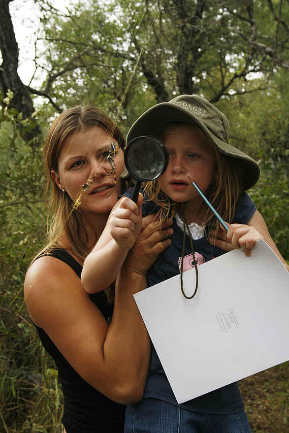 Kinder ab 6 Jahren willkommen, Kinderbetreuung wird angeboten, Camp nicht umzäunt. Teilnahme an Pirschfahrten ab 6 Jahren, zu einem privaten Fahrzeug wird geraten, um die Fahrtdauer an die Aufmerksamkeitsspanne der Kinder anzupassen.