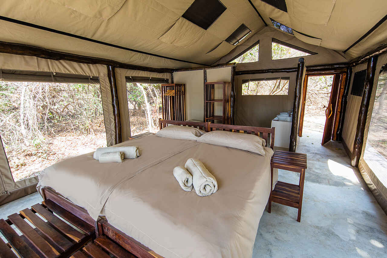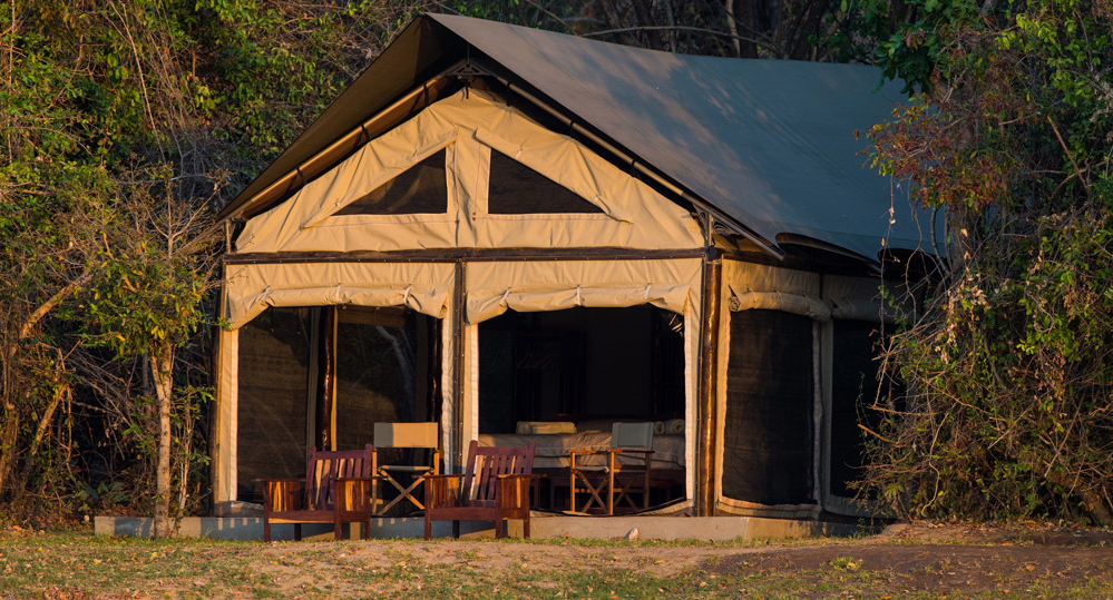 Südlicher der Zentralen Einrichtungen stehen vier einzelne und durch Bewuchs getrennte typisch rechteckige en-suite Wohnzelte mit Satteldach - sog. 'Meru'-Zelte. Sie befinden sich in ca. 10 Metern Entfernung zur ca. 4 Meter hohen Uferböschung des Luangwa Rivers an der Waldkante. Blickrichtung der offenen, zweigeteilten Zeltfassade ist der Fluss und die darin befindliche Herde Flusspferde. Die Seitenwände sind hochgerollt, und lassen mehr Licht ein. Vor dem Zelt stehen zwei solide Lehnstühle aus Holz. Zwischen Zeltfassade und Bett sind liegen ca. 1,5 Meter, mit weitern zwei Lehnstühlen aus Segeltuch. Im Zelt befindlich ist ein großes Doppelbett - Queensize oder Kingsize - mit einer kleinen Sitzbank- oder Truhe am Fußende. Rechts und links sind ca. 120 cm Platz. Vom Kopfende zur Badnische sind ca. 100 cm Platz, zur rückwärtigen Tür ca. 2,5 Meter. Vor der Badnische stehen zwei hohe Regale für Kleidung. Die Badnische misst ca. 3x1,2 Meter mit zwei Waschbecken und den Toiletten. Versorgung mit 240 V in den Zelten in Abhängigkeit von der täglichen Sonneneinstrahlung und dem Ladestand der Batterien des Camps. Die Ladung von Laptops und kleinen Akkus ist möglich, das Mitführen von Batterien wird empfohlen. Kein WiFi oder Mobilfunkempfang im Camp.