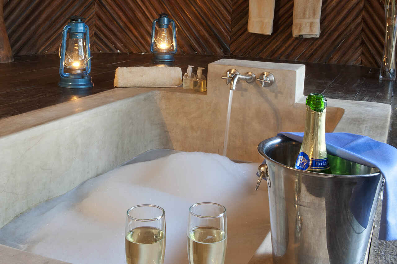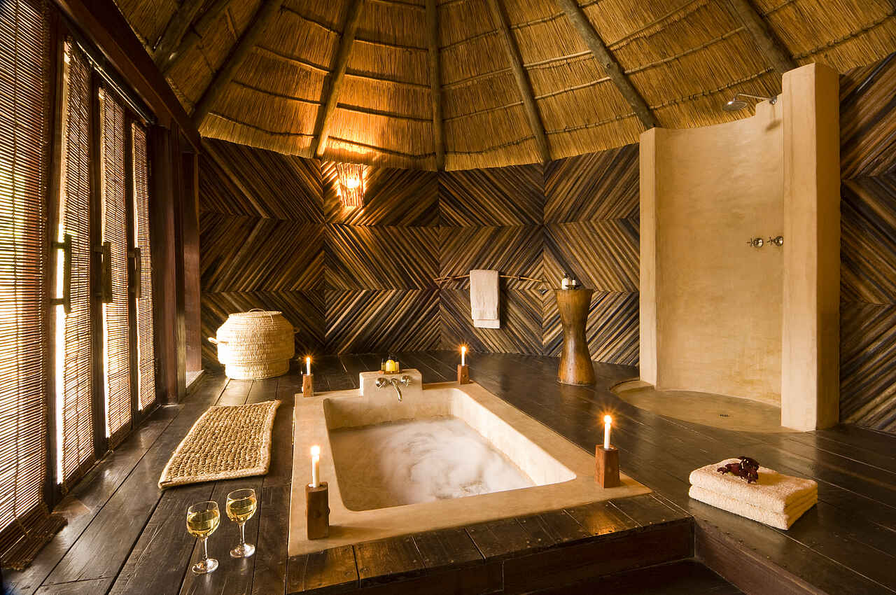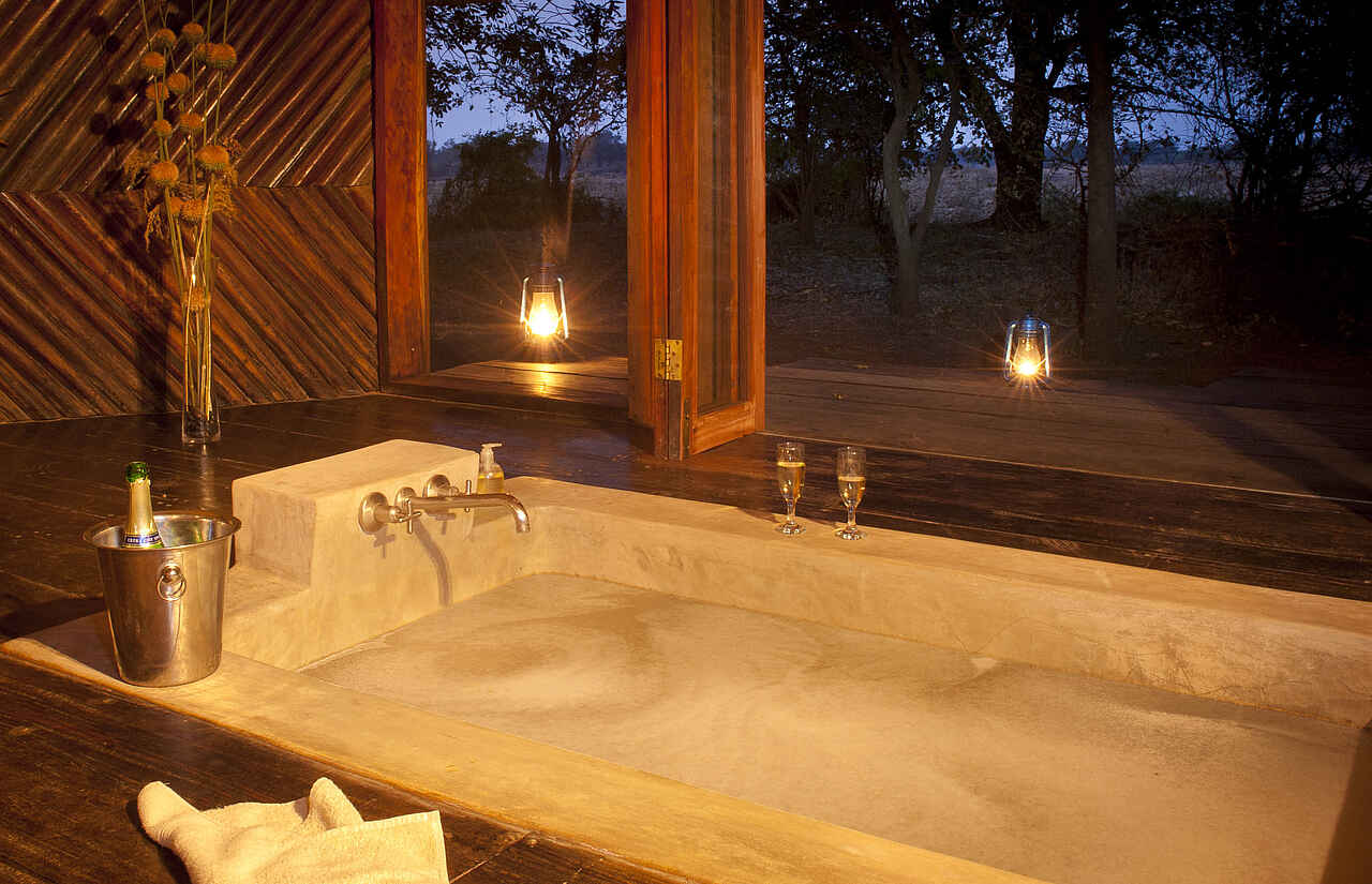 5 Bush-Suiten, alle individuell eingerichtet. Zugang zur Terrasse von der Suite selbst und vom Badezimmer. Große Moskitonetze über den Betten, Deckenventilatoren im Schlafzimmer und im Bad. Stromversorgung mit 240V. Ausreichend Regalplatz, kleiner Schreibtisch mit Stuhl. Auf Wunsch mit Doppelbett oder zwei Einzelbetten. Jede Suite mit privaten Bad, zwei Waschbecken, großer Badewanne, Dusche, WC fließend Kalt- und Warmwasser.