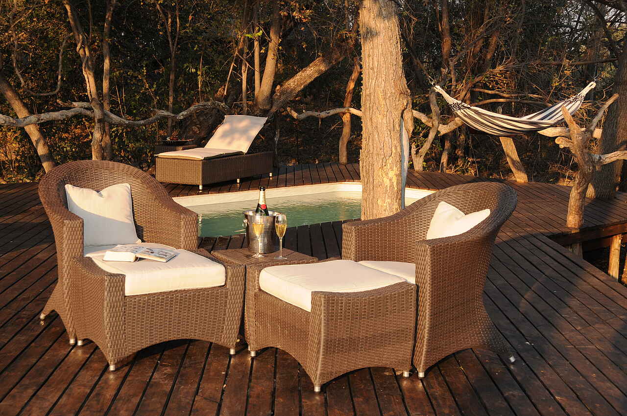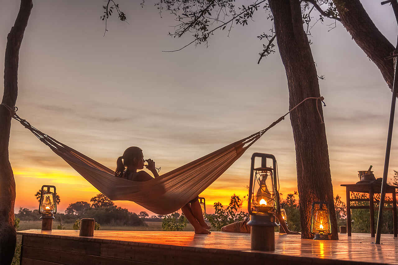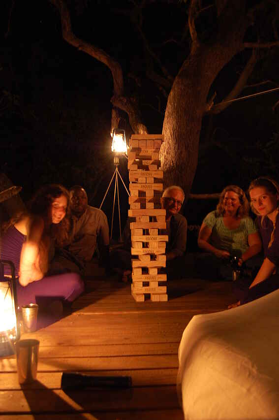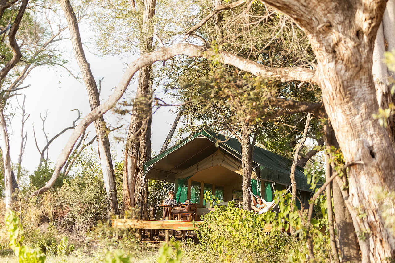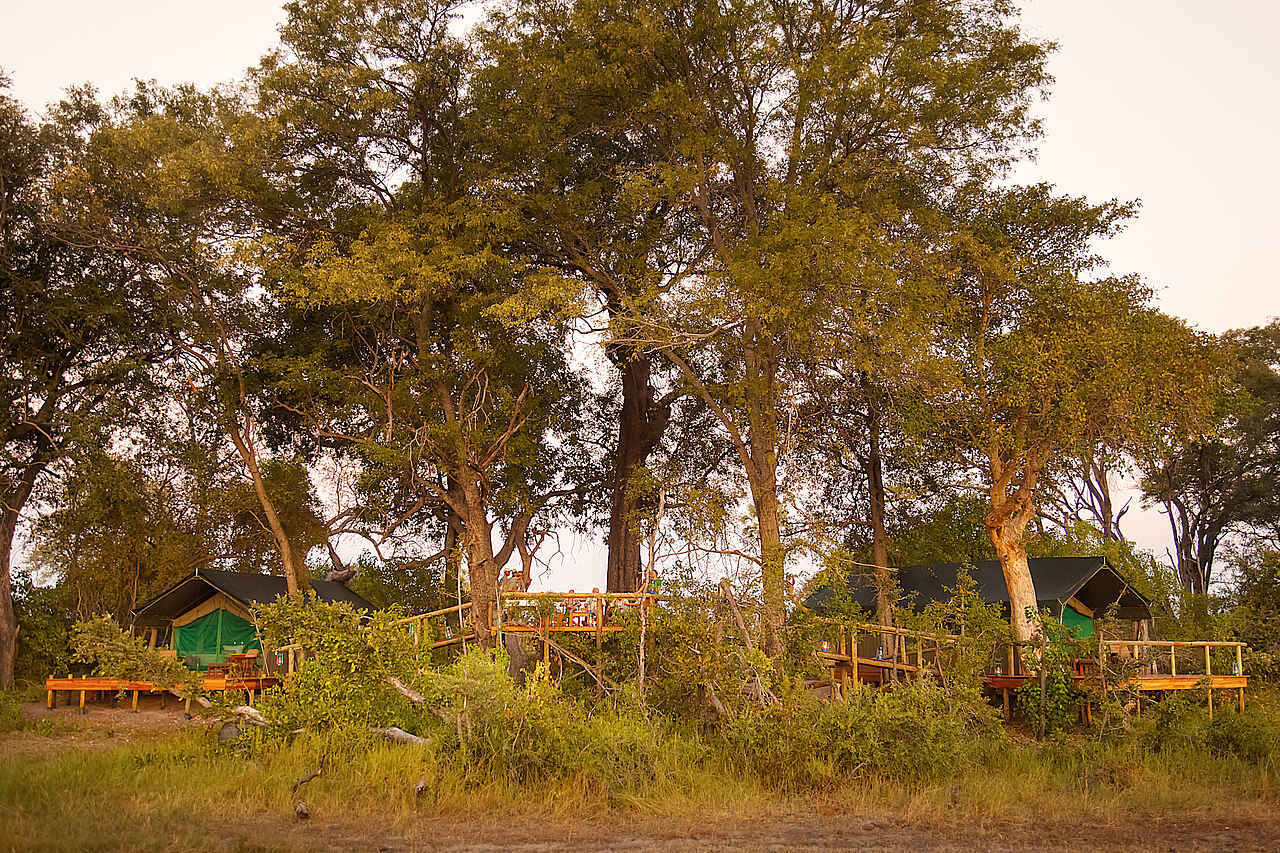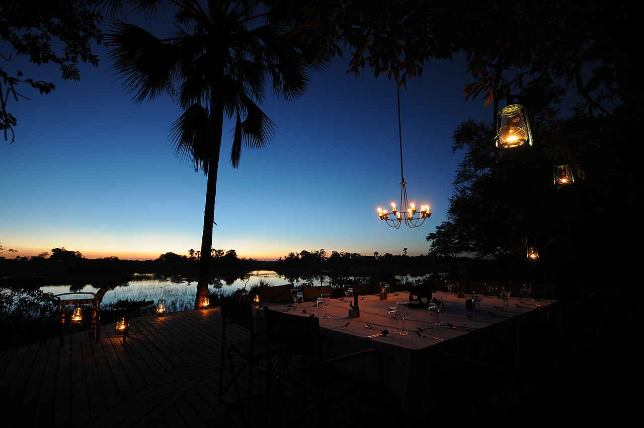 Ein großes Speisezelt, das neben den Esstischen mit einer kleinen Bibliothek und einer stilvollen Lounge-Ecke mit Ledersofas ausgestattet ist. Ein Generator, der einige Stunden pro Tag Strom erzeugt, kann zum Aufladen von Geräten/Akkus benutzt werden. In nächster Nähe befinden sich ein kleiner Pool mit Sonnendeck, Liege- und Korbstühlen, Hängematten, sowie eine Feuerstelle (Boma), ein Pizzaofen und eine Bar. Der Stall für die Safari-Pferde befindet sich ebenfalls auf dem Gelände, ein campeigener Souvenir-Shop ist auch vorhanden. Außerdem: Ein großes Holzplateau in einer Baumkrone, auf dem zu Abend gegessen und übernachtet werden kann. Ganzjährig geöffnet.