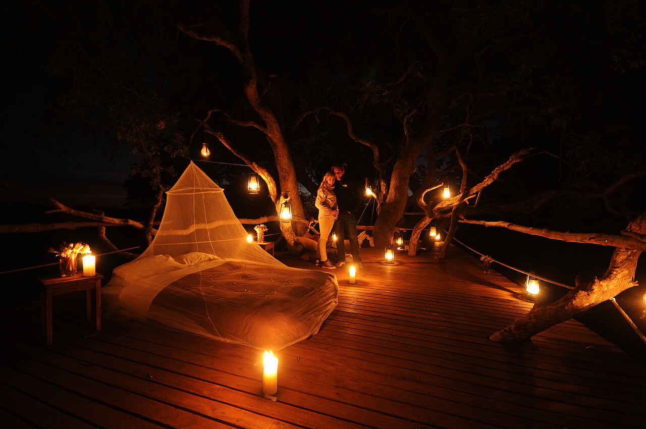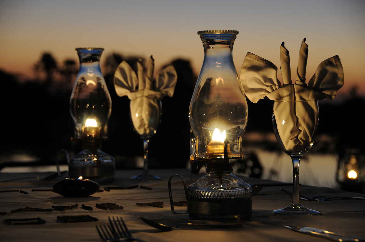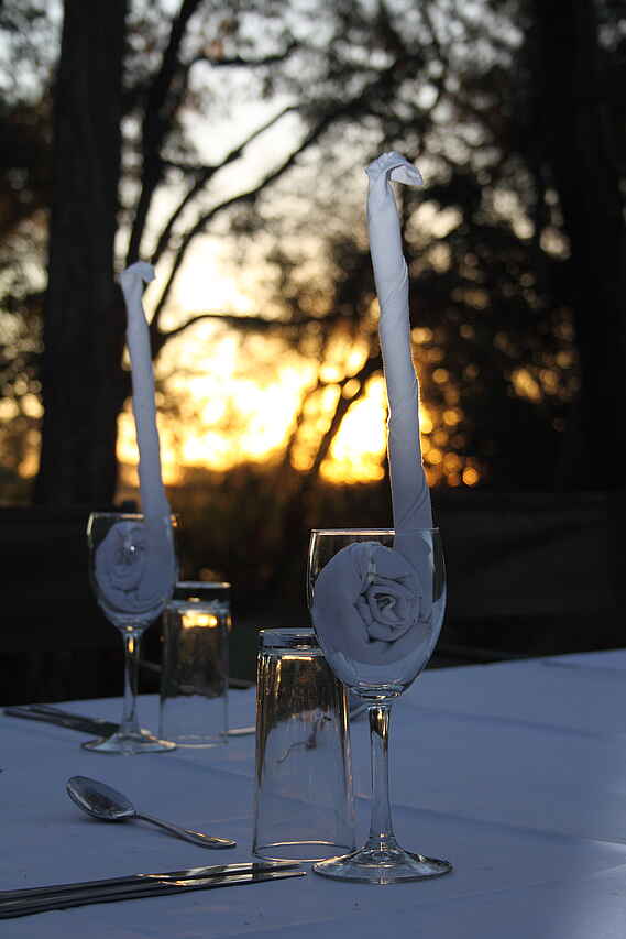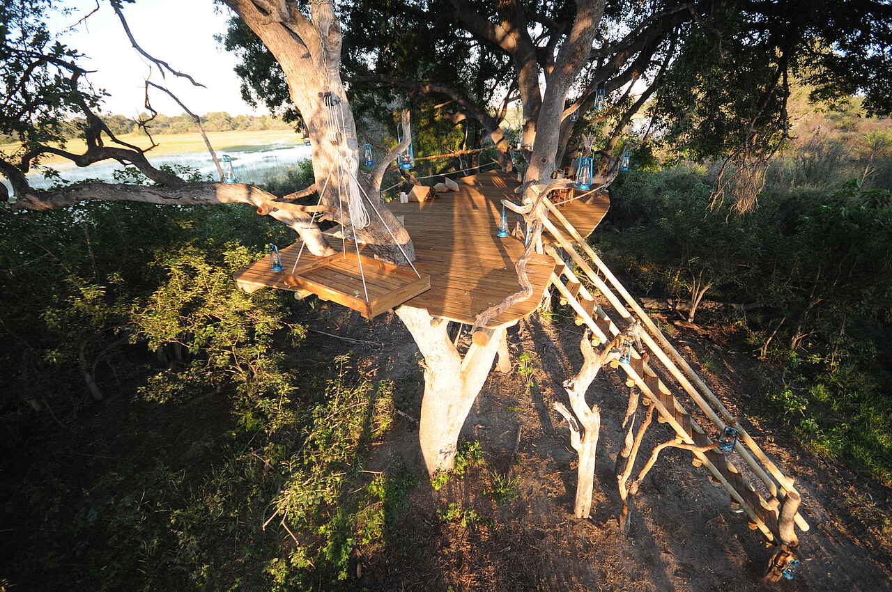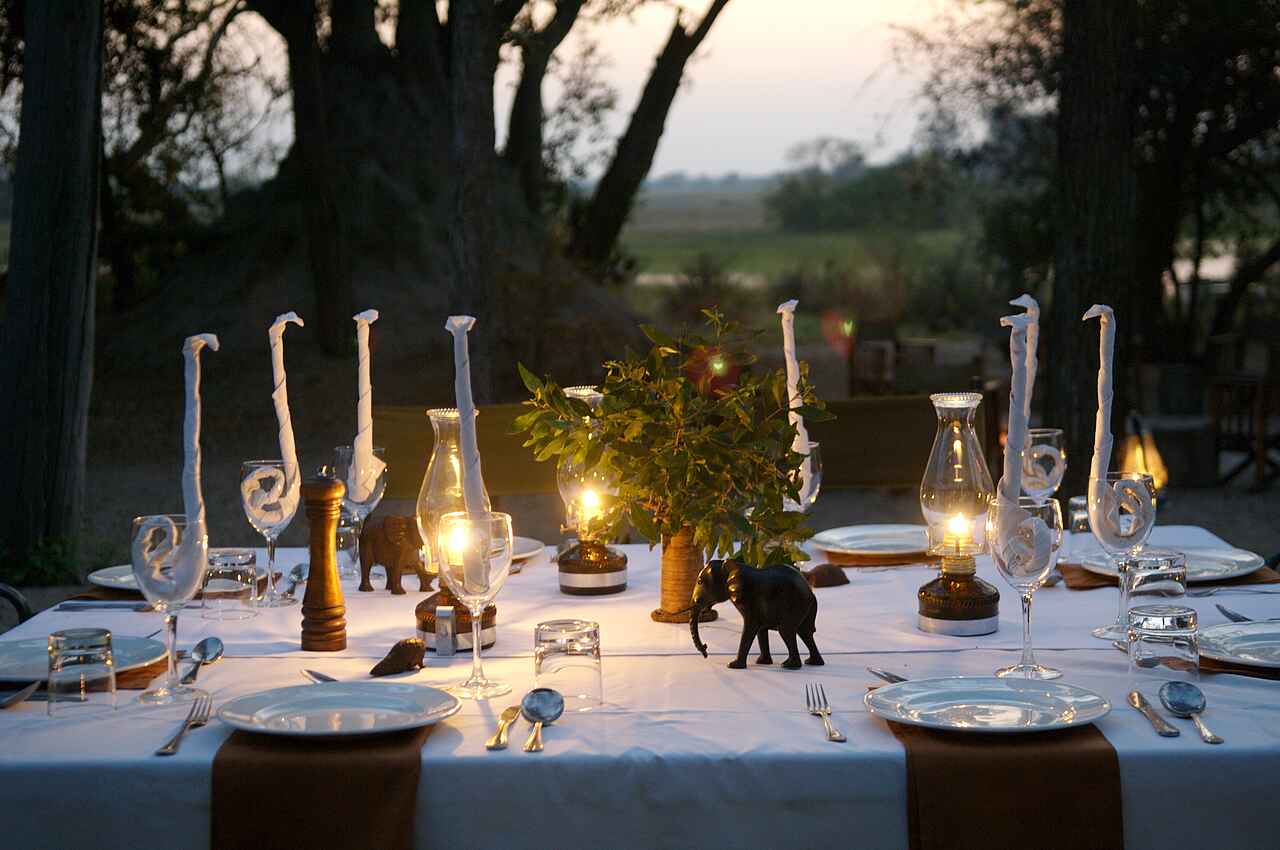 Vollpension, Getränke inkl., außer Champagner, importierte Weine und Spirituosen. Tee oder Kaffee und Gebäck morgens am Bett, gefolgt von einem leichten Frühstück am Lagerfeuer, Busch-Picknick oder Champagnerfrühstück unterwegs, Mittagsbuffet mit Obst, frischen Salaten, Fleisch, Käse und Gemüse, Tea Time mit Tee und Gebäck, Sundowner, 3-Gänge-Abendessen mit internationalen Köstlichkeiten oder frischer Pizza aus dem eigenen Pizzaofen. Gespeist wird – abhängig von der Tagesplanung – im Speisezelt, am Lagerfeuer, auf dem Sonnendeck, an besonderen Orten auf dem Gelände, unterwegs oder auf der Aussichtsplattform im Baum.