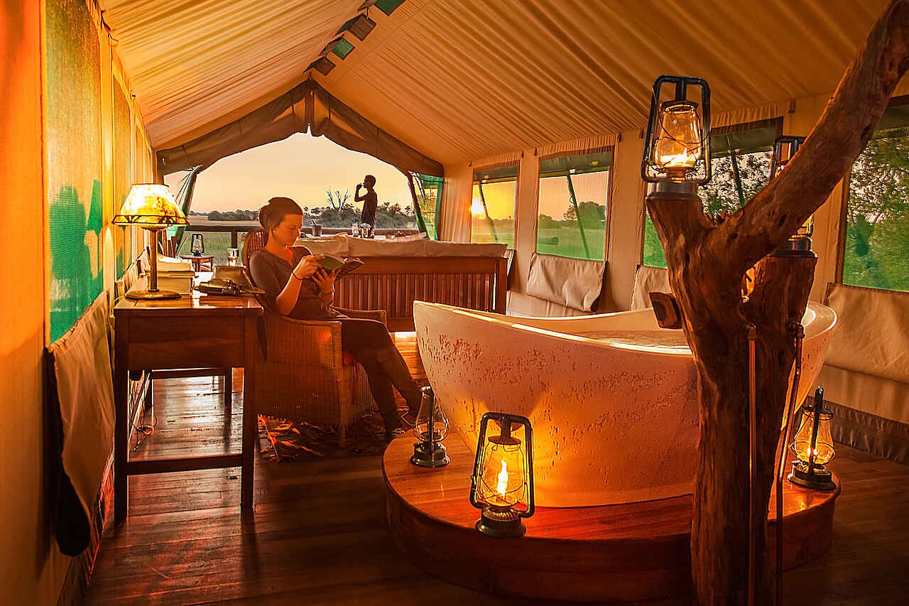 Es gibt insgesamt 8 Gästezelte. Alle bieten Platz für 2 Einzelbetten oder ein Doppelbett. Eine 3-Bett-Ausstattung ist auch möglich. Alle Unterkünfte verfügen über ein eigenes Bad mit Dusche, fließend Heiß- und Kaltwasser, einen Waschtisch, sowie über eine Toilette. Zu jeder Unterkunft gehört eine private Veranda mit Liegestühlen und Hängematte. Die schattig gelegenen Zelte liegen so weit auseinander, dass Ruhe und Privatsphäre sichergestellt sind. 2 der Zelte sind mit einem Steg verbunden und bilden so eine Einheit für Familie oder Freunde. Die Honeymoon-Suite verfügt über eine große Badewanne, sowie über ein Extra-Deck, auf dem privat gespeist werde kann. Ein Wäscheservice kann täglich in Anspruch genommen werden.