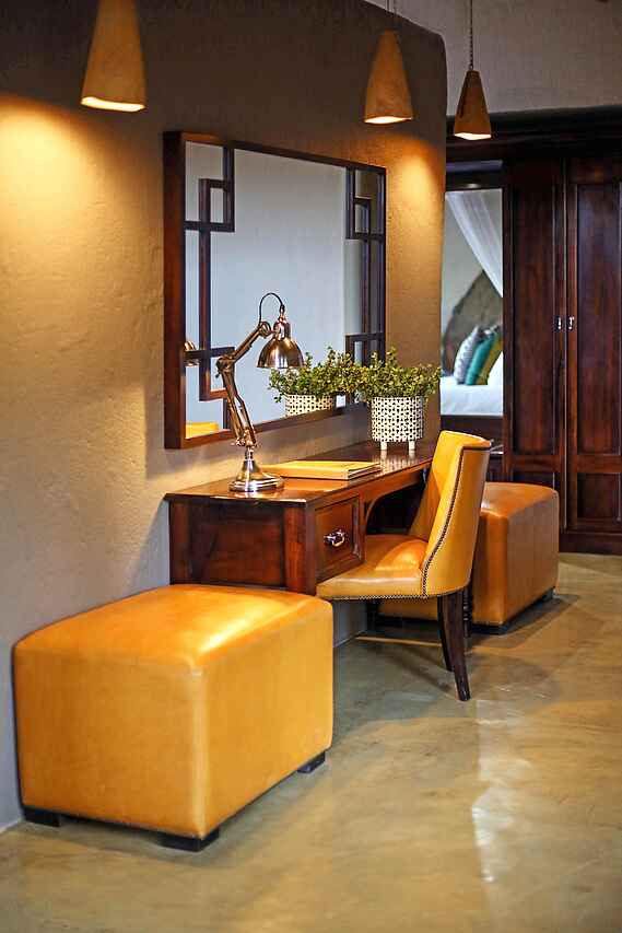10 Suiten mit Glasfassade, ca. 150m² Fläche, mit privater Terrasse und Plunge Pool, klimatisiert mit Ventilator, Minibar, Kaffeemaschine, Moskitonetz, Wi-Fi, Safe; Doppelbetten mi Schlafzimmer mit Blick direkt in den Busch; Lounge mit Sofas, Sesseln, Schreibtisch mit Stuhl, Kamin; en-suite Bädern mit freistehender Badewanne, Waschbecken, separater Toilette, Innen- und Außendusche, Handtüchern und Toilettenartikel, Fön. Little Madikwe als 2 Schlafzimmer Suite mit ca. 390 m²; 2 Suiten können angeschlossen werden um ein privates Camp zu formen für max. 8 Personen; Ausstattung wie Suiten, zusätzlich mit Swimming Pool statt Plunge Pool, privatem Dining Room, privater Küche mit Chef, privatem Pirschfahrzeug, privatem Butler und Childminder, Entertainment Center, kleine Bibliothek.