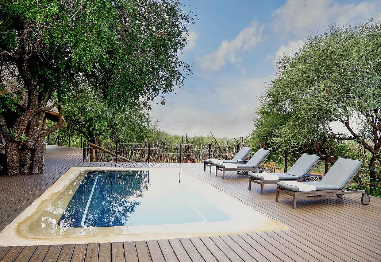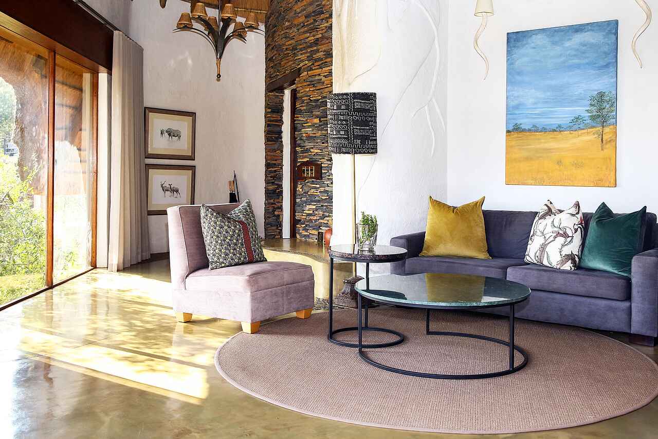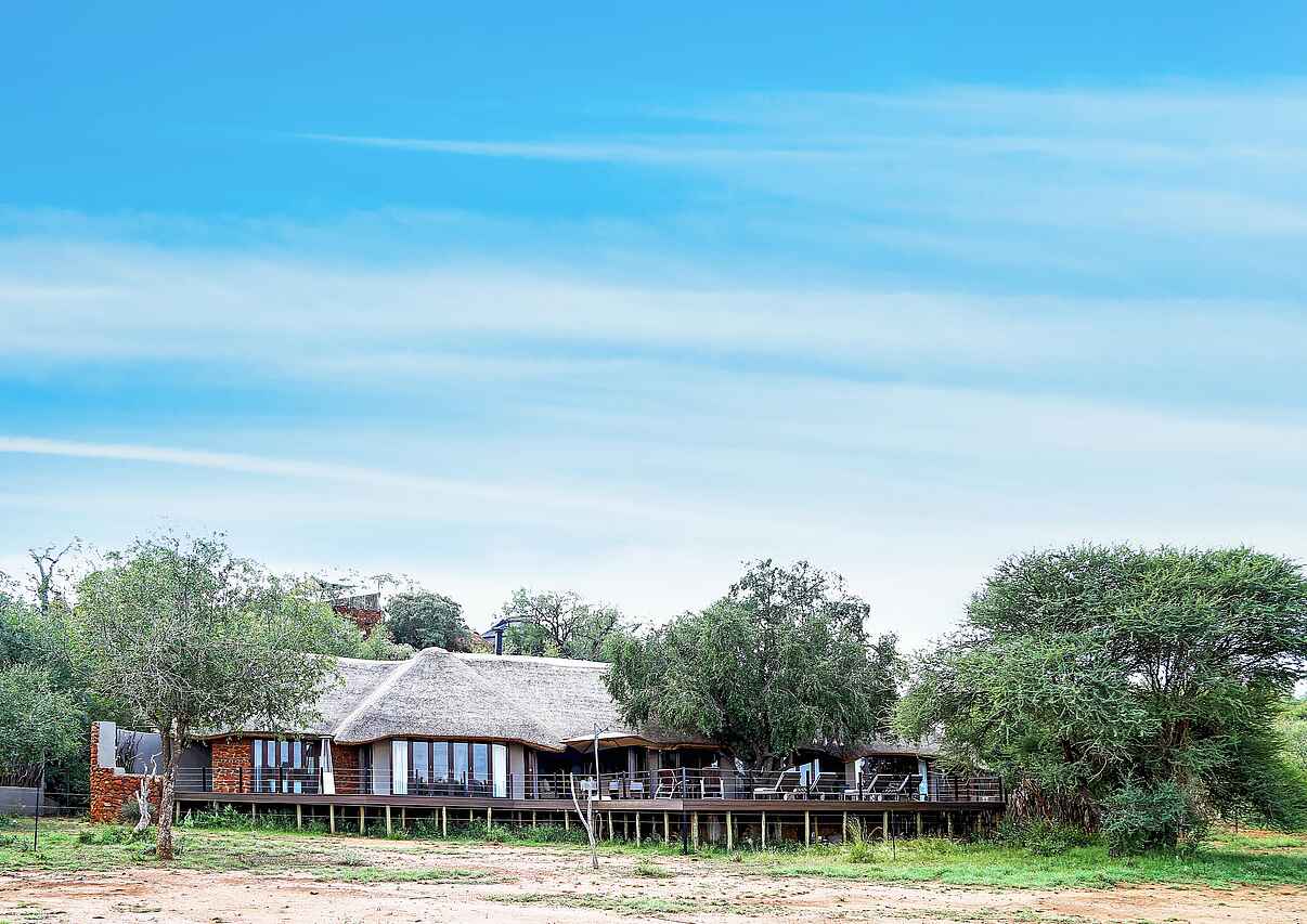 Das wilde Herz Madikwes. Die privilegierte Lage inmitten des Game Reserves erlauben ausführliche und abenteuerliche Pirschfahrten in alle Himmelsrichtungen. Design und Austattung sind hervorragend. Vor Lodge befindet sich ein Wasserloch.