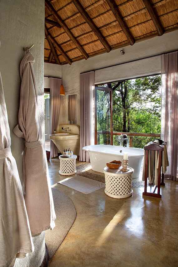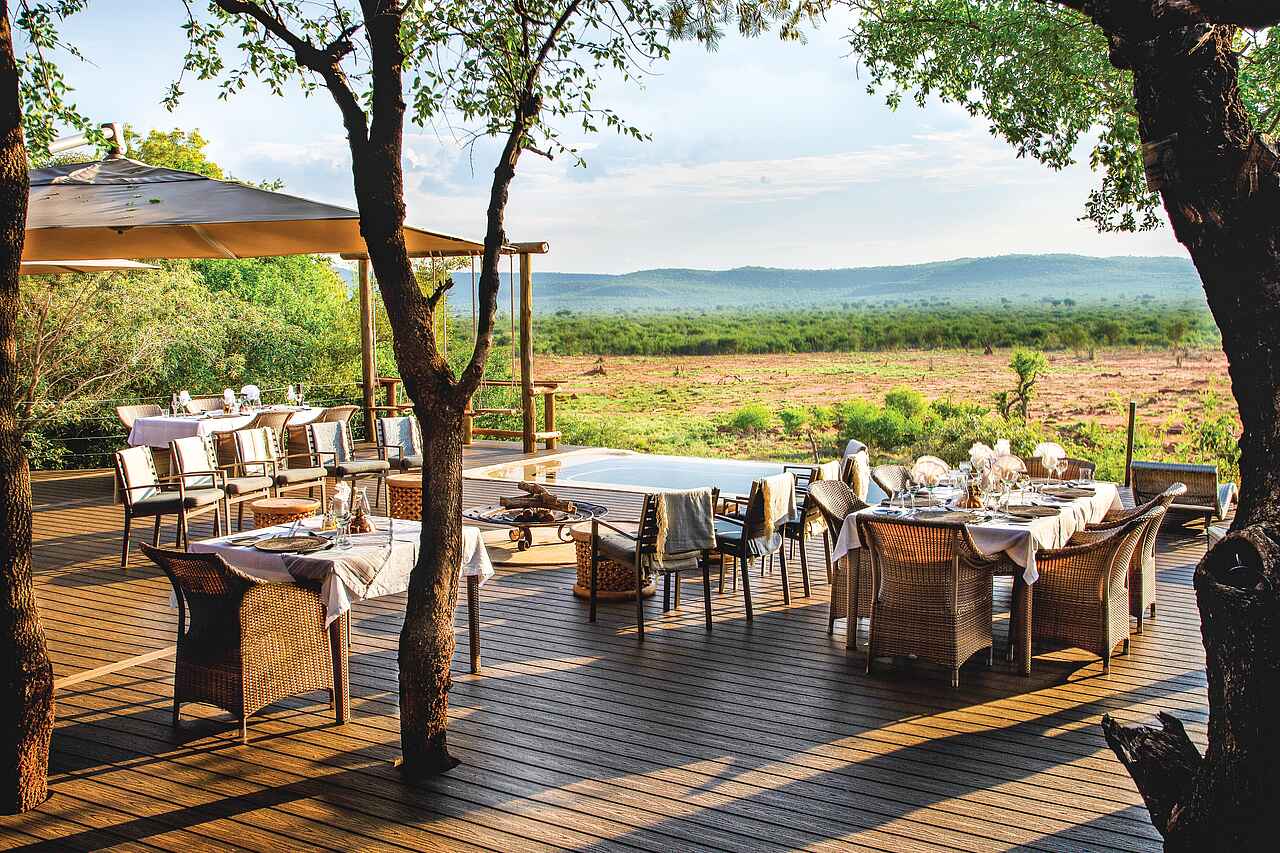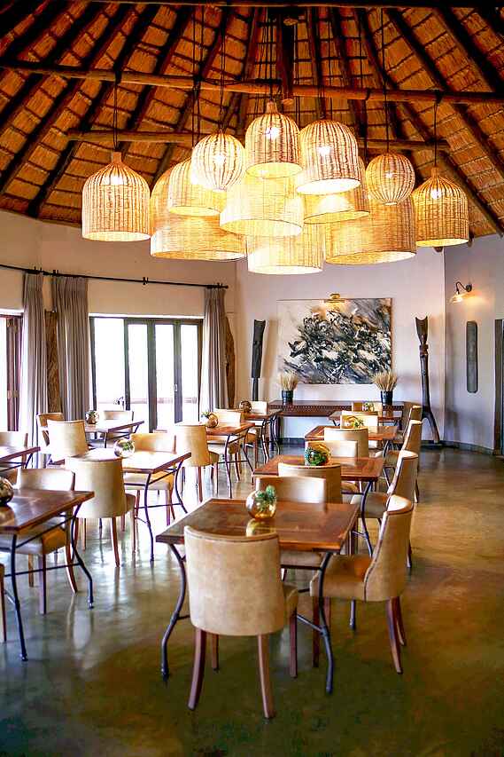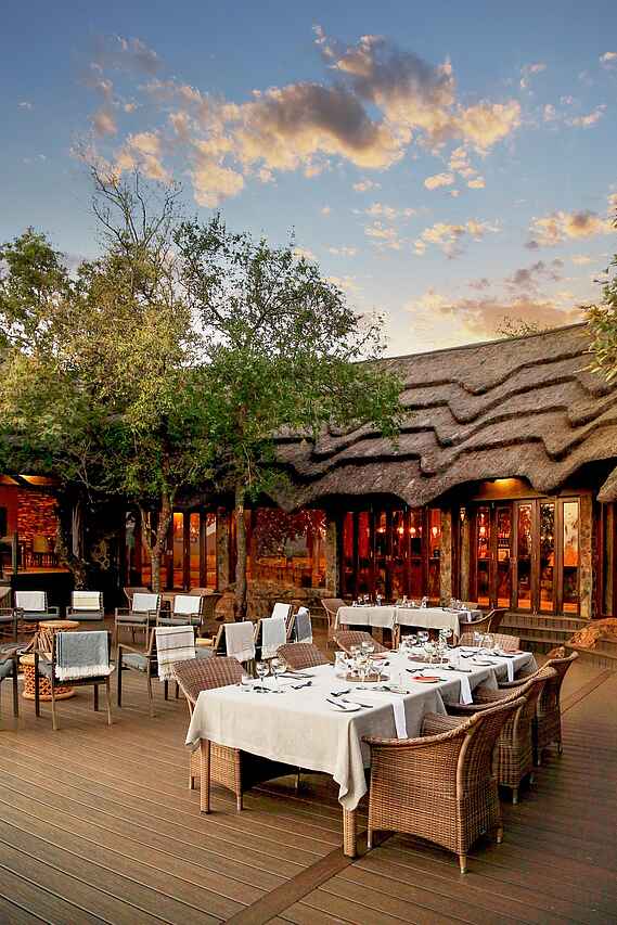 Afrikanische und internationale Küche; serviertes Frühstück, Mittagessen, serviertes, mehrgängiges Abendessen; zudem Morgendlicher Snack, Kaffeepause auf Pirschfahrt, High-Tea, Sundowner. Alle Getränke, auch alkoholische inkludiert außer Premiumweine, Champagner oder ähnliches. Buschbreakfast auf Anfrage; alle Diäten auf Anfrage; regelmäßiges traditionelles Braai in der Boma.
