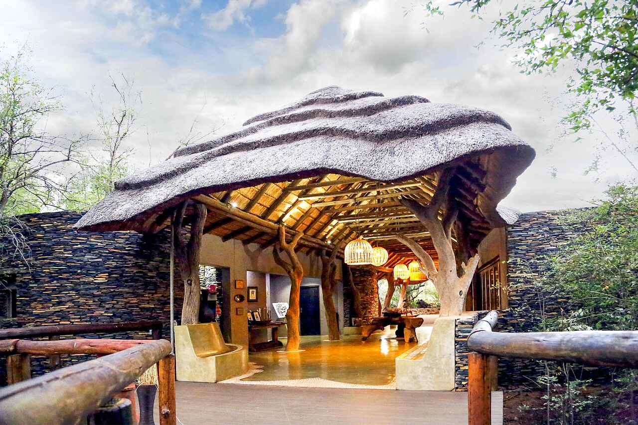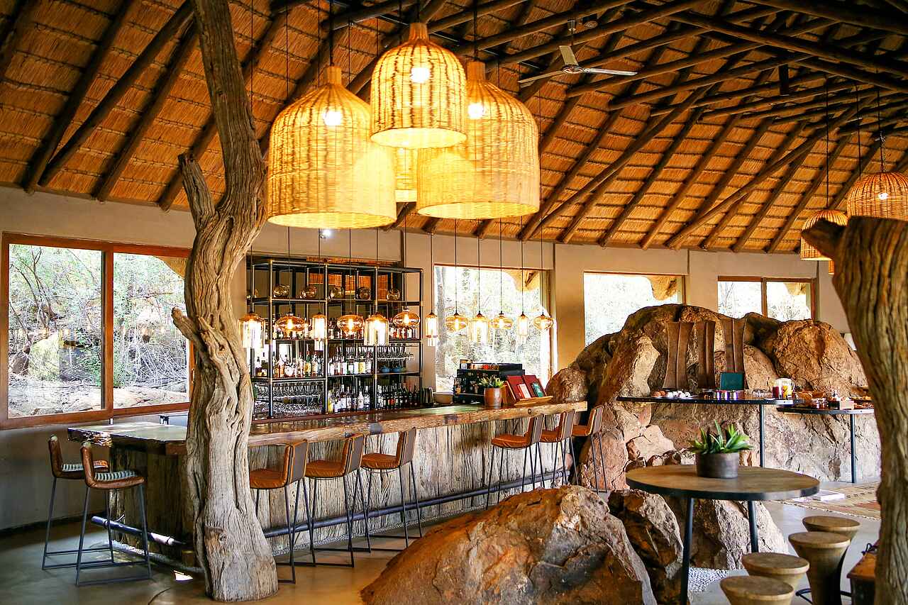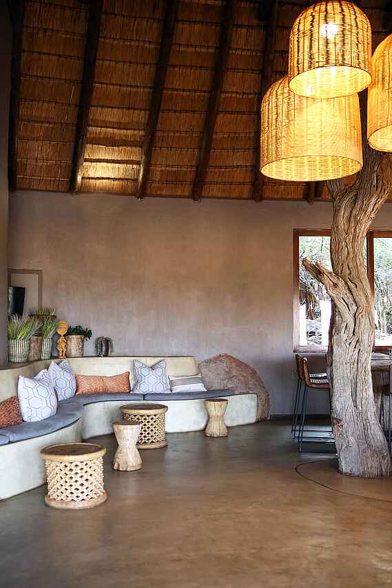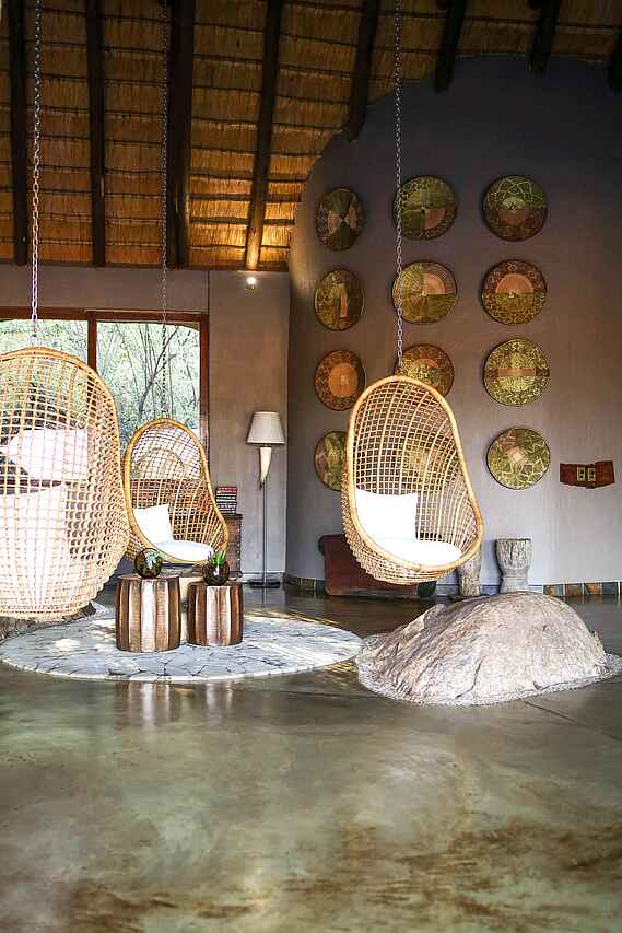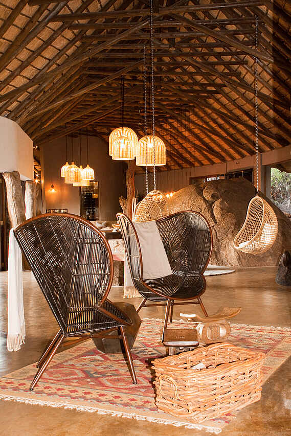 Große Hauptlodge mit Rezeption, Lounge mit Bar, Restaurant, Weinkeller, großer Terrasse mit Sitzgruppen und Sonnenschirmen, Blick auf das Wasserloch, Boma auf der Hügelkuppe, Curio Shop, Spa, Gym, Wi-Fi, Wäscheservice.