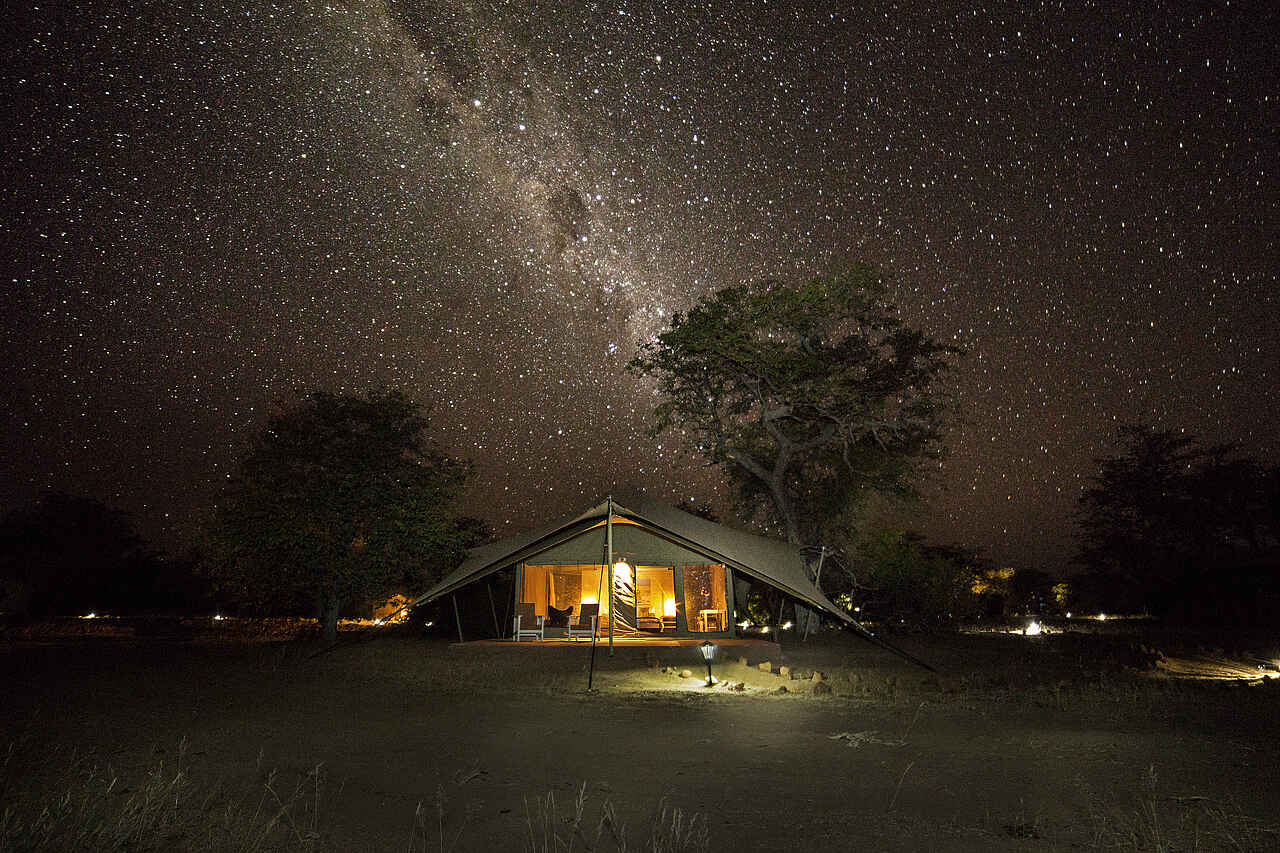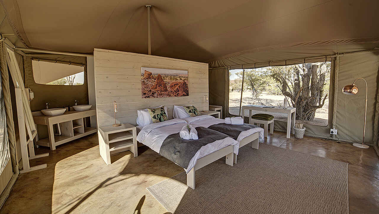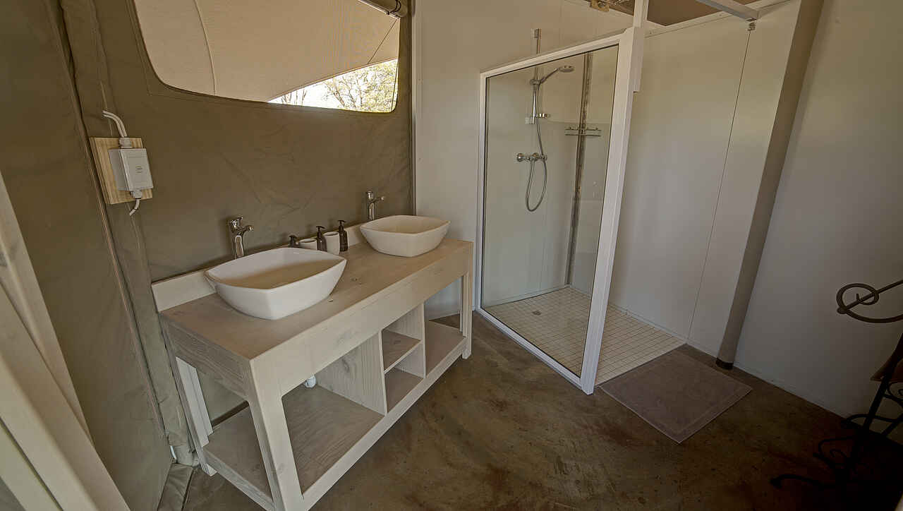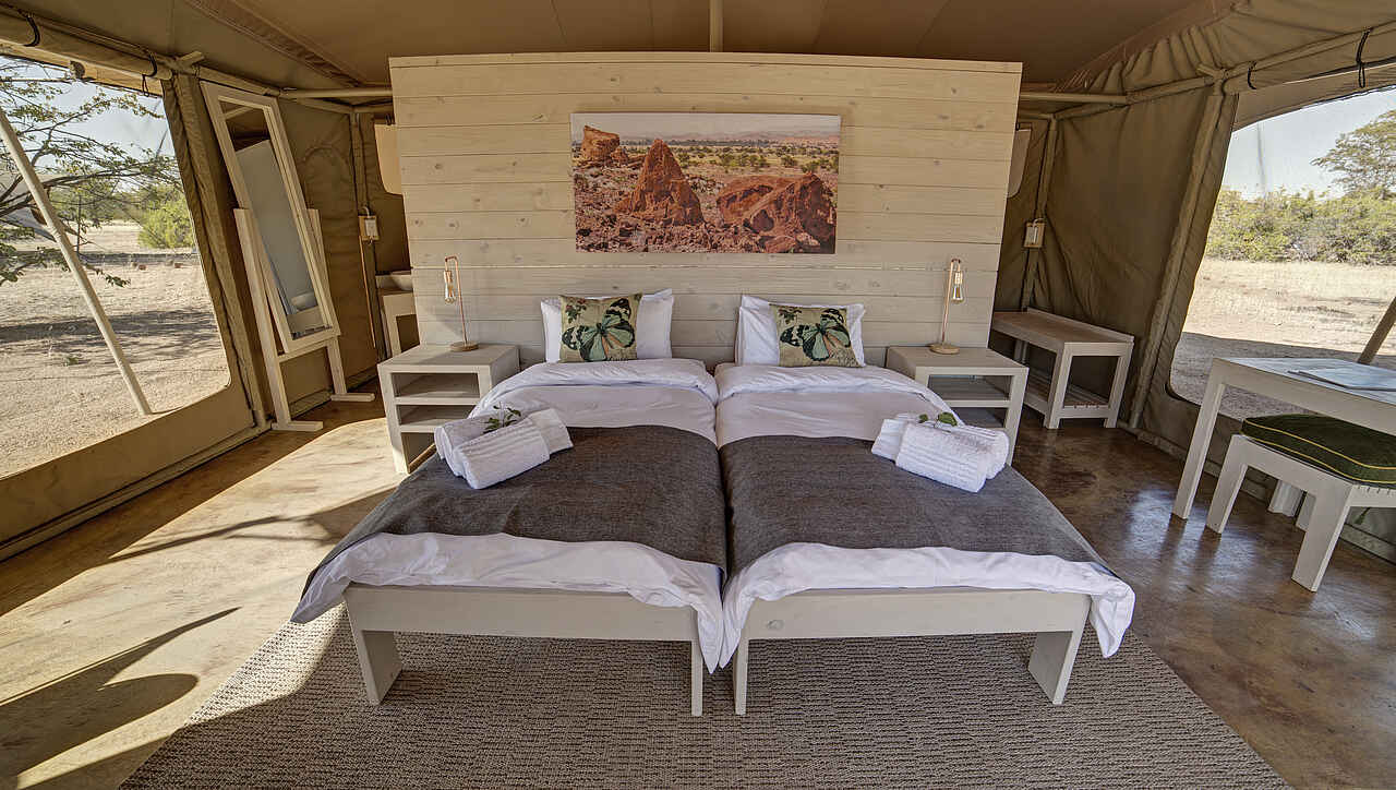 10 Twinzelte auf Betonsockeln sind ca 43m² groß, mit en-suite Dusche, Waschbecken, Spültoilette, Ventilator und eingeschränktem 220V Stromanschluss ausgestattet. Vor dem Zelt hat der Gast einen schattigen Sitzplatz. Die Zelte sind mit genug Abstand voneinander platziert, sodass die Privatsphäre gewährleitet ist, aber immer noch bequem zu Fuß zu erreichen sind.