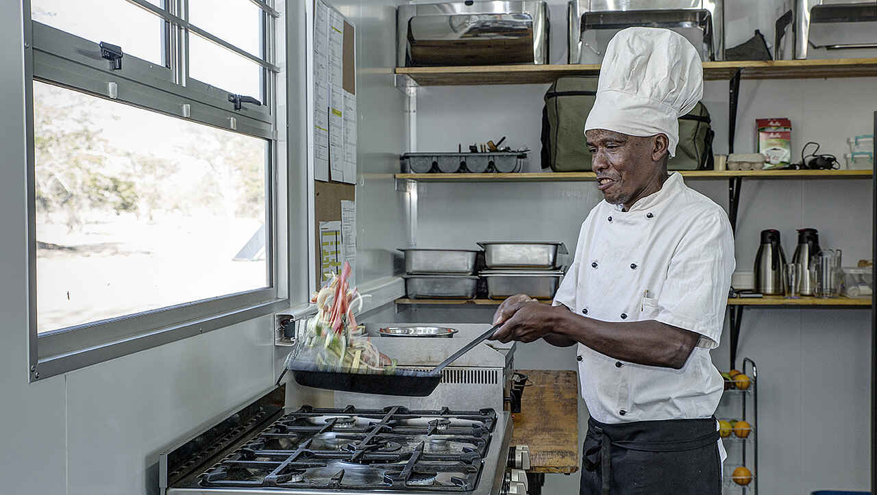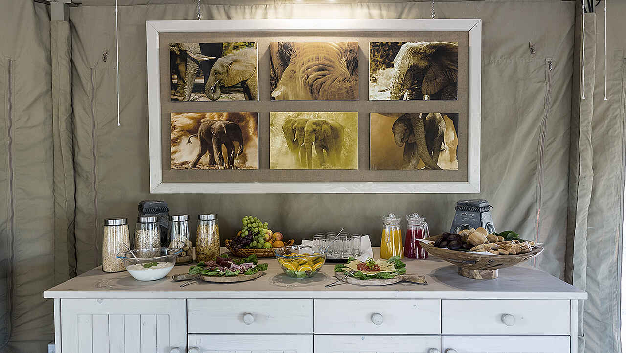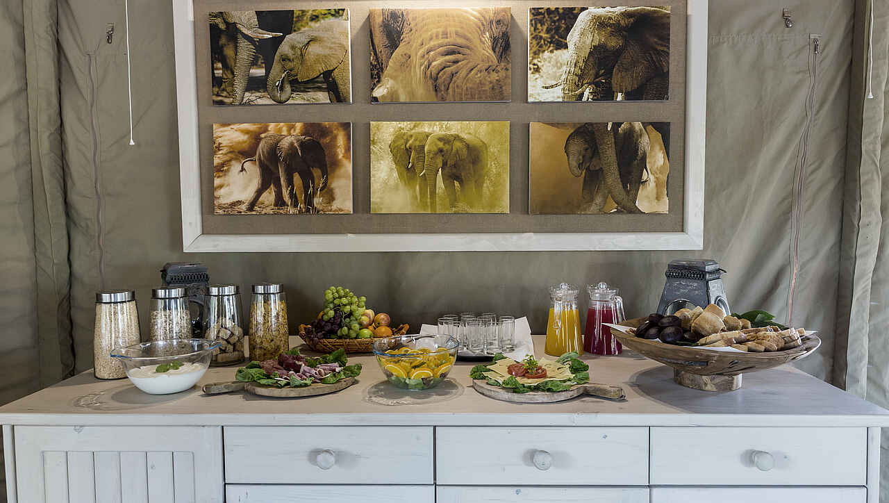 Die Wohnzelte von Malansrus fügen sich gut zwischen Busch und Mopanebäumen ein und haben daher nur minimale Auswirkungen auf die natürliche Umgebung. Das Camp wird mit limitierter Stromzufuhr betrieben.