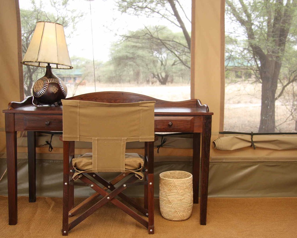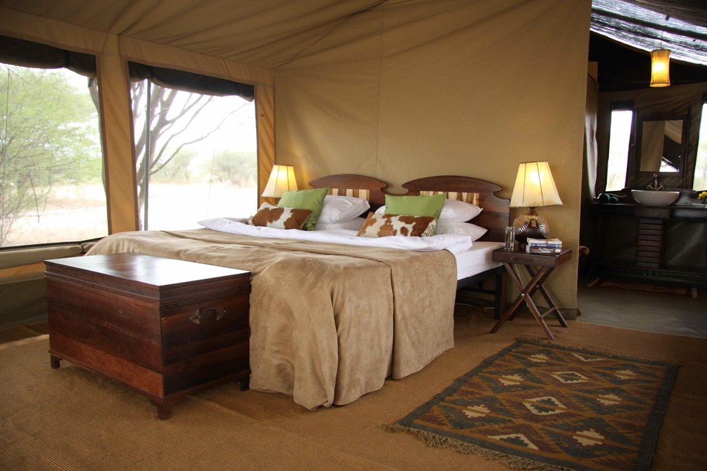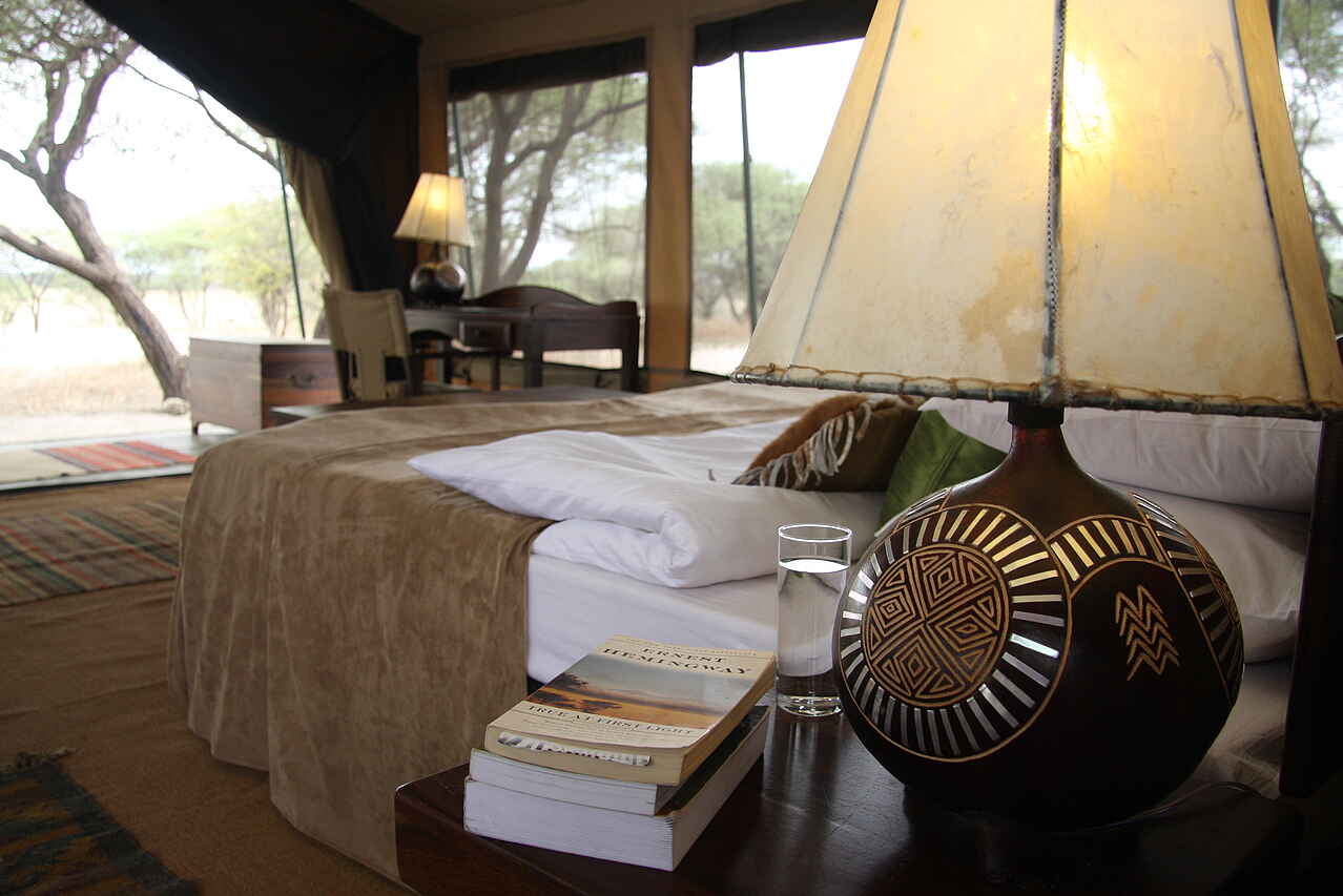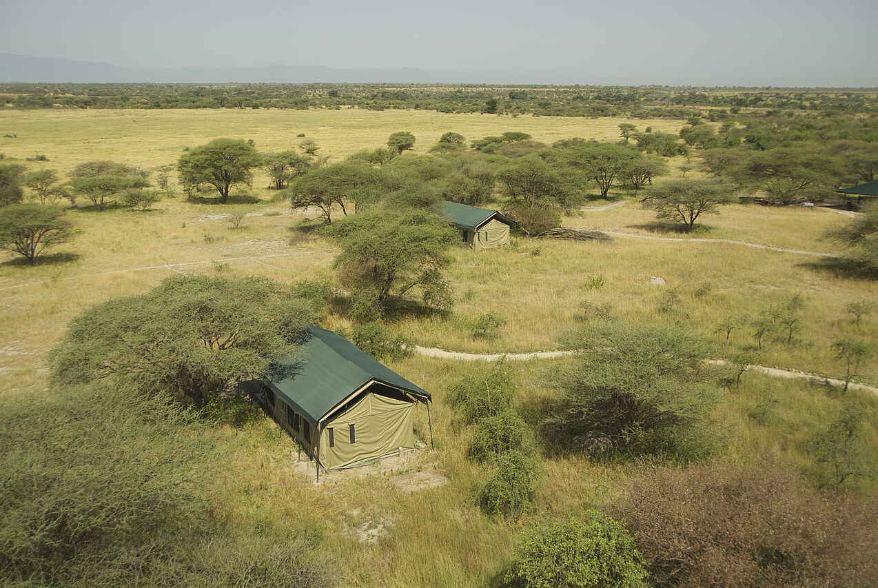 8 Gästezelte mit doppeltem Dach und Blick auf die Hänge des Manyara-Escarpment stehen auf niedrigen Plattformen verteilt im Gelände unter Akazien. Alle mit Gitternetzen vor Insekten geschützte Zelte mit privatem Bad, Dusche, Waschbecken, WC, fließend Kalt- und Warmwasser. Große Doppel- oder Einzelbetten. 2 der 8 Zelte sind als Familieneinheit konfiguriert. Alle Zelte können auch zu dritt belegt werden. Schreibtische, Regale, ausreichende Beleuchtung. Sitzmöbel vor jedem Zelt.