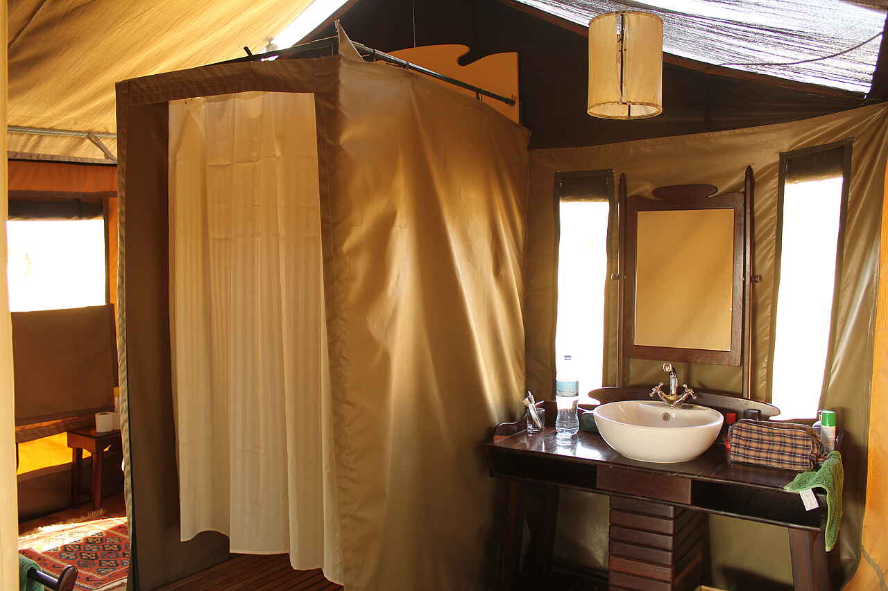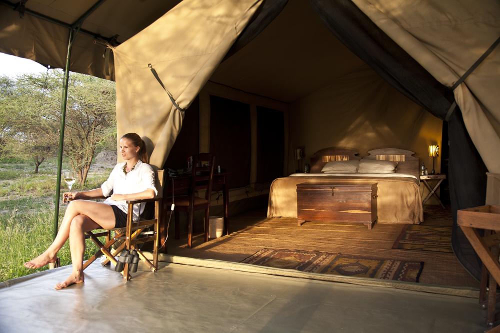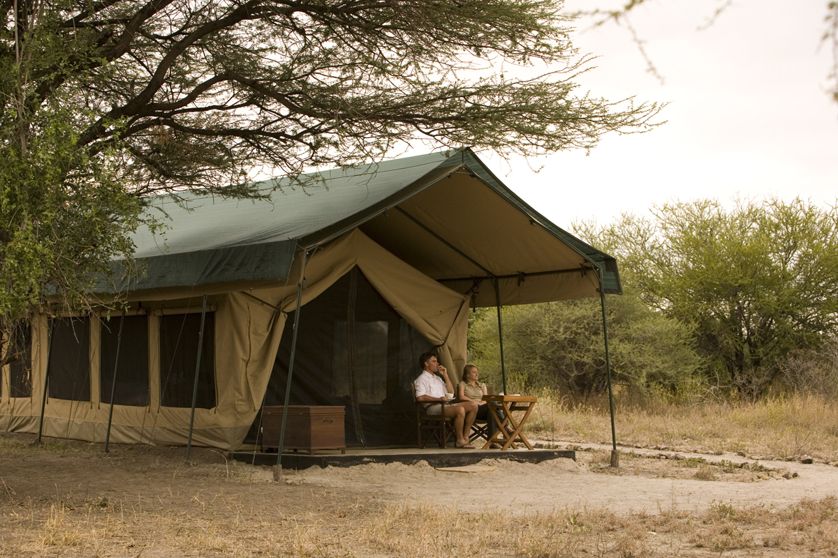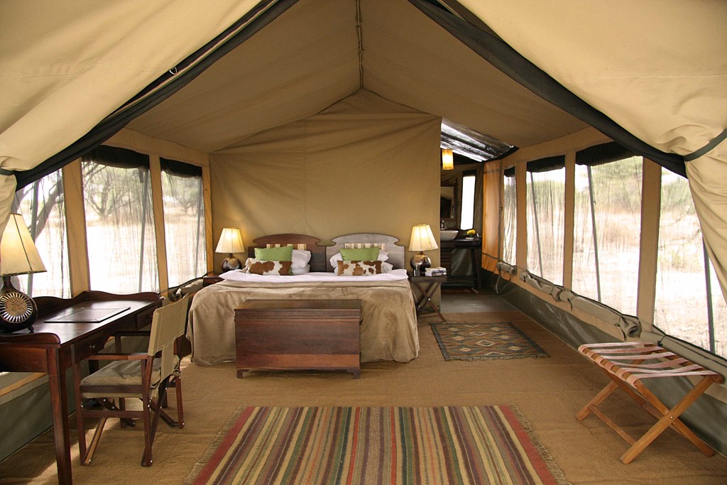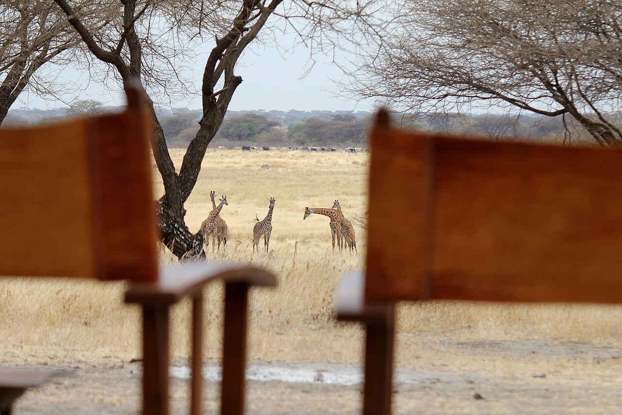 8 Gästezelte mit doppeltem Dach und Blick auf die Hänge des Manyara-Escarpment stehen auf niedrigen Plattformen verteilt im Gelände unter Akazien. Alle mit Gitternetzen vor Insekten geschützte Zelte mit privatem Bad, Dusche, Waschbecken, WC, fließend Kalt- und Warmwasser. Große Doppel- oder Einzelbetten. 2 der 8 Zelte sind als Familieneinheit konfiguriert. Alle Zelte können auch zu dritt belegt werden. Schreibtische, Regale, ausreichende Beleuchtung. Sitzmöbel vor jedem Zelt.
