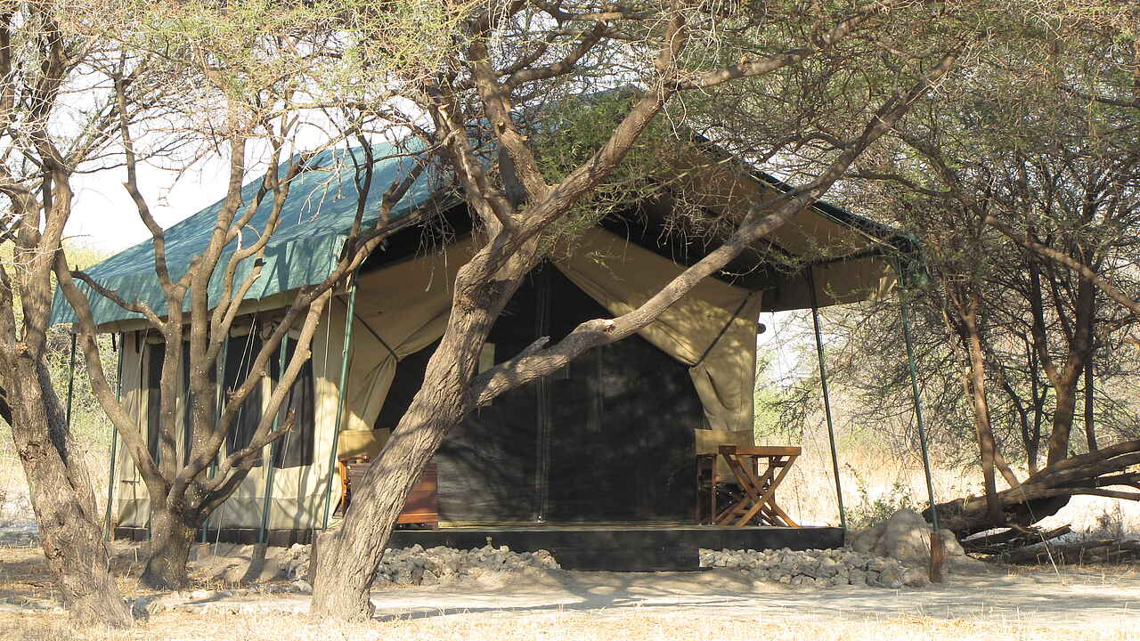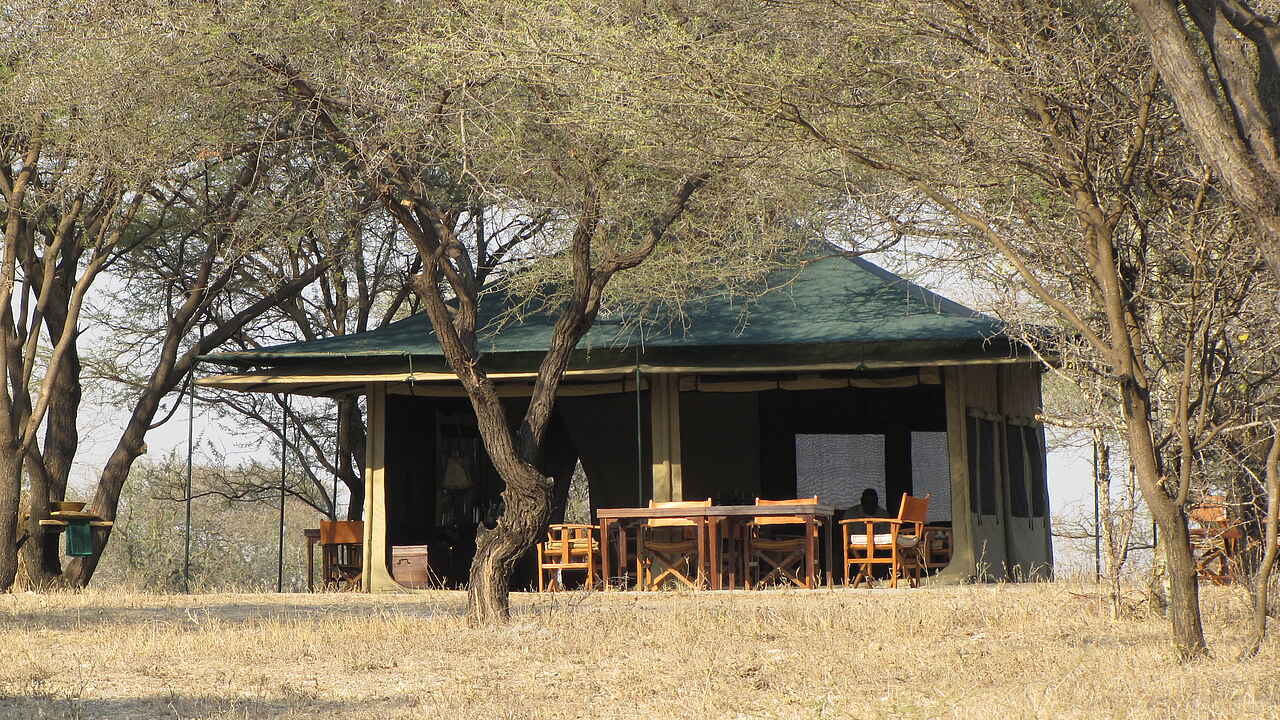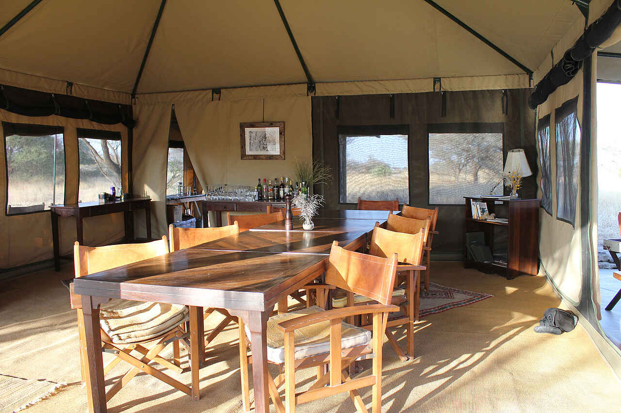 Das ebenerdige Hauptzelt steht gut erreichbar im Zentrum des Camps. Es wird von Akazien überschattet und verfügt über ein Vordach. Teppiche bedecken den Boden. Es gibt einen Esstisch, verschiedenene Sitzgelegenheiten, eine Bar. Das Zelt ist nach vorn offen, kann aber mit Netzen gegen Moskitos geschützt werden.