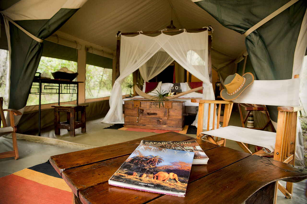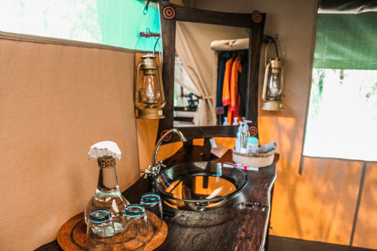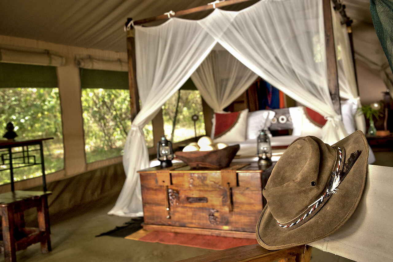 Main Camp: die beigen Kanvaszelte stehen auf dem Boden, der mit einer dicken Zeltplane überzogen ist. Vor dem Eingang liegt eine überdachte Terrasse mit Zeltboden und Safari-Lounger-Stühlen. Im Innenbereich befindet sich ein leichter Hängeschrank inklusive Bademänteln und das Doppelbett mit Pfosten, an denen die Moskitonetze angebracht sind. Dahinter schließt das Badezimmer mit Waschtisch aus Holz und Glaswaschbecken, die Toilette und eine Duschecke an. Die Zelte sind mit Safari-Möbeln aus Holz und Leder ausgestattet und liebevoll mit lokaler Kunst dekoriert. Private Wing: die Kanvaszelte erheben sich auf Holzterrassen und geben eine wunderbaren Blick auf den Fluss und sein Tierleben frei. Das Interieur wirkt in seiner Kombination aus hellen Stoffen mit frischen Farben attraktiv und großzügig. Auf die davorliegende, überdachte und möblierte Terrasse folgt das Schlafzimmer mit Doppelbett, Schreibtisch mit weißem Lederstuhl. Im Anschluß das Badezimmer mit Waschtisch und Doppelwaschbecken, Toilette und Duschecken. Vor jedem Zelt steht eine überdachte Hängemattenkonstruktion für traumhafte Siestas. Die Familienzelte sind ca 30% größer und trennen den Extra-Schlafbereich mit einem Vorhang ab.
