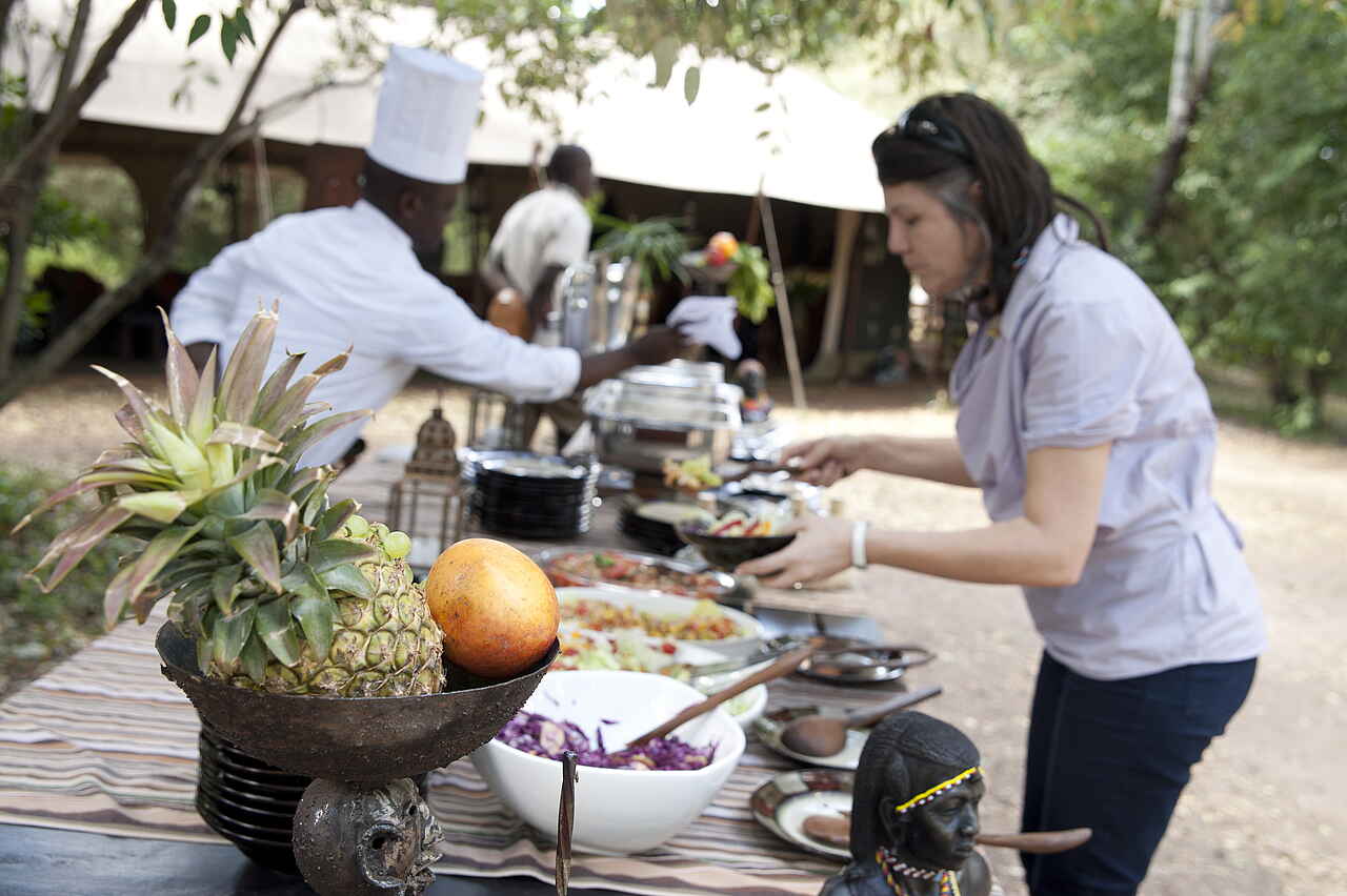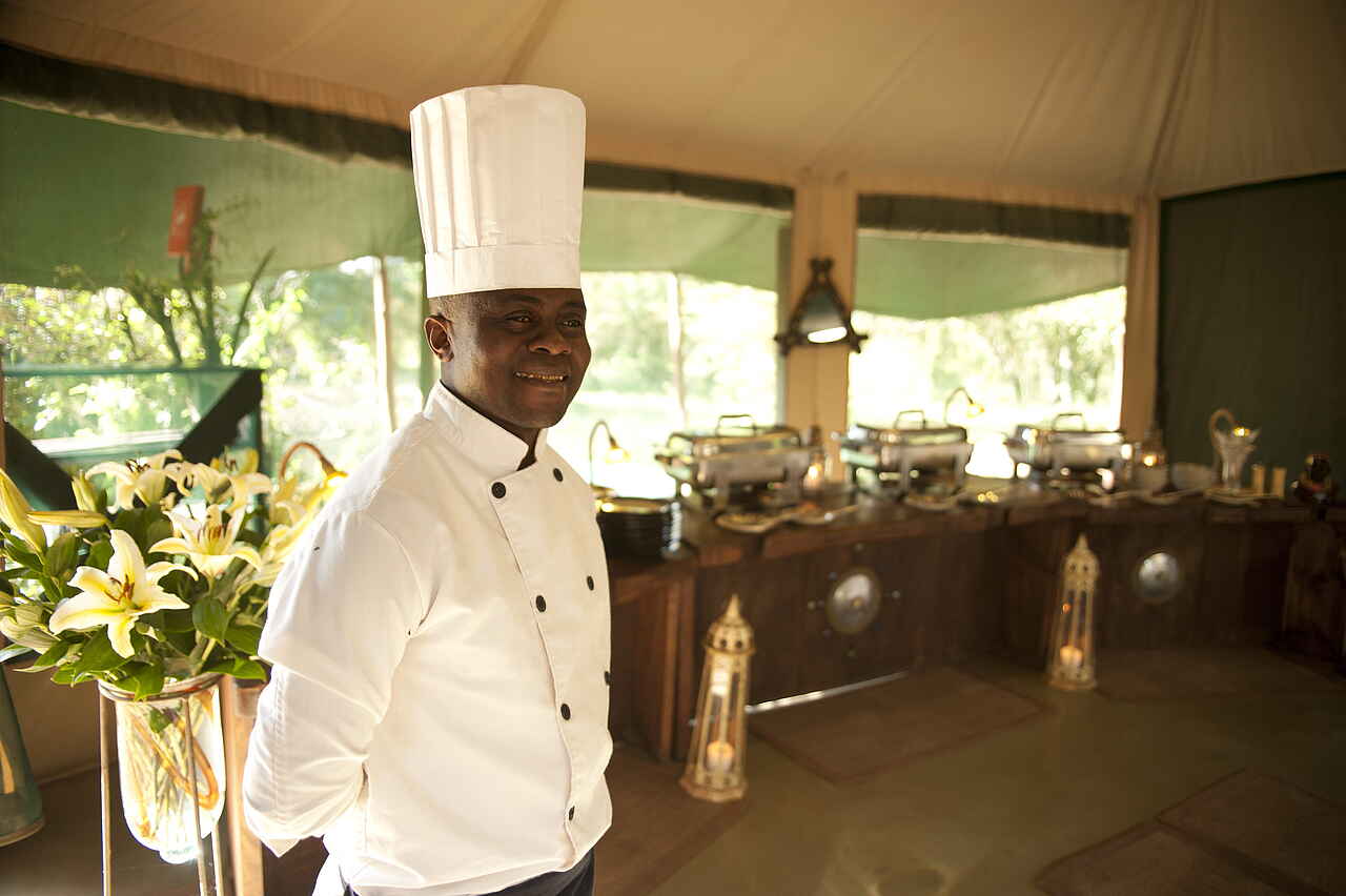 Frühstücksbüffet mit frischen Früchten und Säften und einer Show-Cooking-Bar für individuell erstellte Eierspeisen. Mittagessen á la Carte im Speisezelt oder an den kleinen Tischen, die im Gartenbereich unter den Bäumen verteilt stehen. Das Abendessen variiert mit verschiedenen Themen: Grillabende, Show-Cooking und frische, selbsterstellte Pizza aus dem Outdoor-Pizza-Ofen, aus dem auch das selbstgemachte Brot stammt, das zu allen Mahlzeiten frisch gebacken serviert wird. Gepacktes Lunch-Picknick für Gäste die eine Ganztages-Safari unternehmen wollen. Auf Bestellung auch Frühstück im Bush. Private Bush-Dinner gegen Aufpreis. Alle Getränke, außer Markensprituosen, sind im Preis inkludiert.