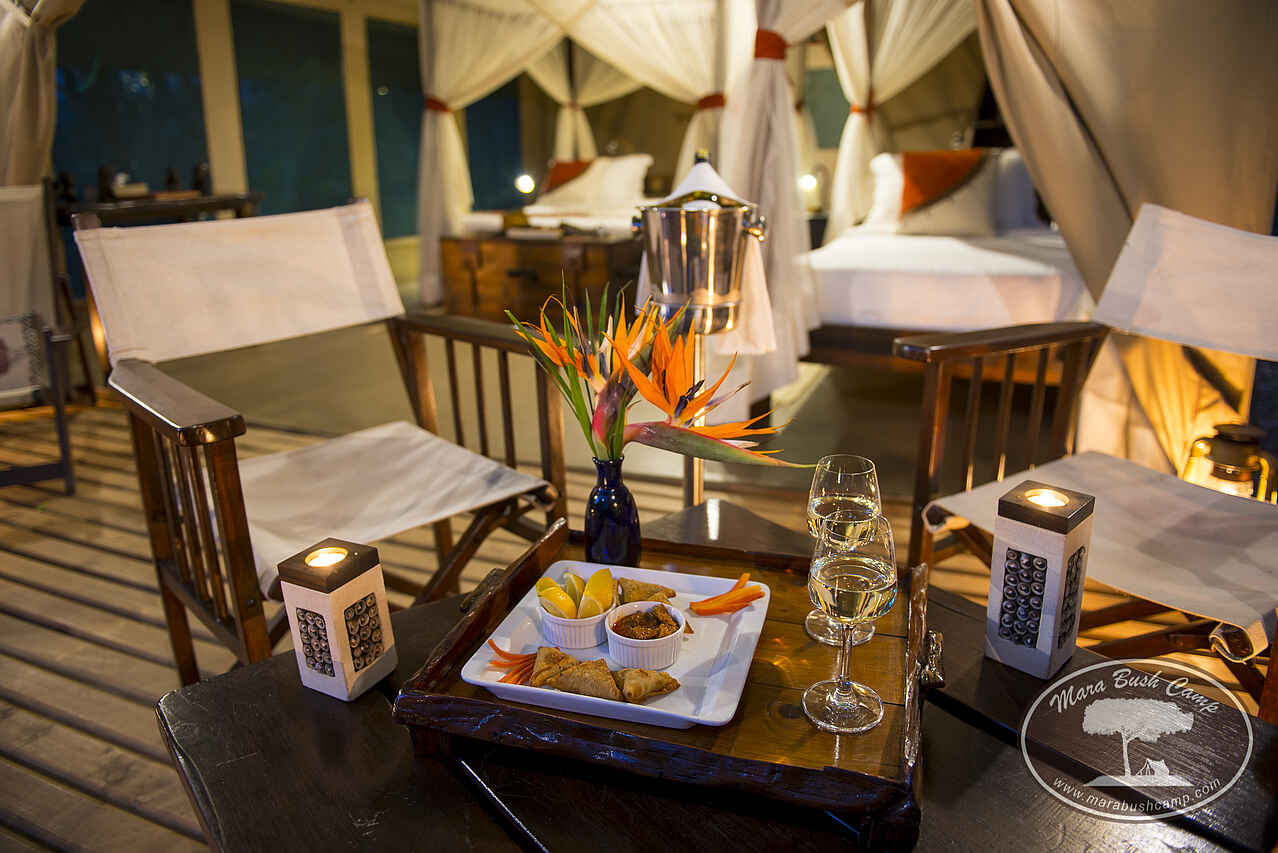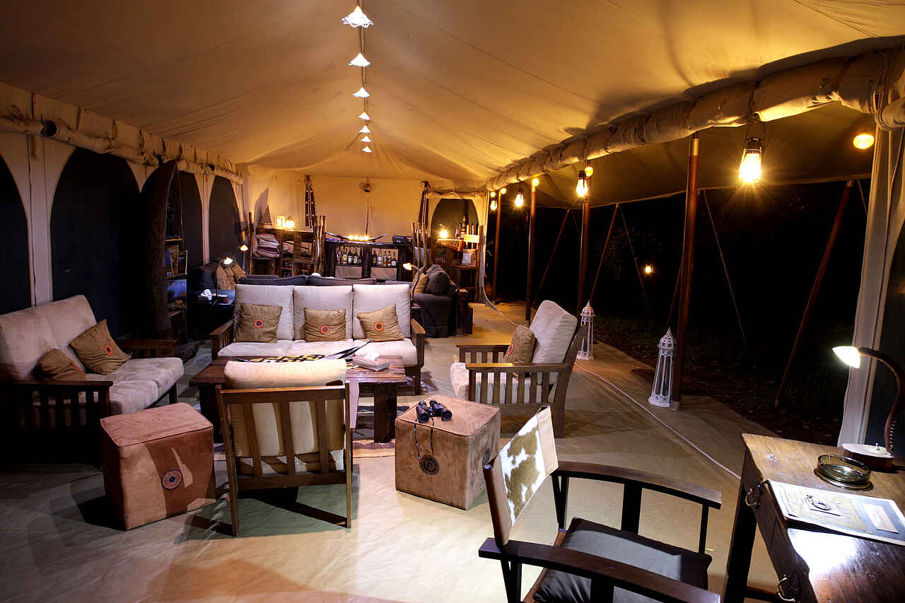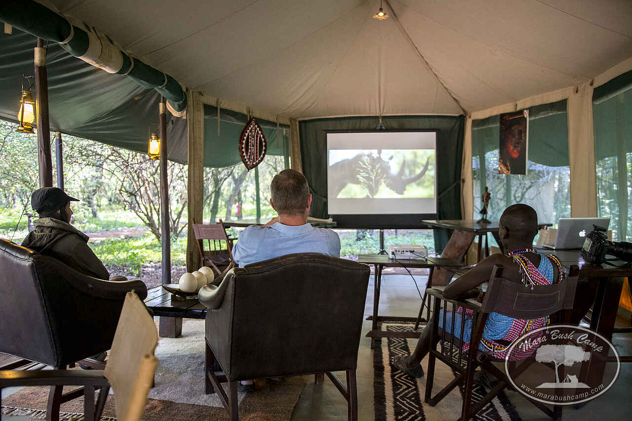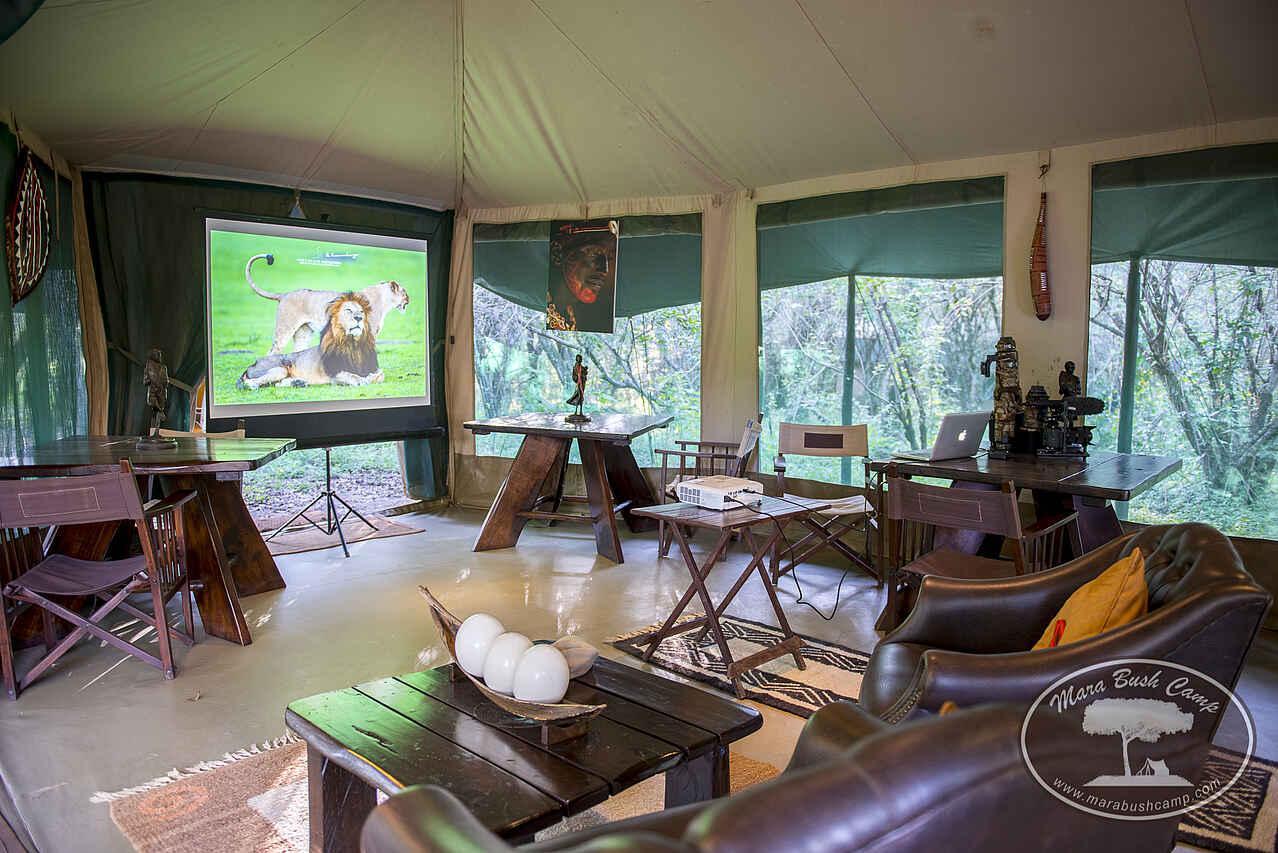 Main Camp: den ebenerdigen Hauptbereich in einem kleinen Wäldchen versteckt, direkt am Ufer des Flusses, bildet ein Konglomerat aus beigen Kanvas-Zelten mit Gitternetz-Seitenwänden: das Speisezelt mit einfachen Holztischen im Innenbereich und großen Außenbereich für Al-Fresco-Dining; das Barzelt mit gemütlichen Sitzecken und hübschen tribalen Dekostoffen mit Spielen für Jung und Alt; eine separate Foto-Lounge mit Arbeitstischen, Steckdosen und Wifi zur Bildbearbeitung und zum Erfahrungsaustausch mit anderen Fotografen. Am Ende wartet ein Souvenir-Shop mit handgemachten Produkten der örtlichen Maasai-Frauen auf seine Kunden, den Mittelpunkt bildet das davorliegenden Lagerfeuer. Private Wing: der Hauptbereich steht erhöht auf Holzterrassen mit Restaurant, Bar plus einer eigenen Foto-Lounge und wirkt mit seiner Mischung aus Maasai-roten Sitzecken und Animal-Print Stoffen und handgemachten Holzmöbeln sehr elegant; davor lädt eine erhöhte Terrasse aus Naturstein mit direktem Blick auf den Hippo-Pool im Fluss ein. In beiden Camps findet der Gast im Hauptbereich Steckdosen zum Laden seiner Geräte und Wifi. Das Mara Bush Camp und seine Wege werden von Paraffinlampen beleuchtet, was ihm einen romantischen Touch verleiht und zur Reduzierung von Lichtvermutzung beiträgt.