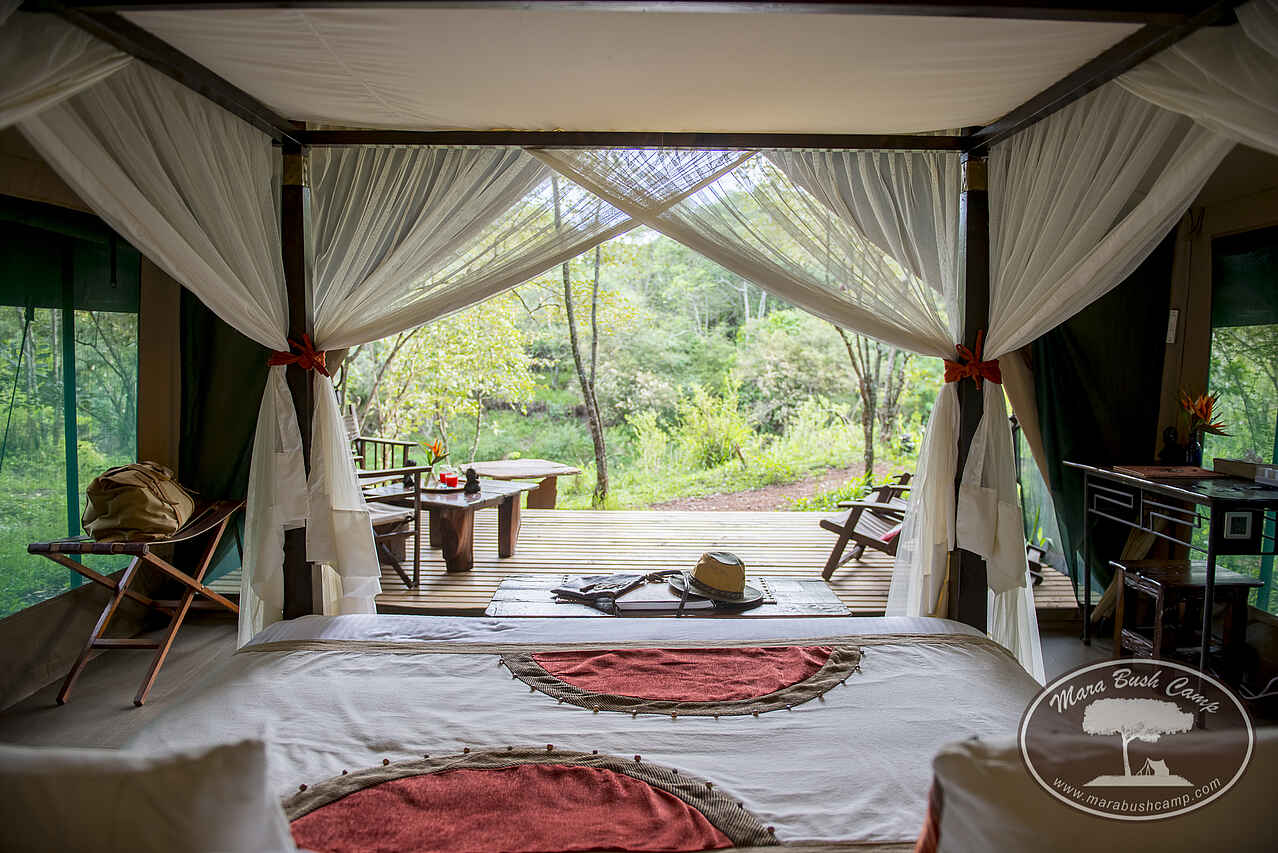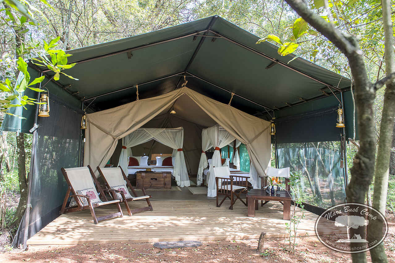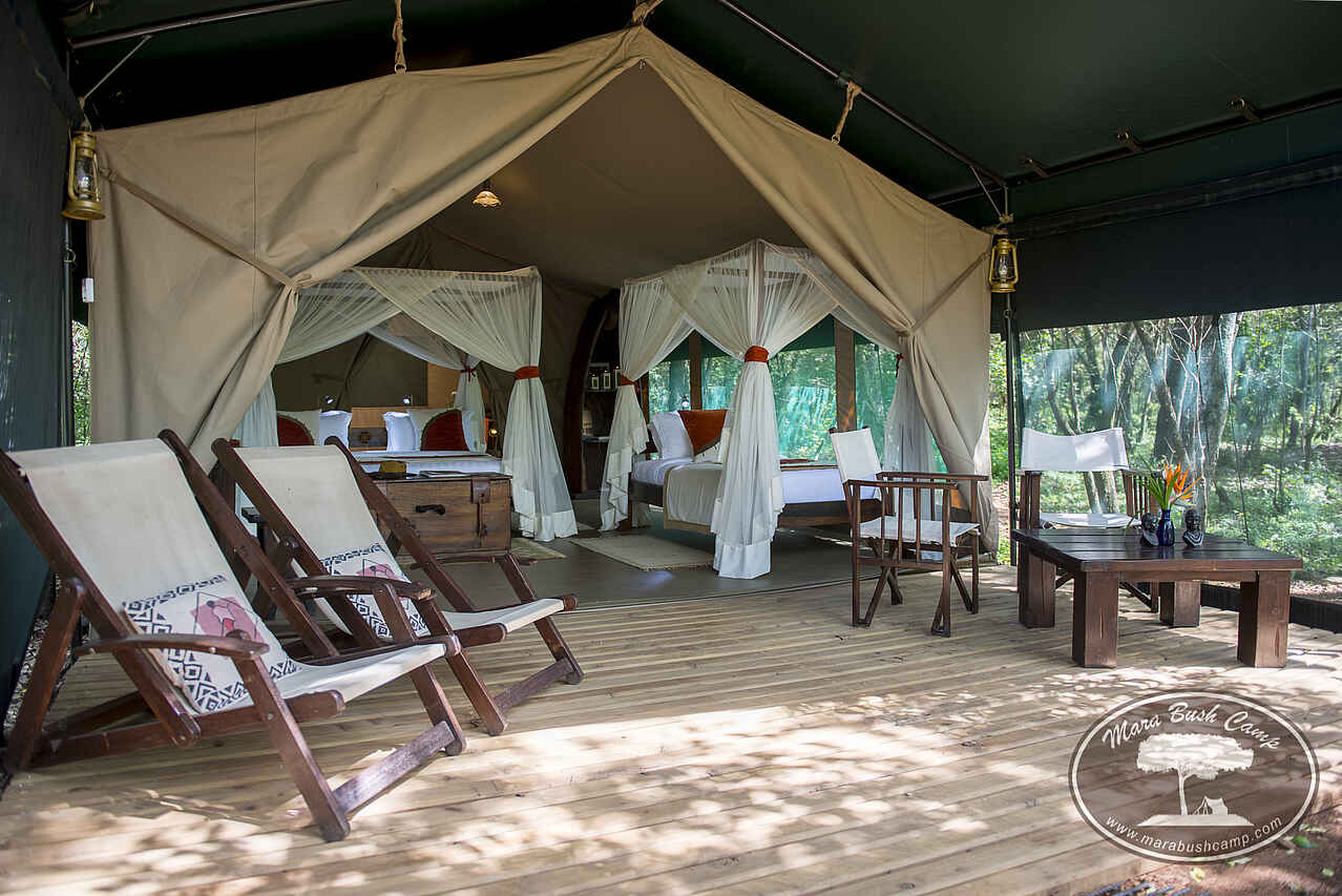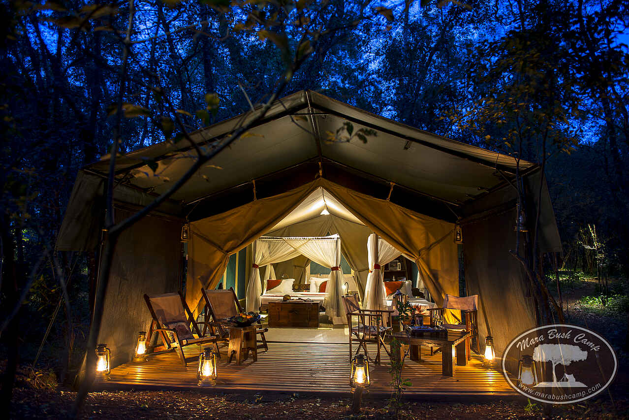 Das Mara Bush Camp liegt im Masai Mara Nationalpark, in kurzer Distanz zum Zusammenfluss des Talek und des Mara Rivers, dort wo die Millionen Tiere der Migration das Flusssystem überqueren. Das Camp selbst steht versteckt unter Bäumen direkt am Ufer des Olare Orok Rivers. Die nächste Umgebung des Camps setzt sich aus verschiedenen Landschaften zusammen: weites Grasland, kleine Wäldchen und eine Vielfalt an Flüssen, die diversen Habitats sorgen für herrliche, abwechslungsreiche Tiererlebnisse. In dieser Gegend wurde der berühmte Film über die Gepardin Maleika gedreht.
