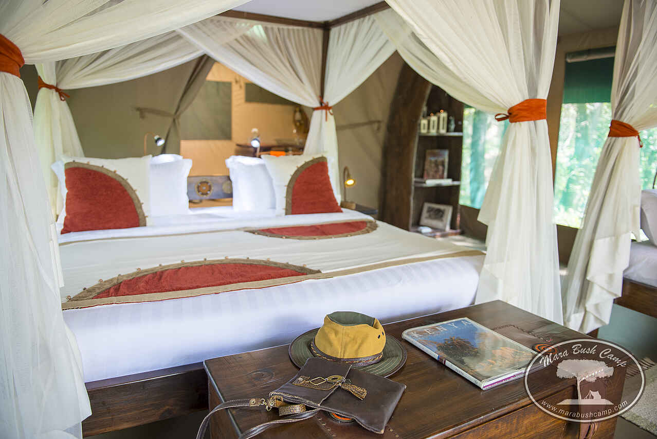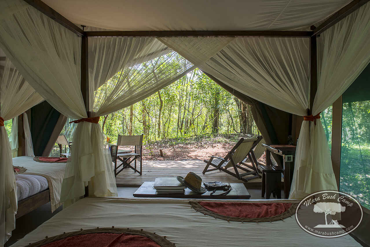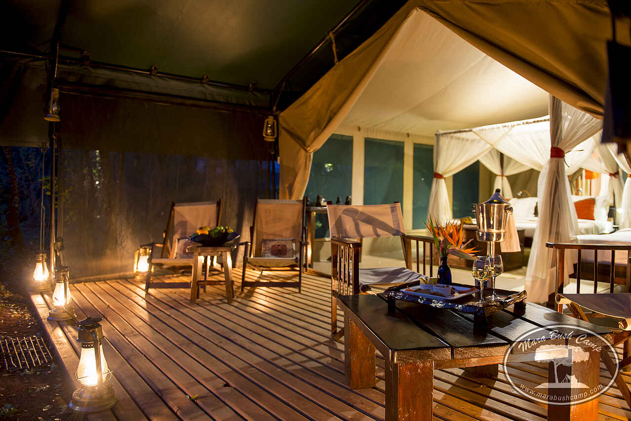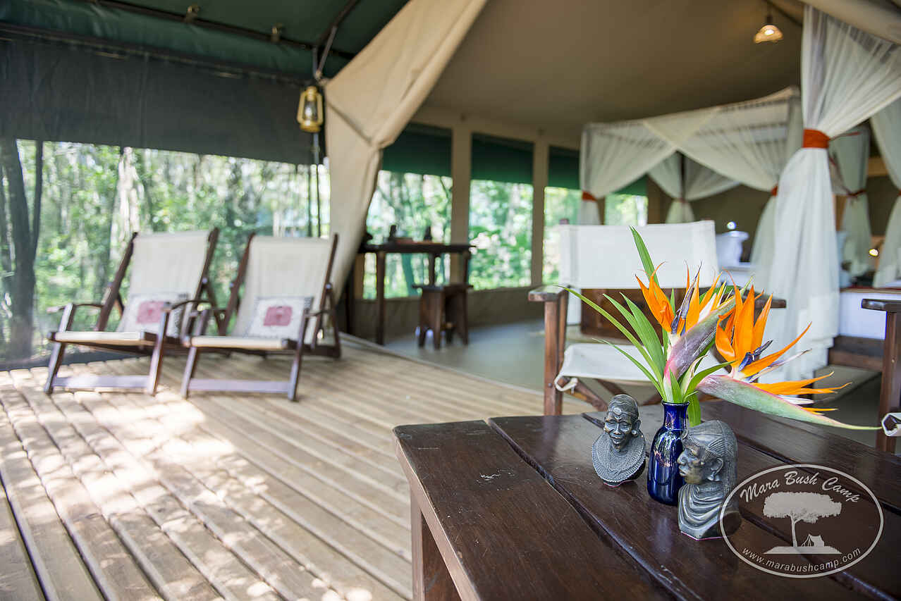 Das Mara Bush Camp liegt im Masai Mara Nationalpark, in kurzer Distanz zum Zusammenfluss des Talek und des Mara Rivers, dort wo die Millionen Tiere der Migration das Flusssystem überqueren. Das Camp selbst steht versteckt unter Bäumen direkt am Ufer des Olare Orok Rivers. Die nächste Umgebung des Camps setzt sich aus verschiedenen Landschaften zusammen: weites Grasland, kleine Wäldchen und eine Vielfalt an Flüssen, die diversen Habitats sorgen für herrliche, abwechslungsreiche Tiererlebnisse. In dieser Gegend wurde der berühmte Film über die Gepardin Maleika gedreht.