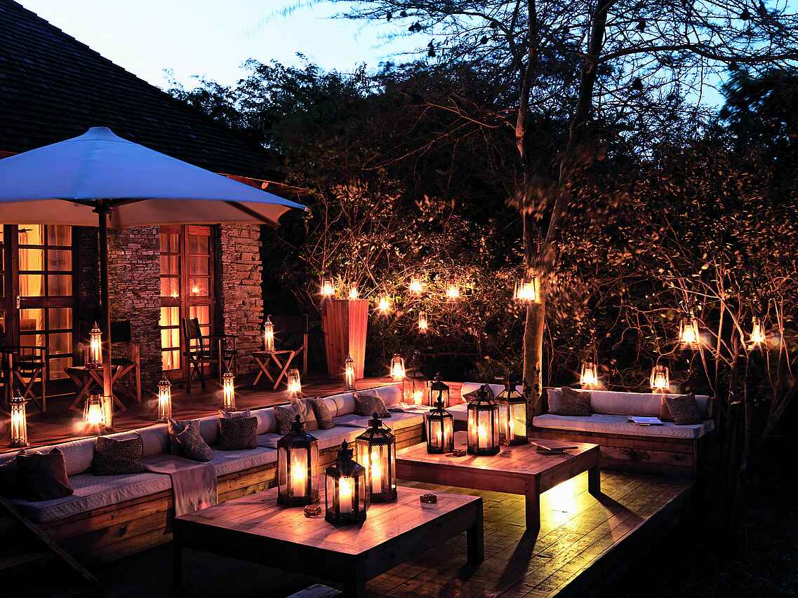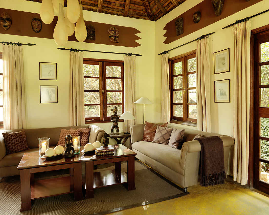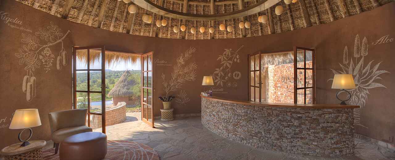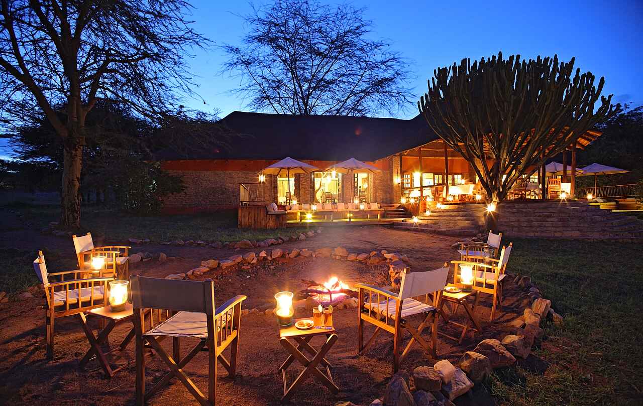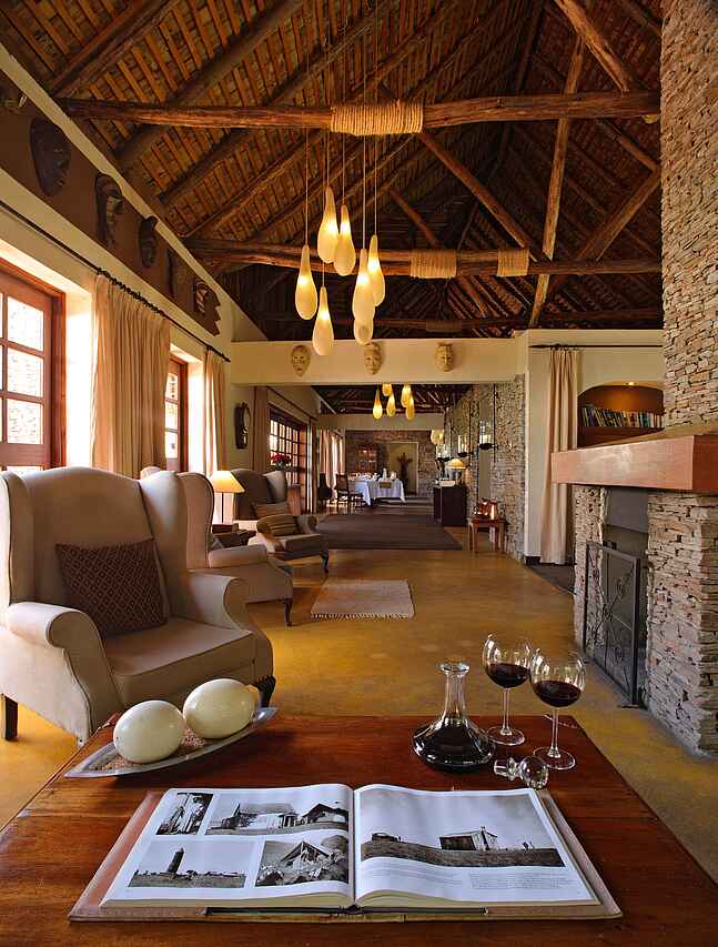 Zentraler Treffpunkt ist das Hauptgebäude aus Stein mit Ausblick auf die Savanne. Dort befindet sich das Restaurant, eine Bibliothek mit Aufenthaltsmöglichkeiten und offenem Kamin. Vorgelegen ist eine Feuerstelle, die als sozialer Treffpunkt im Camp genutzt werden kann.