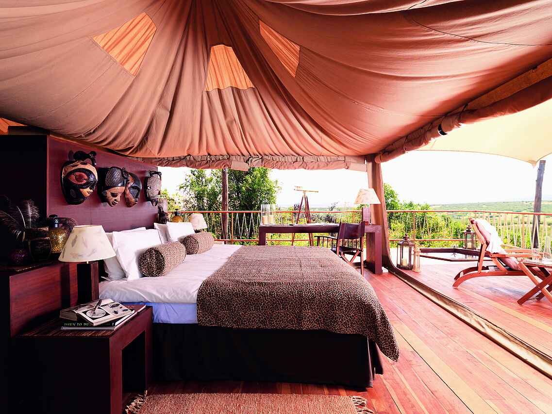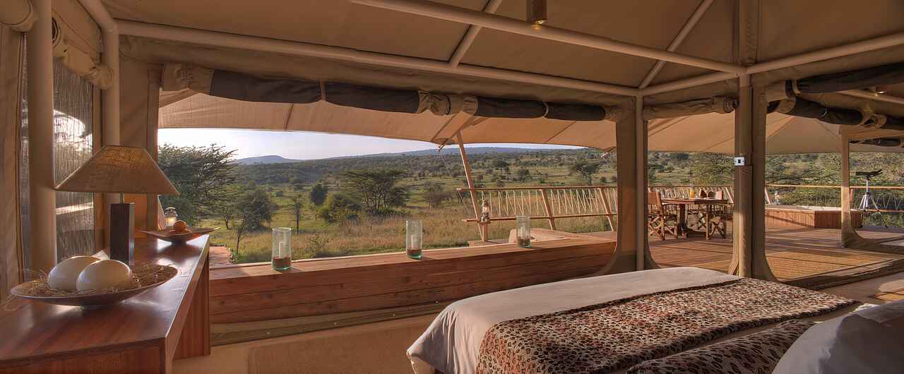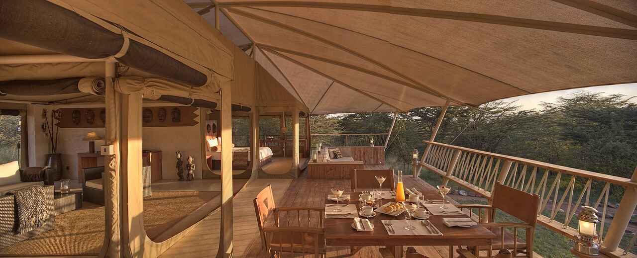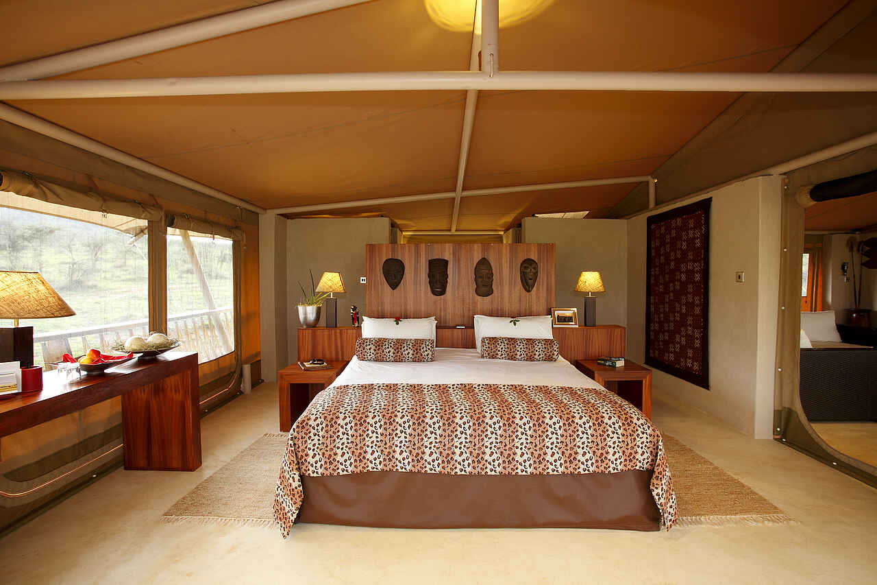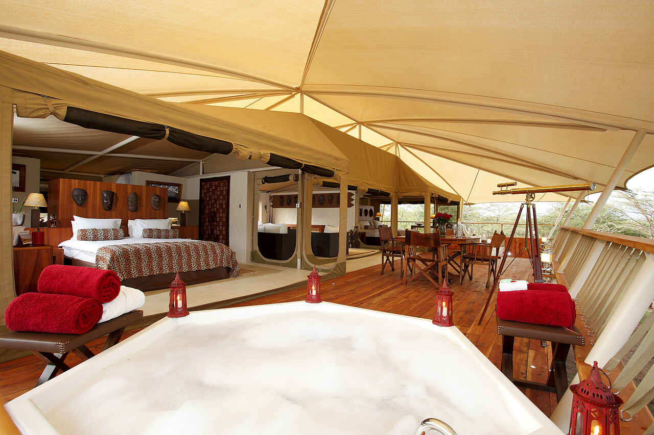 Die Zelte befinden sich auf einem gemeinsamen Areal, sind aber eigenstehend und durch Pfade zu Fuß erreichbar. Jedes Zelt besitzt ein Doppelbett, Sonnenliegen sowie einen Schreib- und Esstisch. Das Holzdeck lässt sich zu drei Seiten öffnen, um einen Panoramablick mit einem bereitstehenden Fernglas auf die Savanne mit deren Tieren zu gewährleisten. Die Zelte sind mit eigenen Waschbecken mit warmen Wasser und Toiletten ausgestattet. Duschen befinden sich im Innen- sowie Außenbereich. Mit inbegriffen ist ein 24-h Butler-Service, Stromanschlüsse und W-LAN.