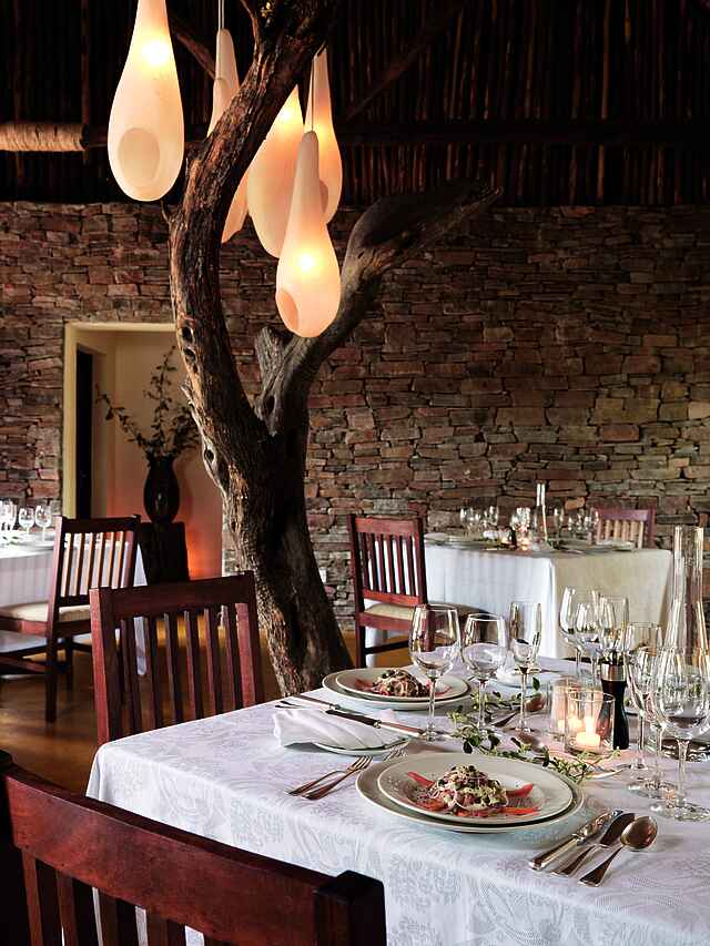 Exklusive Küche im Restaurant mit Blick auf die Savanne und abwechslungsreichen Menüs á la Carte. Bei Wunsch kann auch im Zelt gespeist werden. Inkludiert sind alle nicht-alkoholischen Getränke, Biere, Weine und einige Spirituosen. Ein Weinkeller, welcher Wein aus Afrika, Europa und USA bietet, befindet sich ein unter dem Restaurant.