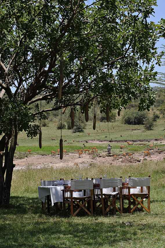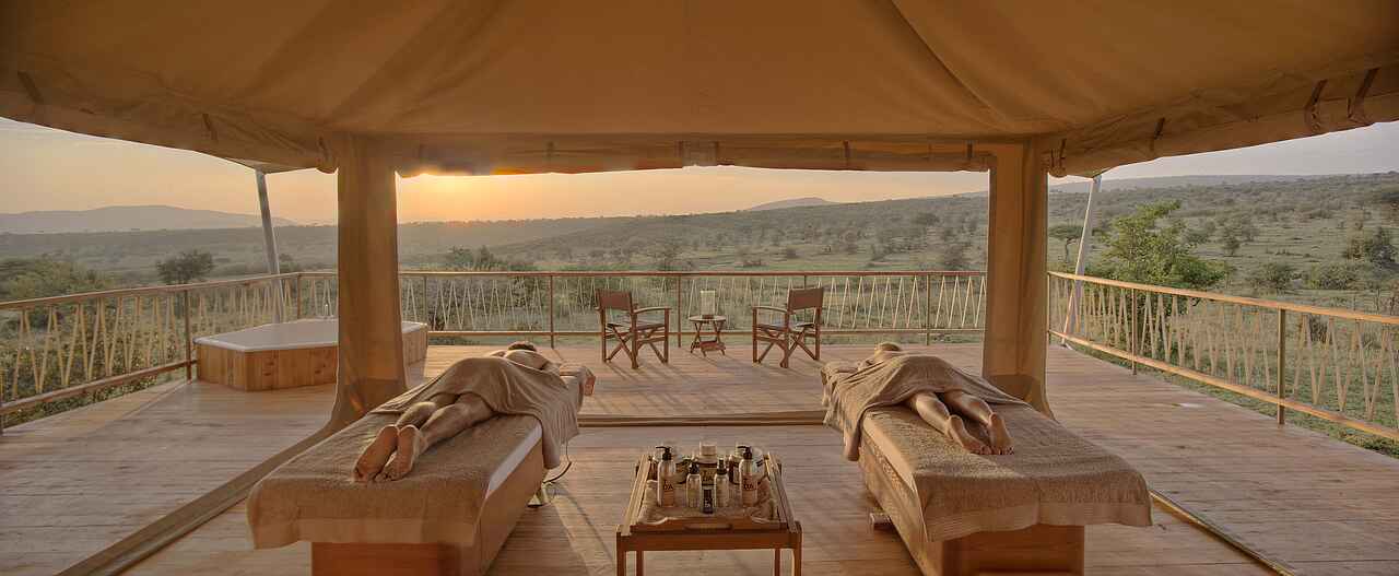 Die Mara Bushtops Camp bietet neben einer 100m² großen Holzterasse auch einen Spa- und Wellnessbereich mit Blick auf die Savanne. Jedes Zelt verfügt neben einer Holzterrasse, einen eingesenktem Jacuzzi. Besonders sind die Tiere, die wegen der Mineralien und einer Wasserstelle sehr nah ans Camp kommen und von dort aus gut beobachetet werden können.