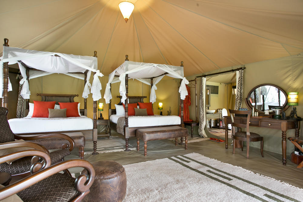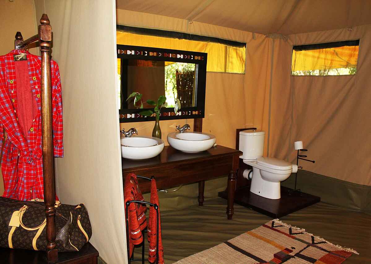 Eine hohe Zeltkonstruktion aus hellem Kanvas spannt sich über das gesamte Gästezelt, darunter liegen die Schlafzimmer und das darin integrierte zweite Zelt mit dem Badezimmer. Im Schlafzimmer stehen ein King Size oder zwei Queen Size Betten mit Moskitonetzen, ein Schreibtisch, zwei Lounger-Sessel mit Tischchen und einen Hängeschrank mit Maasai Bademänteln bestückt. Die massiven Holzmöbel wirken dezent aber ein wenig altmodisch, der Boden ist ebenerdig auf Sand, bedeckt mit einer dicken Zeltplane, die mit gewebten Naturteppichen ausgelegt ist.