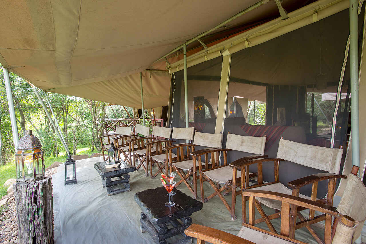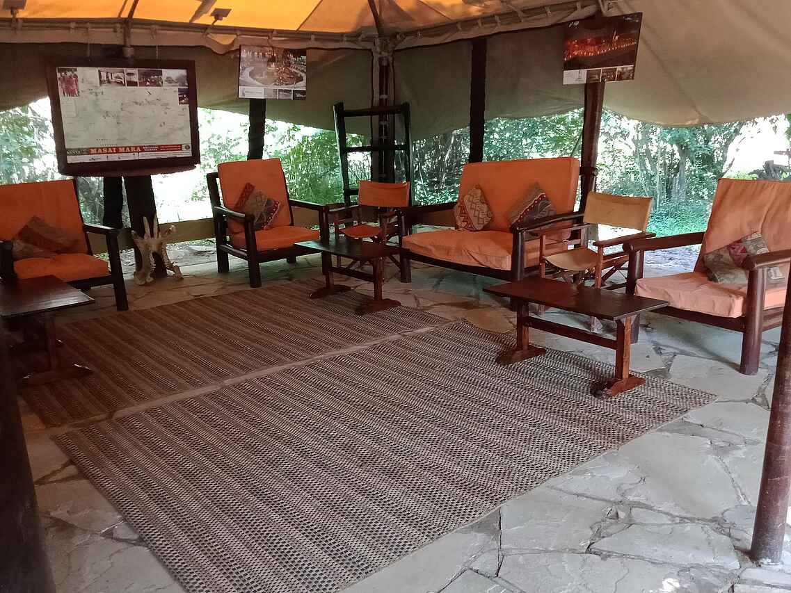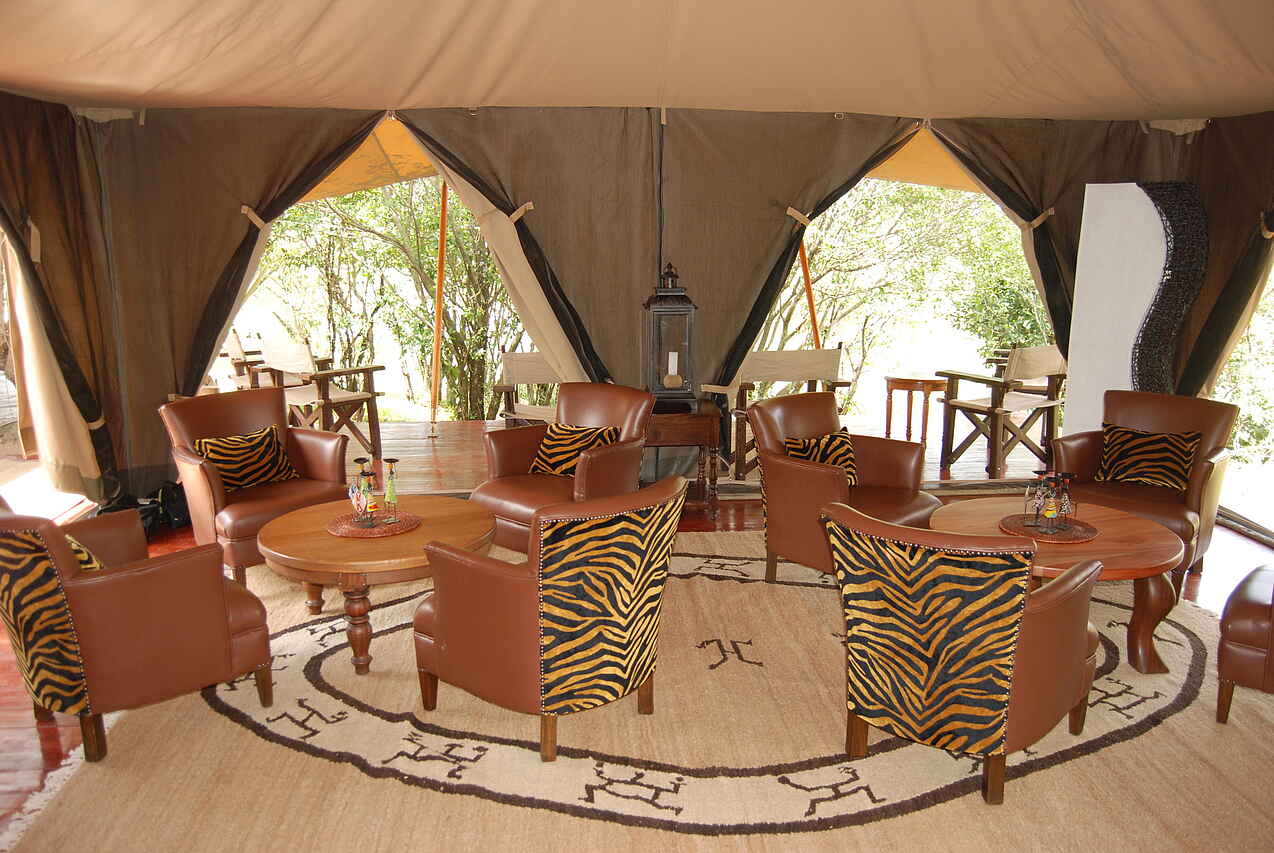 Im dichten Auwald am Zusammenfluss des Talek und Mara Rivers bilden drei Zeltkonstruktionen das Mara Ngenche Camp. Unter einem riesigen Canvas-Dach vereint liegt der Hauptbereich des Camps: ein Restaurant-Zelt mit schlichten Tischen und Stühle, die Lounge mit schweren Ledersesseln und -couches dekoriert mit afrikanischen Stoffen und Maasai-Kunst an den Wänden und das Bar-Zelt mit verschiedenen Sitzgelegenheiten und einer erhöhten Holzterrasse mit Director Chairs für einen weiten Ausblick über den Busch.