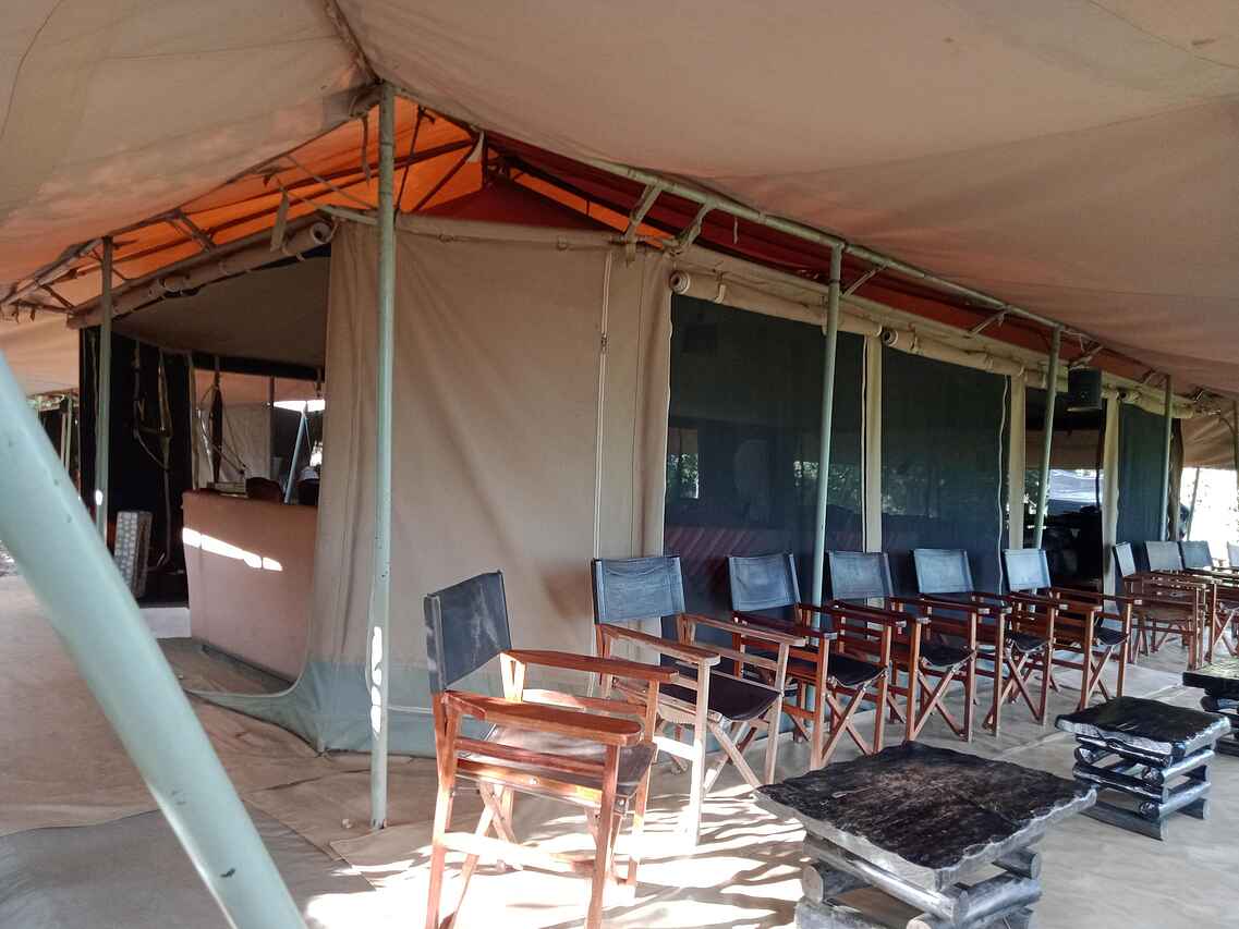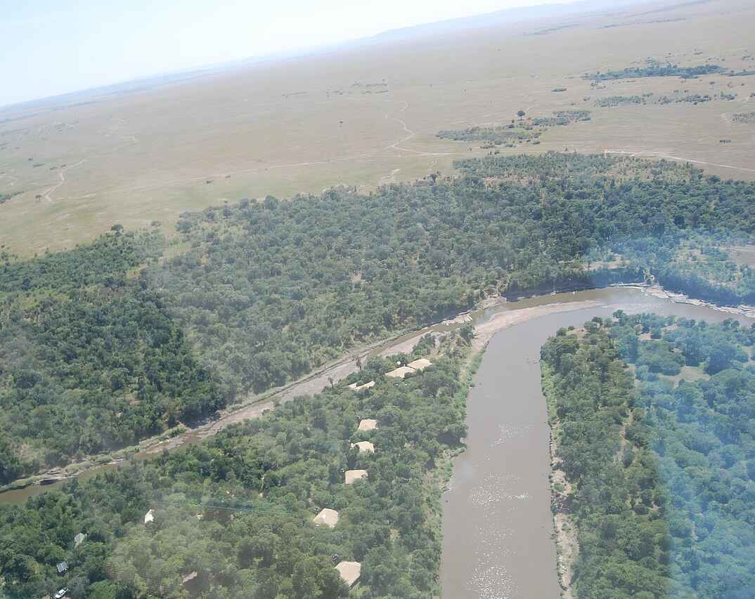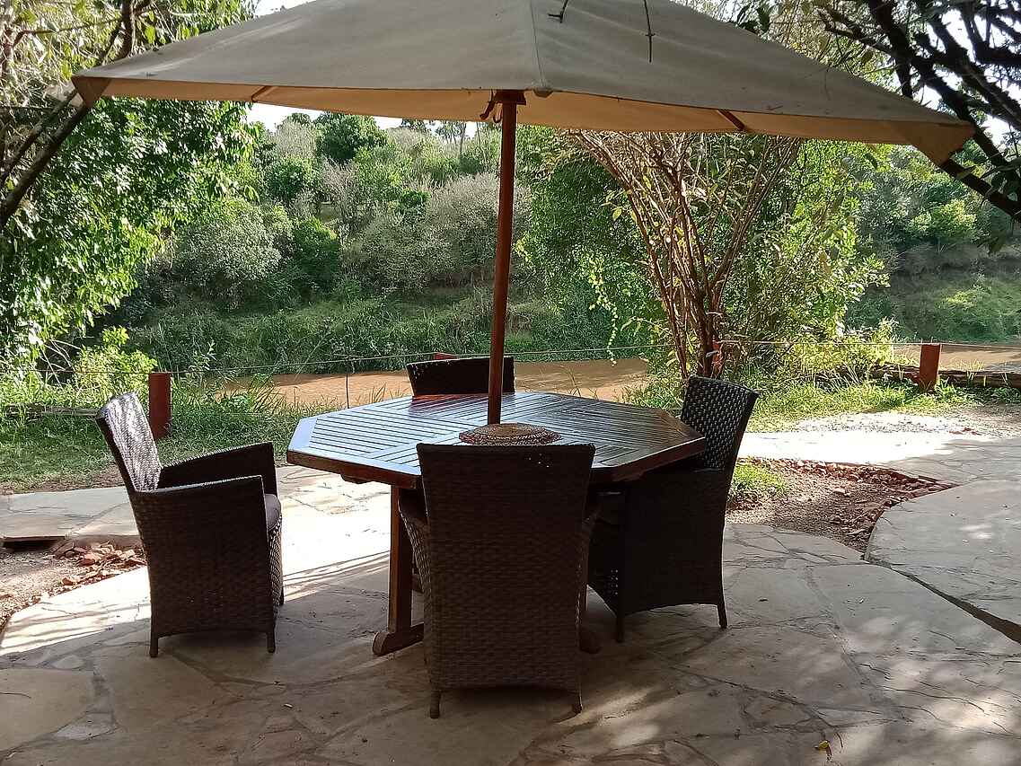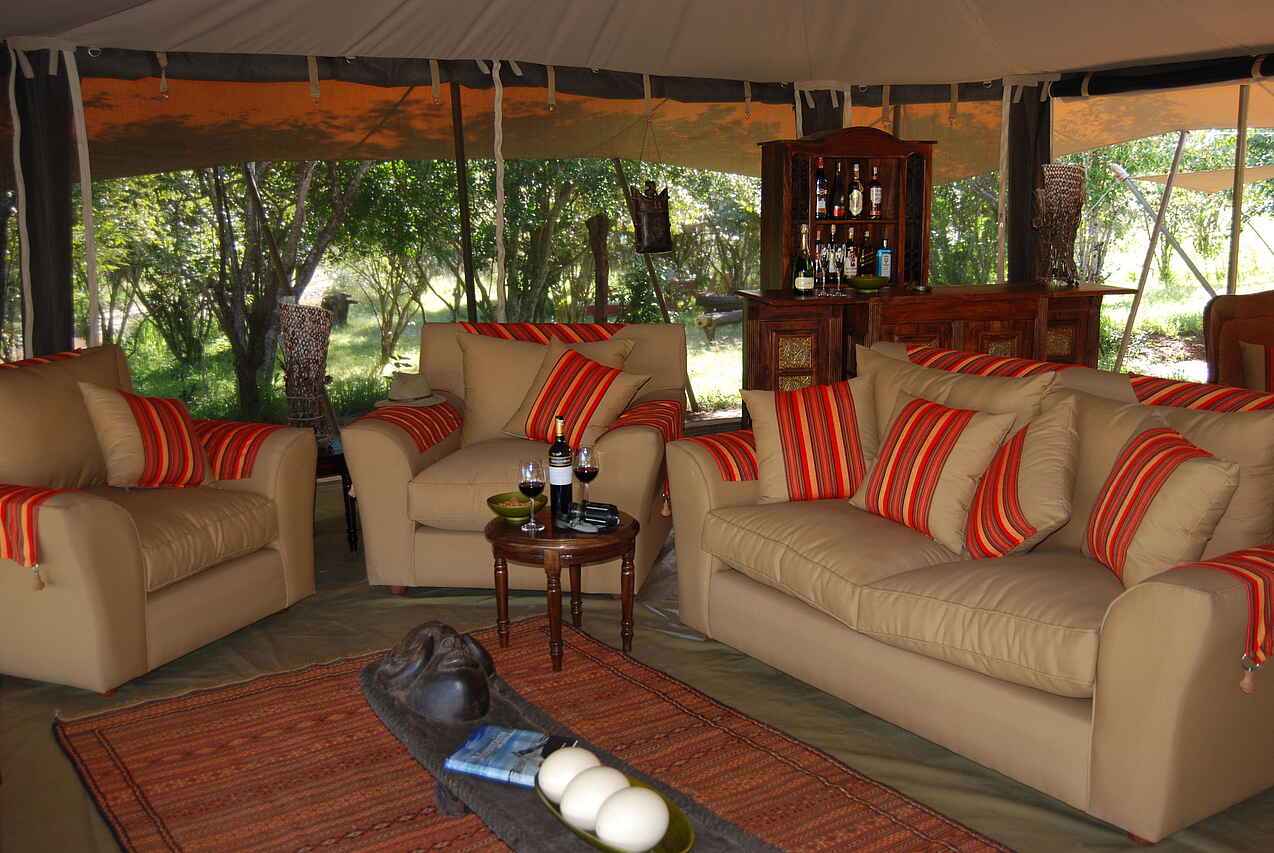 Im dichten Auwald am Zusammenfluss des Talek und Mara Rivers bilden drei Zeltkonstruktionen das Mara Ngenche Camp. Unter einem riesigen Canvas-Dach vereint liegt der Hauptbereich des Camps: ein Restaurant-Zelt mit schlichten Tischen und Stühle, die Lounge mit schweren Ledersesseln und -couches dekoriert mit afrikanischen Stoffen und Maasai-Kunst an den Wänden und das Bar-Zelt mit verschiedenen Sitzgelegenheiten und einer erhöhten Holzterrasse mit Director Chairs für einen weiten Ausblick über den Busch.