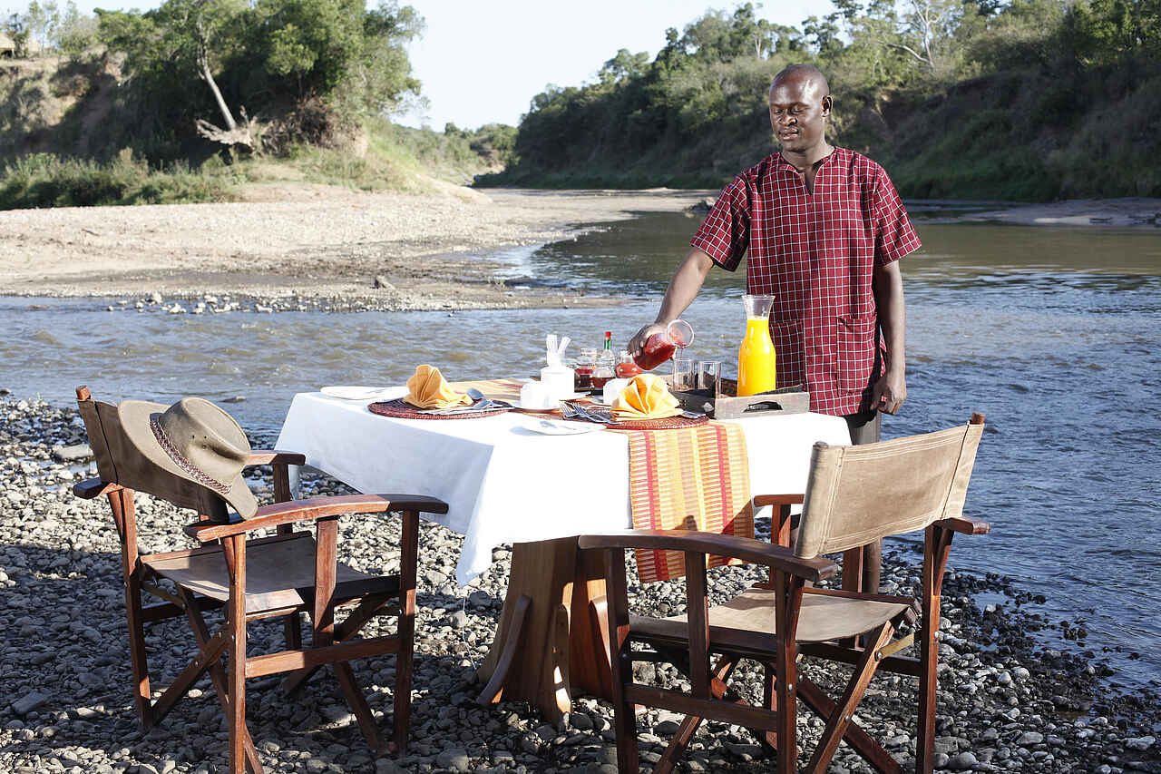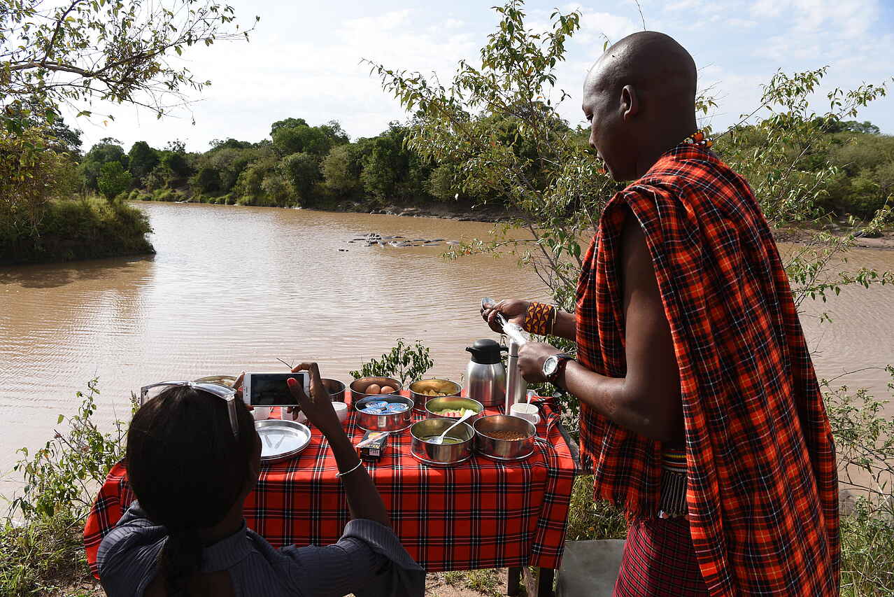 Die Gäste können das Frühstück entweder in Büffetform im Restaurant einnehmen, oder aber, wie im Mara Ngenche Camp üblich, frühstmöglich mit einem gepackten Frühstück auf Safari gehen. Nach einer ersten Rundfahrt bauen die Guides an einem besonderen Ort in der Mara Tische und Stühle auf und servieren: Früchte, Joghurt, Cerealien, gekochte Eier, Speck, Baked Beans und Brot mit Kaffee, Tee und Fruchtsaft.