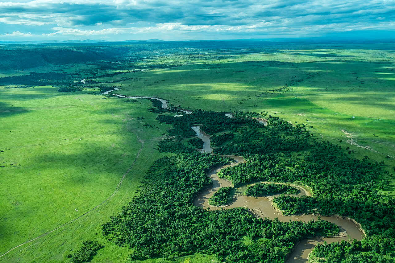 Das Mara Plains Camp liegt in der Nähe des Berührungspunkts des Mara National Reserve, der Mara North Conservancy und Olare-Motorogi Conservancy, zu der es dann auch tatsächlich gehört. Größer gefasst liegt es im Südwesten Kenias an der Grenze zu Tansania und der Serengeti. Das Camp duckt sich unauffällig unter die Bäume entlang des Flussufers des Ntiakitiak River und verschmilzt nahezu mit der Landschaft. Außerhalb des Galeriewaldes öffnet sich die Landschaft in ihre unendliche Weite, genauso, wie man es sich vorstellt.