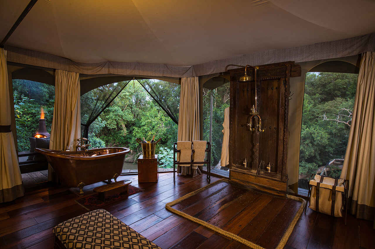 En-suite-Bad mit Blickschutz durch einen großen Vorhang. Das Bad ist ausgestattet mit einer Spültoilette, Dusche, Kupferbadewanne und Doppelwaschbecken. Fließend warmes und kaltes Wasser, Seife, Shampoo, Conditioner und Lotion sind ebenfalls vorhanden. Das Stromnetz unterstützt keine Haartrockner, Rasierapparate oder andere Geräte mit hoher Wattzahl, das Camp stellt aber einen Niederspannungshaartrockner bereit.