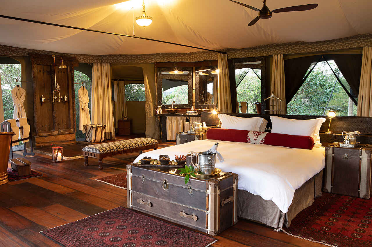 Alle 5 Gästezelte sind auf hölzernen Plattformen errichtet und außerordentlich großzügig gestaltet mit Akzenten aus Ostafrikas reicher Safarigeschichte. Sie bestehen aus hochwertigem, festen Segeltuchstoff und jedes der Luxuszelte misst rund 70 Quadratmeter. Alle verfügen über eine große private Veranda mit Tisch, Stühlen und Lounge-Sofa. Die vielen "Fenster" aus Moskitonetzen sorgen für eine helle und freundliche Atmosphäre. Die Zelte haben wahlweise Blick auf die Masai Mara oder die Flusslandschaft. Allesamt sind sie ausgestattet mit einem großen Bett (Doppelbett oder Twin-Bett), Schreibtisch mit Stuhl, Ankleidebereich sowie einer kleinen Lounge. Außerdem: Minibar mit Getränken nach Wahl, Tee- und Kaffeestation, Wlan, Deckenventilator, Safe, Wäscheservice. Sportliches Plus: In jedem Zelt gibt es Yogamatten, leichte Gewichte und Übungsbänder aus Latex.