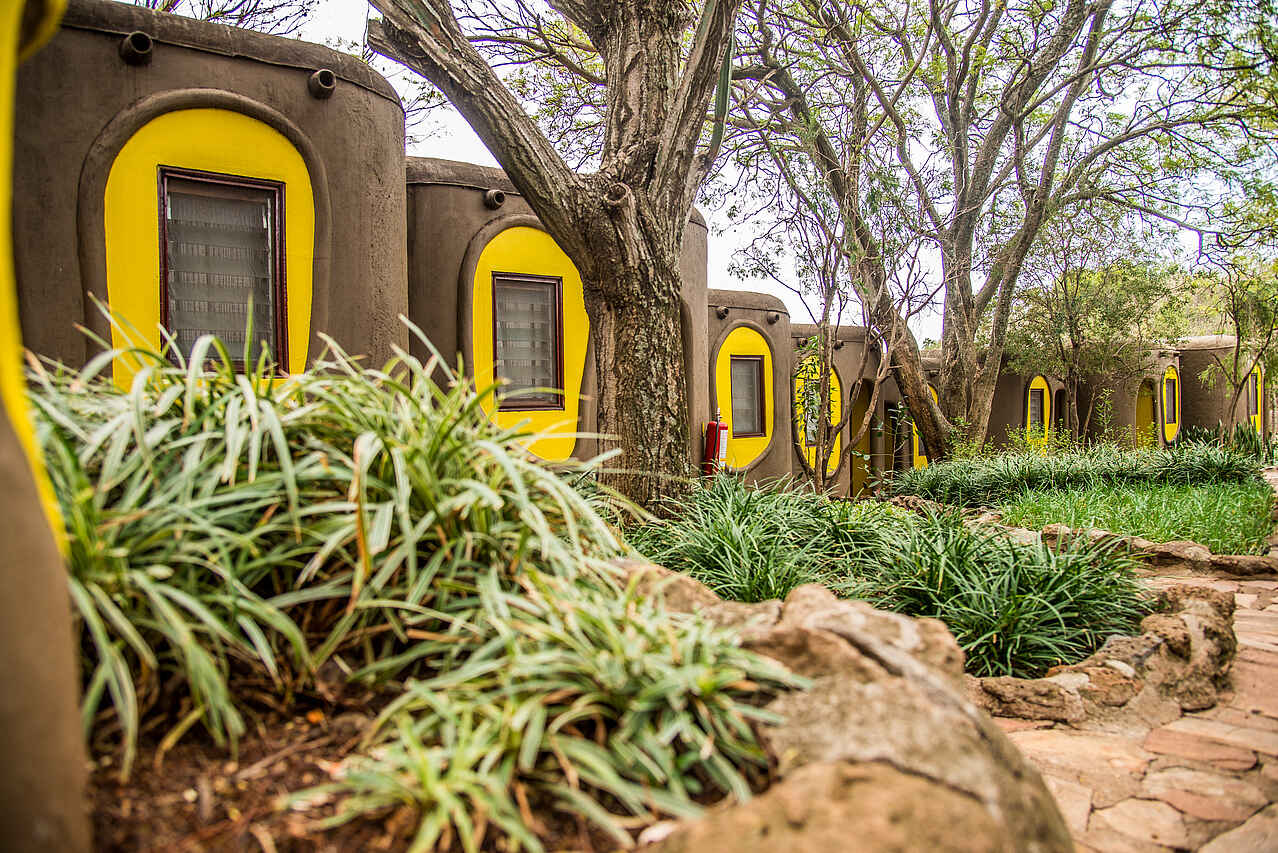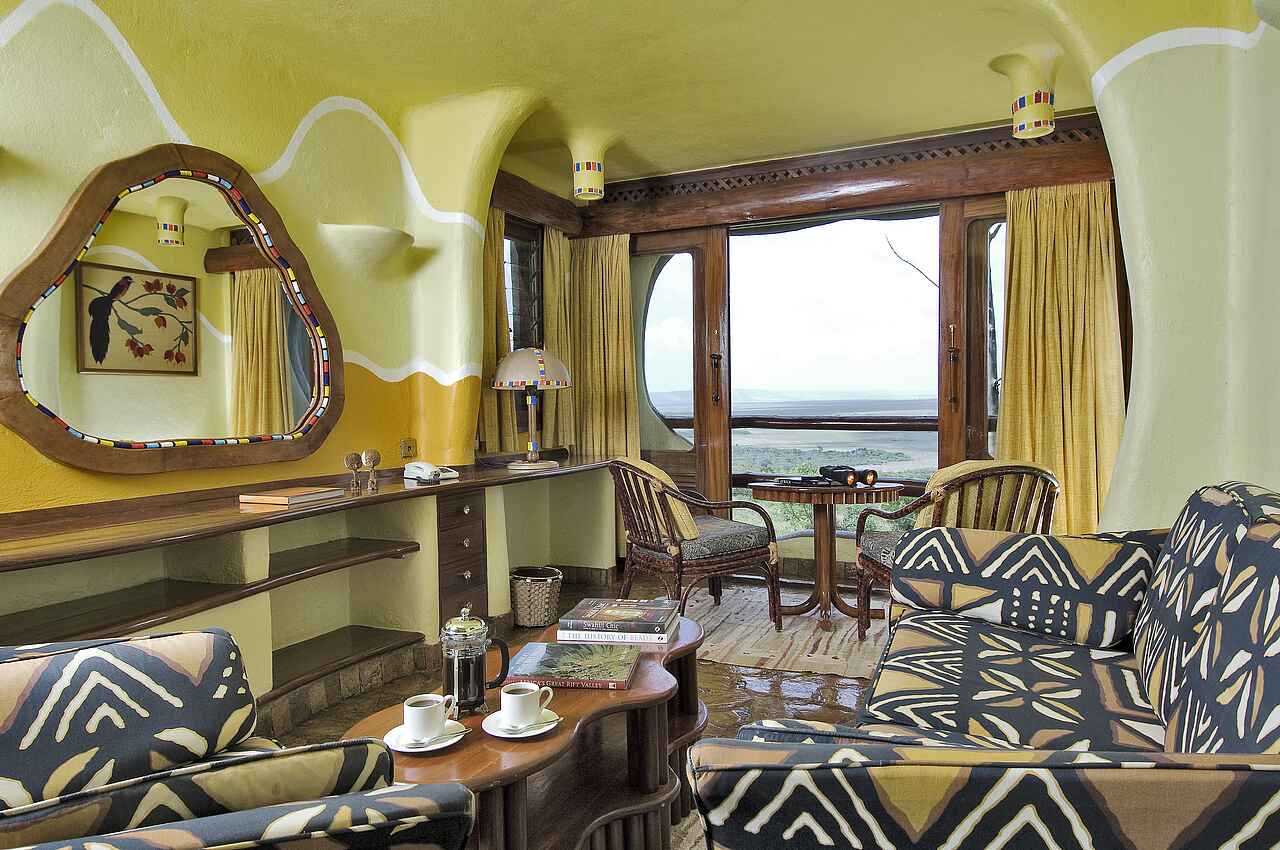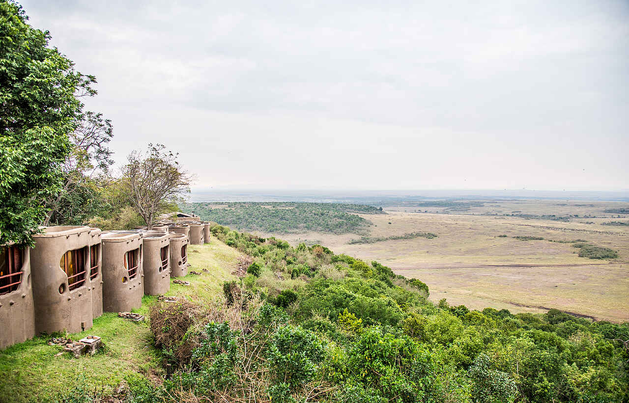 Die Gästezimmer liegen in einzelnen kleinen Bungalows, die äußerlich wie Lehmhütten gestaltet in Reihe entlang der Hügelkante stehen,mit markant gelber Bemalung. Sie werden Rückwärtig über einen Steinpfad erreicht. Die Zimmer sind ebenfalls in hellen Gelbtönen gehalten mit dunkel- bis rehbraunen Holzmöbeln. Es gibt entweder ein den Raum dominierendes Kingsize-Bett oder Twin-Betten, Deckenventilator, Telefon, WiFi, Moskito-Netz. Eine Wandtheke dient als Schreibtisch, zum kleinen Privatbalkon hin ein kleine Sitzgruppe mit Holzlehnstuhl und Couchtischen. Der Balkon mit Schiebetür, Holzläden und Vorhängen, mit Blick auf die Massai Mara. Bad en-suite mit terracotta-farbenen Fliesen und weißen Wandkacheln, ein kleines Waschbecken, Wasserklosett, Dusche und Spiegel. Die Suite deutlich größer mit eigener kleiner Lounge.
