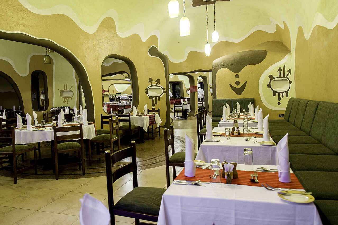 Vollpension, morgens und mittags Buffett, internationale Küche. Der Speiseraum ist sehr verwunden, kleinteilig und hell, mit mehreren zusammenhängenden Räumen, und denen die Tische verteilt stehen. Buschdinner und separates Dinner auf der Terrasse möglich. Vegetarisch, Koscher, glutenfrei nach Anmeldung. Busch-Barbeque und Hippo Pool Breakfast am Mara River zubuchbar.