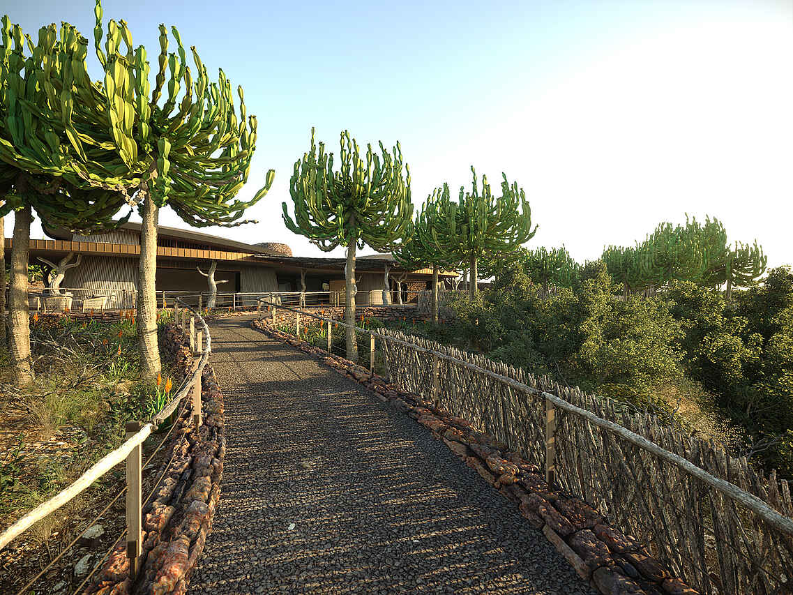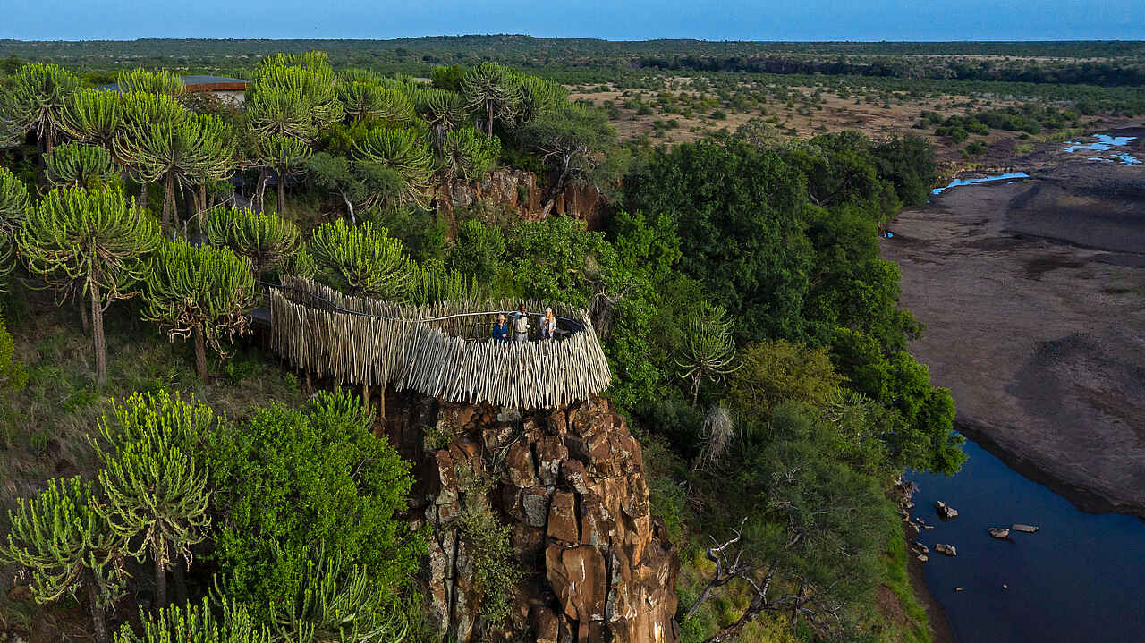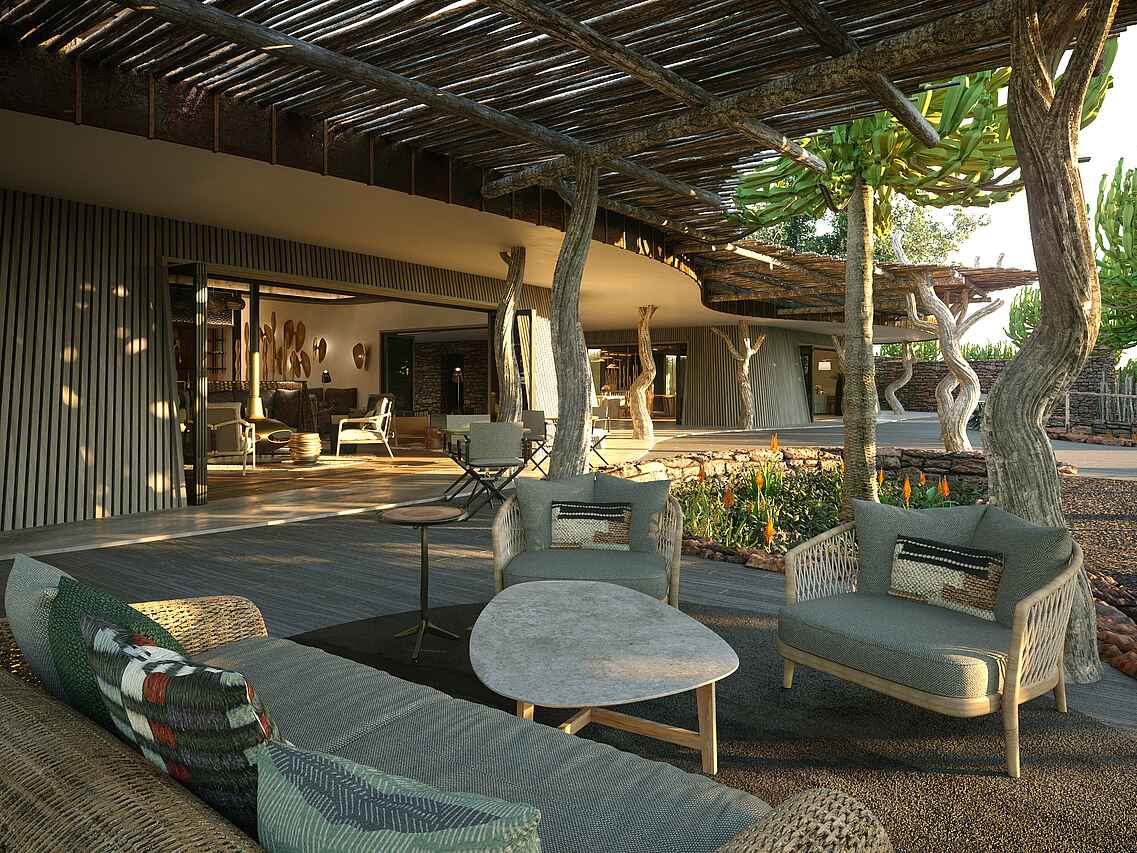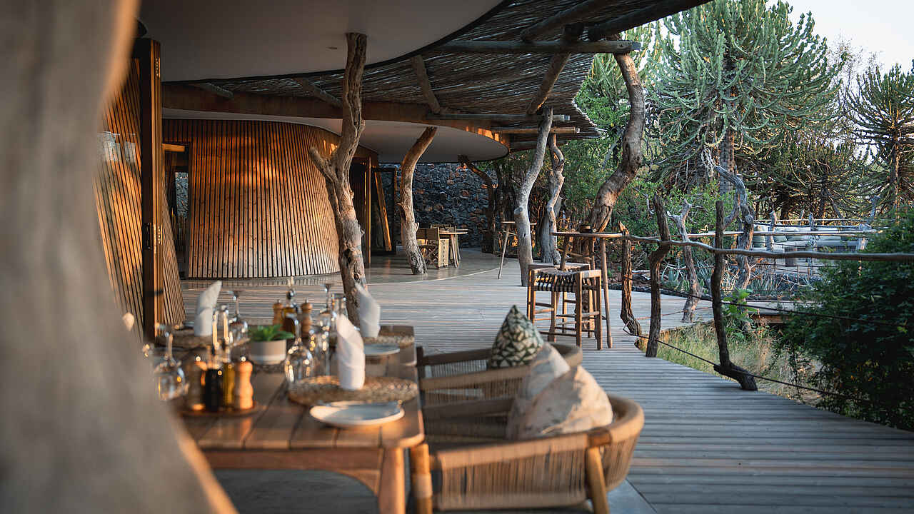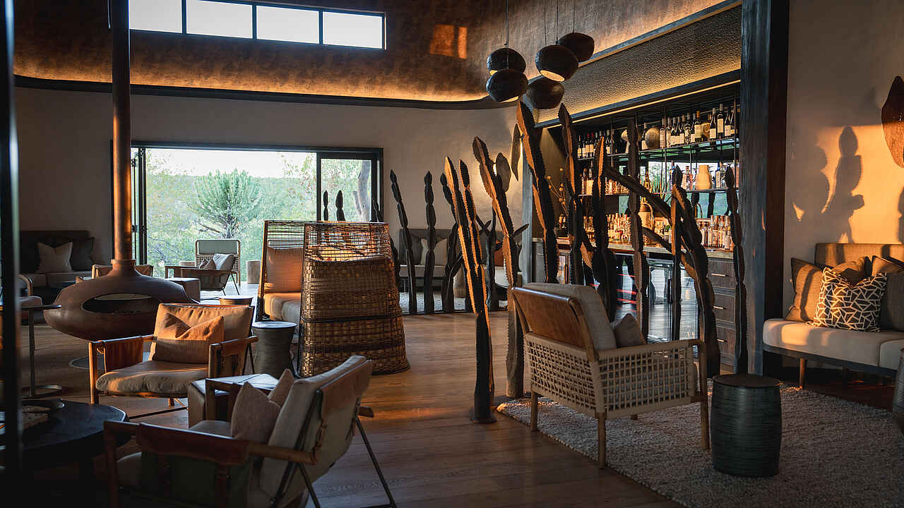 Das Hauptgebäude ist bei der Ankunft an seinen geschwungenen Mauern erkennbar. Ein kurzer Weg führt an einem kleinen Teich und dem Souvenirshop vorbei in die Lounge, die Bar und den Speisesaal. Alle Räume sind von leicht gewölbten Holzdecken mit offenen Balken geprägt. In der Lounge sind Sessel und Sofas um einen runden Kamin angeordnet. Der Speisesaal öffnet sich zu einer großzügigen Terrasse mit Sitzbereichen und Feuerstelle, auf der Mahlzeiten bei passendem Wetter im Freien serviert werden. Von dort führen Wege zu zwei erhöhten Aussichtspunkten mit Blick auf das Flussbett des Majale River.